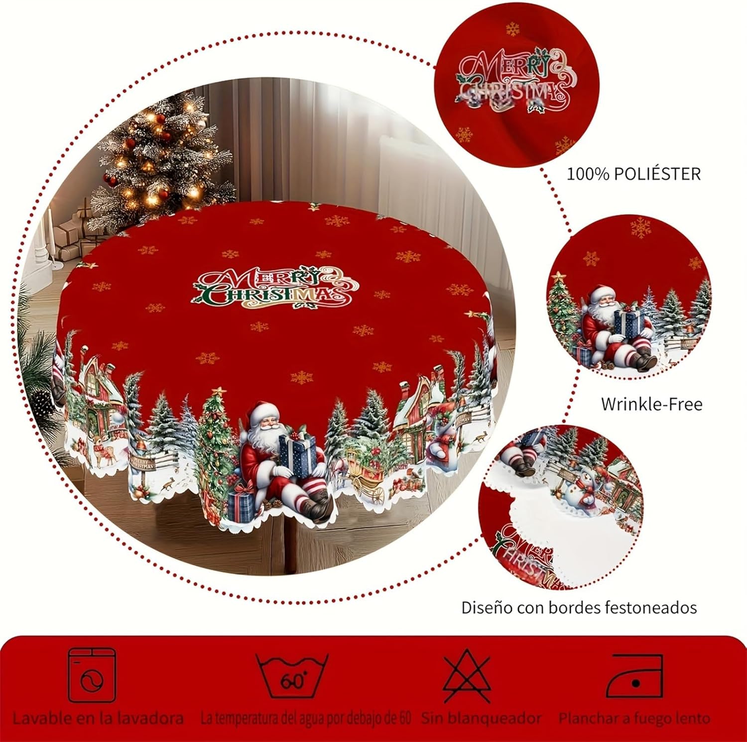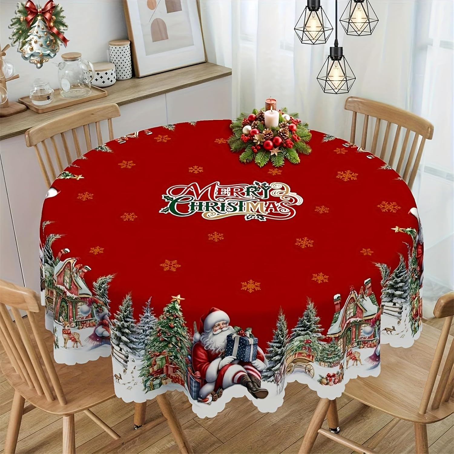【Unique Design】Christmas Tablecloth is crafted by professional designers, featuring vibrant colors and distinctive patterned prints. Its edges undergo machine-embossed finishing, delivering a highly creative home decor solution 【Premium Polyester Material】Crafted from high-quality wrinkle-resistant polyester fabric, the Christmas Tablecloth is built to last, enduring multiple holiday seasons. Its durable construction ensures vibrant colors and crisp patterns remain intact even after repeated use 【Versatile Usage】The Christmas Tablecloth adds a pop of color to your home decor. Perfect for everyday kitchen dining, Christmas, Thanksgiving, housewarming celebrations, themed party decorations, holiday festivities, and special event table settings 【Dimensions】The round tablecloth measures 60 inches (152 cm) in diameter, while the rectangular version is 86 inches (220 cm) × 60 inches (152 cm). The Joyful Festive Classic Christmas Tablecloth fits most round and rectangular dining tables. Its seamless design offers simple elegance, effortlessly elevating your table's aesthetic appeal 【Easy Care】This washable tablecloth resists fading and can be cleaned by hand or machine. Simply wipe with a damp sponge or cloth for effortless, time-saving maintenance