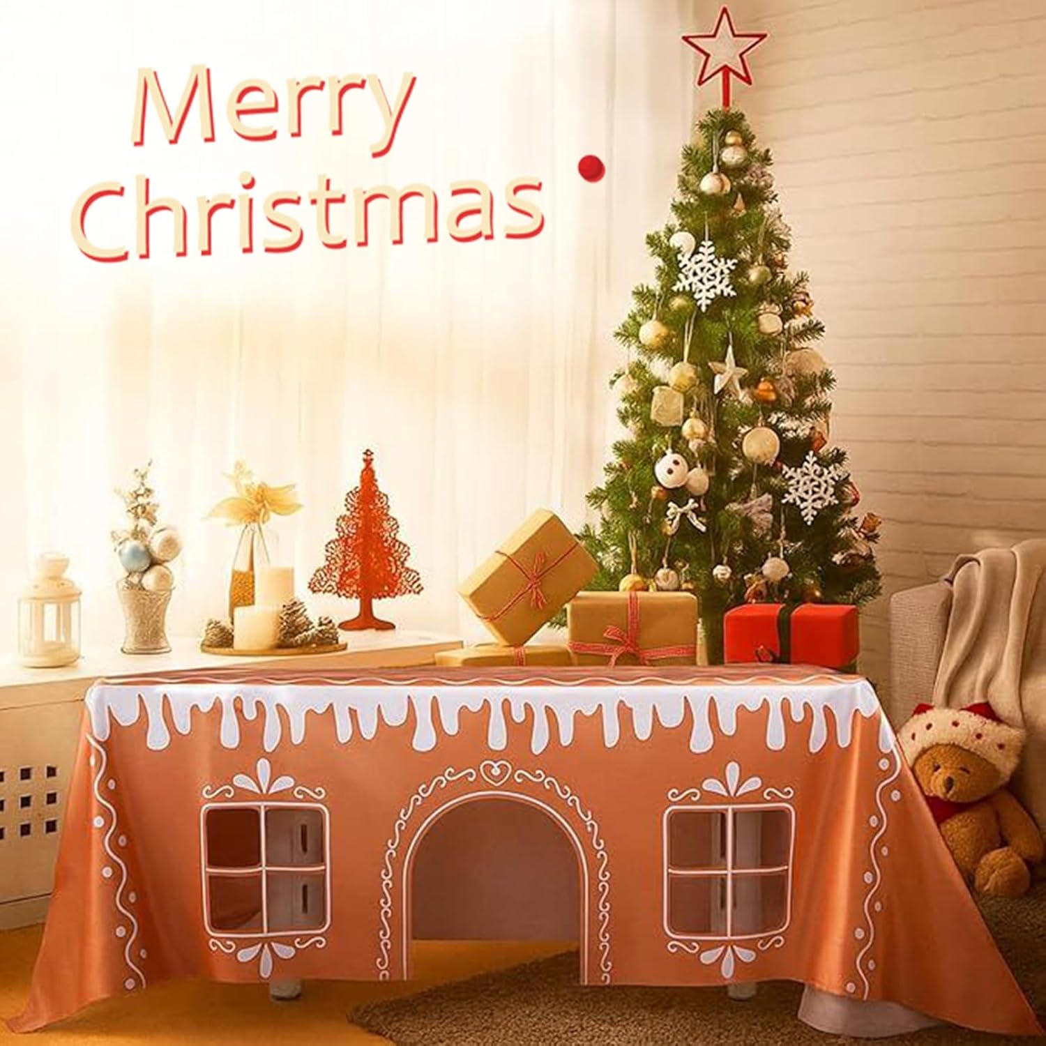 Crea un'Atmosfera : La tovaglia natalizia valorizza gli spazi da pranzo con il suo vibrante design di case di pan di 3D e i classici motivi di caramelle rosso-verde, creando un centro tavola allegro per le in famiglia e le feste natalizie mentre favorisce calore e durante la stagione, rendendo ogni incontro più memorabile e piacevole. Scena Multiuso : Realizzata con una forma rettangolare, questa tovaglia natalizia si adatta facilmente a tavoli da pranzo e tavolini da caffè, migliorando l'estetica di pasti formali o festività rilassate mentre si trasforma in una ambientazione deliziosa per le attività dei bambini in ambienti festivi allegri, perfetta per aggiungere un tocco di gioia e vivacità alle vostre occasioni speciali con questo prodotto versatile. Durabilità Elevata e Pratica: Costruita con materiali solidi e durevoli, questa tovaglia natalizia è ideale per un uso festivo prolungato, resistendo all'acqua e alle macchie mentre conserva il suo aspetto originale, arricchendo la tua tavola con una manutenzione minima richiesta e un look elegante che dura nel , perfetta per occasioni speciali e facile da pulire. Hub Esplorazione Coinvolgente: Questo tovagliolo natalizio rettangolare integra porte ritagliate interattive e aperture che invitano i bambini a giocare e scoprire in ambienti domestici. Promuove le connessioni familiari attraverso l'esplorazione condivisa e aggiunge godimento pet-friendly alle celebrazioni delle feste, come Natale e riunioni. Il design incoraggia il movimento e la curiosità, offrendo un'attività pre-cena dinamica che unisce genitori, figli e animali in momenti di gioia e divert Soluzione Dinamica per Riunioni: La tovaglia per le feste si regola facilmente a varie dimensioni del tavolo, supportando riunioni di tutte le misure da pasti intimi con amici stretti a feste celebrative più grandi, assicurando praticità e stile in ogni occasione. Grazie alla sua flessibilità, questa tovaglia natalizia si adatta a tavoli di diverse forme e grandezze, offrendo una copertura uniforme e elegante che valorizza l'ambiente dining durante le celebrazioni. Il design adattabile permette