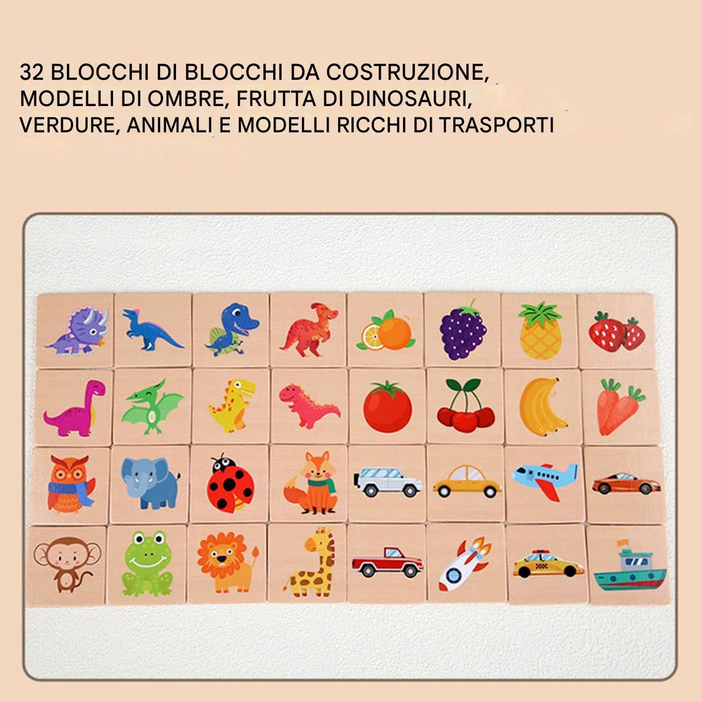 Avventura Tematica: Illustrazioni tematiche diversificate e 32 pezzi colorati espandono il vocabolario attraverso contesti reali, creando un'esperienza educativa piacevole Organizzazione Giocattoli: Favorisce abitudini organizzative mantenendo i giocattoli ordinati e protetti. Scatola in legno resistente crea un ambiente di gioco coinvolgente con materiali sicuri per divertimento educativo. Apprendimento Associativo: Il design di abbinamento immagini-incoraggia il potenziamento cognitivo e lo sviluppo delle capacità osservative, offrendo strumento di apprendimento affidabile che rafforza lo sviluppo visivo Allenamento Coordinazione: Migliora capacità motorie fini e coordinazione occhio-mano con rompicapi logici a incastri precisi, progettati per un'esperienza di gioco interattiva ed nello sviluppo delle abilità fondamentali Apprendimento divertente: La struttura a domande e risposte incoraggia la comunicazione verbale favorendo esperienze educative interattive che consolidano il tra genitori e bambini durante il gioco di abbinamento forme