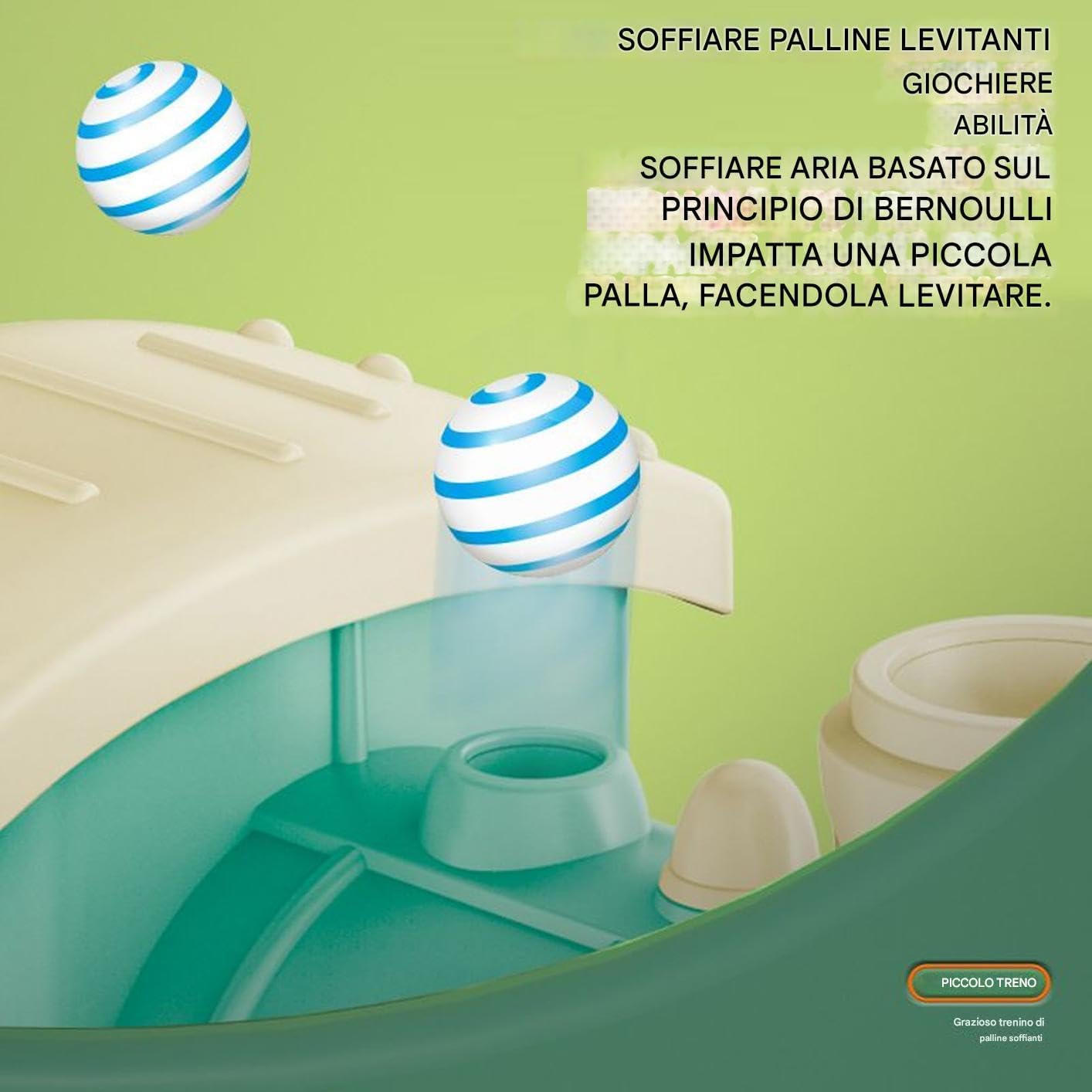 Qualità e Sicurezza: Prodotto con materiali certificati sicuri, garantisce superfici lisce e inodori, creando un'esperienza di gioco protetta per bambini che soddisfa requisiti essenziali Colori Vivaci e :Il trenino giocattolo presenta tonalità vivaci e un design adorabile, catturando l'attenzione dei bambini con aspetto giocoso mentre stimola il gioco simbolico e la creatività attraverso dettagli incantevoli. Sviluppo Abilità:Promuove lo sviluppo sensoriale coinvolgendo i bambini con trenini interattivi, che esercitano le capacità percettive e stimolano naturalmente l'apprendimento attraverso il gioco esplorativo, rafforzando le competenze pratiche in modo divertente ed educativo Intrattenimento Completo:Combinazione di scivolo, effetto spray, tecnologia levitante, luci e suoni per esperienze di gioco diversificate che rafforzano le capacità di esplorazione e supportano la crescita attraverso l'interazione sensoriale dinamica e multifunzionale. Esperienza Interattiva: Il giocattolo utilizza un meccanismo di levitazione unico: il d'aria muove la sfera, offrendo un modo coinvolgente per esplorare i principi scientifici e stimolare la curiosità dei bambini attraverso il gioco pratico.