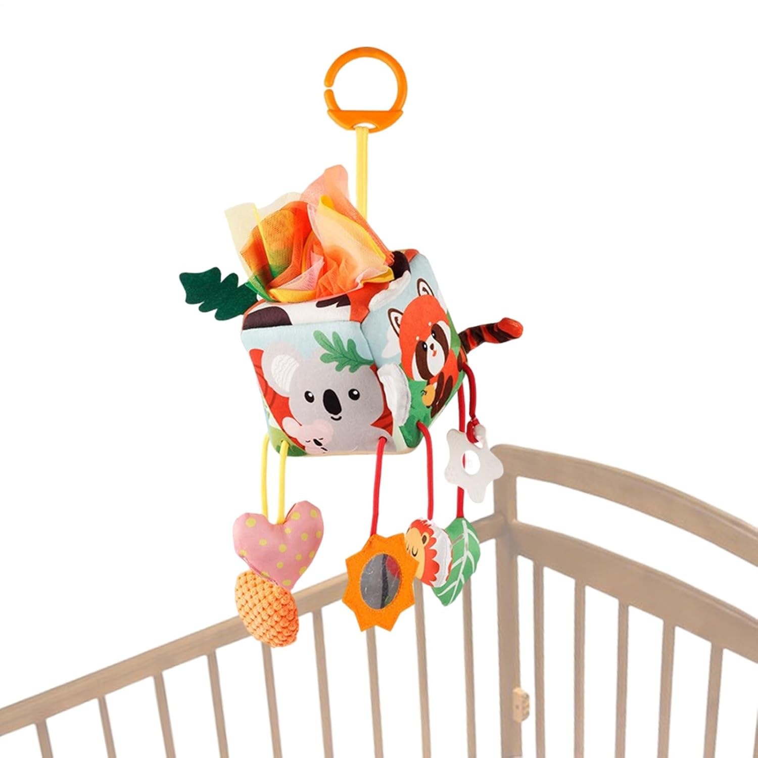 Fissaggio intuitivo:Meccanismo a fibbia antiscivolo per una installazione sicura e senza , elimina il rischio di scivolamento garantendo stabilità ottimale durante le passeggiate senza necessità di accessori. Compatibilità Estesa: Opzioni di altezza e angolazione regolabili supportano attività ludiche e di riposo, integrandosi perfettamente con passeggini, culle o spondine del letto in ambienti diversi Riduzione del Pianto: Il suono delicato attira l'attenzione del neonato alleviando efficacemente il pianto, creando un ambiente tranquillo per un sonno mentre stimola lo sviluppo sensoriale attraverso la rotazione dinamica senza sovraccaricare i sensi delicati. Esplorazione Sensoriale: Fantasie ad alto contrasto con sonaglio piacevole rafforzano la concentrazione visiva e contribuiscono al sano sviluppo uditivo nei bambini. Affidabilità Totale: Assenza di componenti pericolosi unita a una superficie delicata e connessioni solide, rende questo giocattolo da passeggino una scelta sicura per bambini che amano mordicchiare e afferrare durante le avventure giornaliere