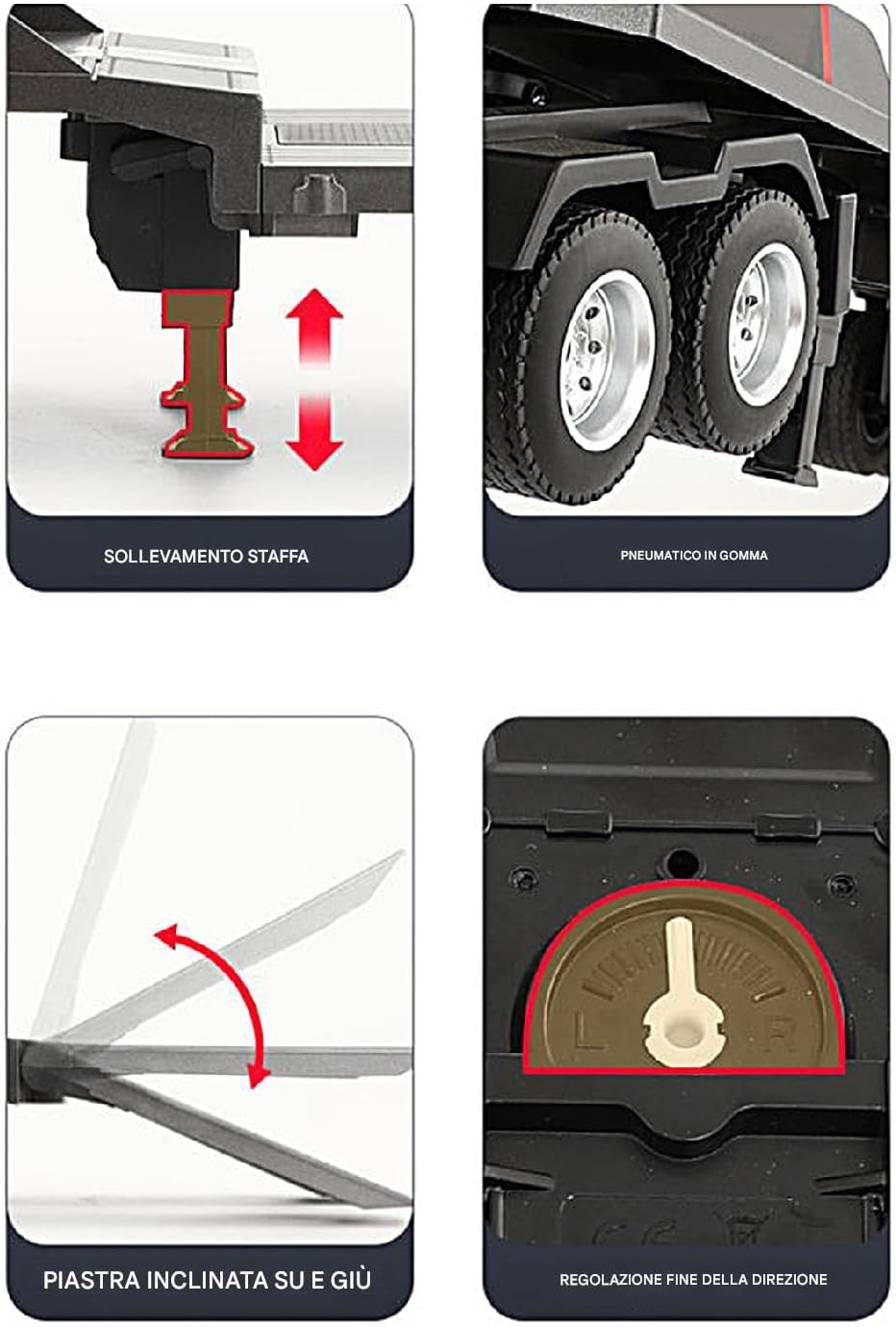 Scatena la creatività: espandi i tuoi orizzonti con il nostro semirimorchio giocattolo telecomandato, dotato di pianale da 83 cm che può trainare vari veicoli da costruzione come escavatori, bulldozer e autocarri con cassone ribaltabile Utilizzo multiscenario: fornendo un'esperienza di guida più autentica, questo semirimorchio telecomandato fornisce svolte in avanti/indietro e di 270 gradi a sinistra/destra, complete di effetti sonori e luminosi. Il a pianale multiuso consente più avventure, migliorando l'interattività per tempi di gioco più lunghi Materiale ABS solido: rilascia più eccitazione per i bambini con il nostro giocattolo per semirimorchi telecomandato. Dotato di un design sorprendente e robusto, realizzato con materiali di buona qualità, questo giocattolo promette un di gioco divertente e coinvolgente Esperienza di gioco migliorata: con il nostro semirimorchio telecomandato, ogni controller è programmato su un singolo veicolo, consentendo a più giocatori di unirsi senza conflitti di segnale. Goditi un divertimento competitivo senza interruzioni, sempre e ovunque Regalo delizioso: il semirimorchio telecomandato promuove le abilità pratiche stimolando la creatività, rendendolo una scelta adatta per il gioco interattivo e un regalo meraviglioso per le occasioni speciali dei bambini