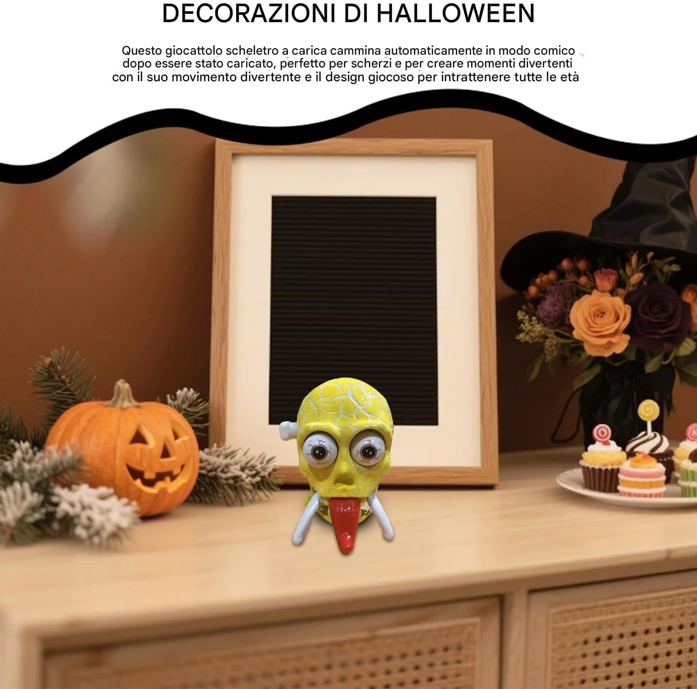Creatività Quotidiana:Ideale come accessorio zaino accattivante, decorazione scrivania o elemento decorativo per chiavi, unisce divertimento e originalità alle routine quotidiane con un tocco di allegria immediato. Compagno di Scherzi: Lo scheletro carica avanza con passo esilarante dopo il caricamento, creando risate grazie al movimento e stile interattivo. Ideale per intrattenimento leggero e complicità scherzosa. Struttura : Materiali di alta qualità conferiscono al giocattolo scheletro meccanico una vita utile estesa e resistenza all'usura per godimento duraturo Estetica Spettrale: Dettagli realistici di teschio e lingua per un design spaventoso unico. Eccellente come oggetto da collezione o decorazione per feste e occasioni speciali. Momento Indimenticabile: Questo scheletro caricabile a manovella regala risate durante le festività, pensato per creare ricordi felici con persone care, movimento che sorprende piacevolmente chi lo riceve