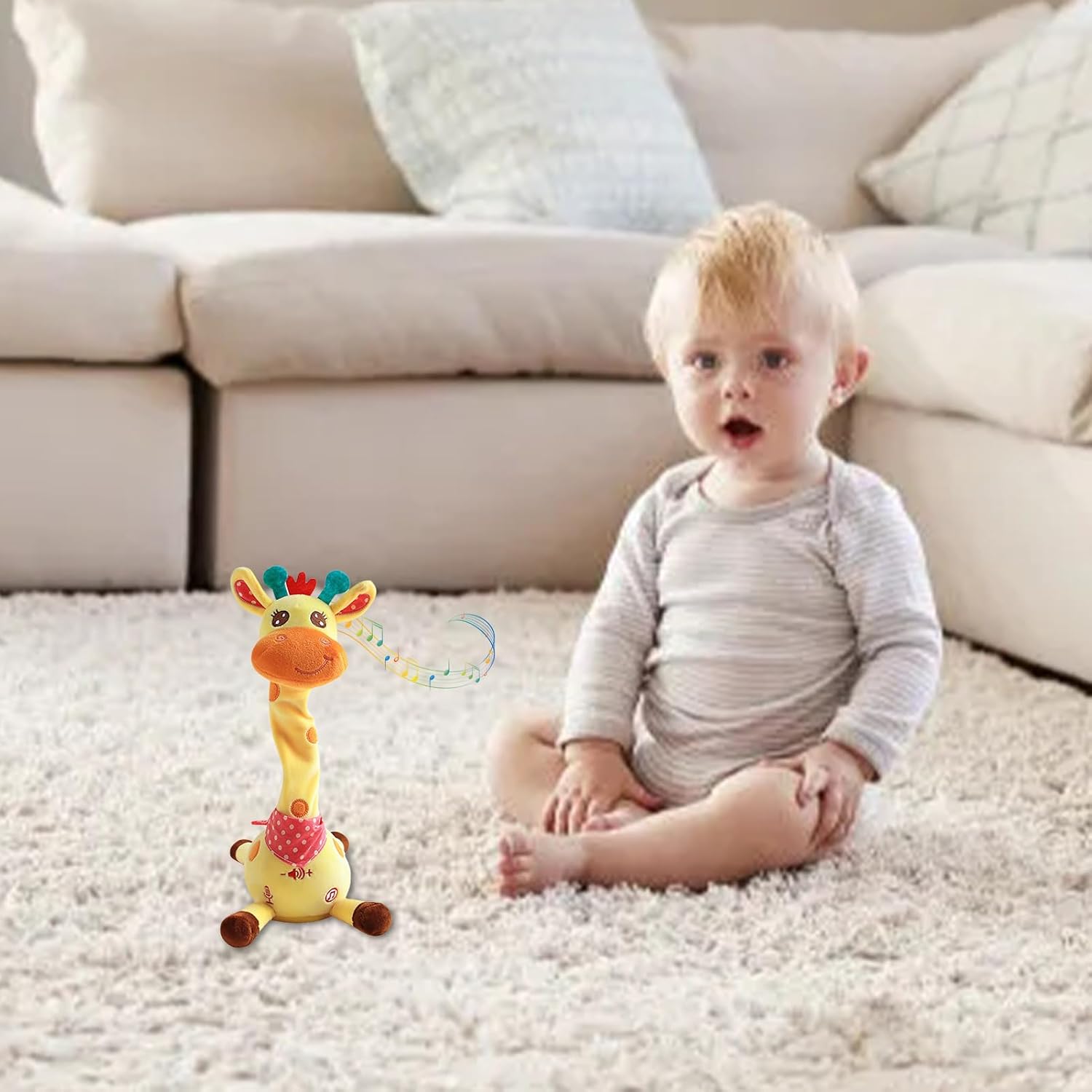 Sviluppo Linguistico Giocoso: Giocattolo ideale per bambini da 1 a 3 anni, la giraffa promuove la crescita delle capacità linguistiche e incoraggia il canto e la parlata attraverso interazioni divertenti e stimolanti, perfezionando le abilità comunicative in modo naturale durante il gioco quotidiano Idea Regalo Universale: Perfetta per occasioni speciali come festività e compleanni, conquista colleghi, familiari e amici aggiungendo divertimento a ogni celebrazione con la sua simpatia Batteria a Lunga Durata: Grazie alla batteria ricaricabile integrata, questa giraffa semplifica la ricarica e assicura un funzionamento continuo, offrendo un intrattenimento prolungato e piacevole per tutta la famiglia con massima facilità d'uso Designo bambino-friendly: Questo giocattolo giraffa intrattiene i bambini con movimenti, canzoni e ripetizione di suoni, catturando la loro attenzione e creando un'esperienza di gioco coinvolgente e rilassante per momenti di divertimento quotidiano Tessuto Peluche Resistente: Costruito con materiali peluche affidabili e sicuri, assicura una texture soffice e confortevole che resiste alla deformazione anche dopo uso prolungato, aumentando la soddisfazione tattile e la durata del prodotto.