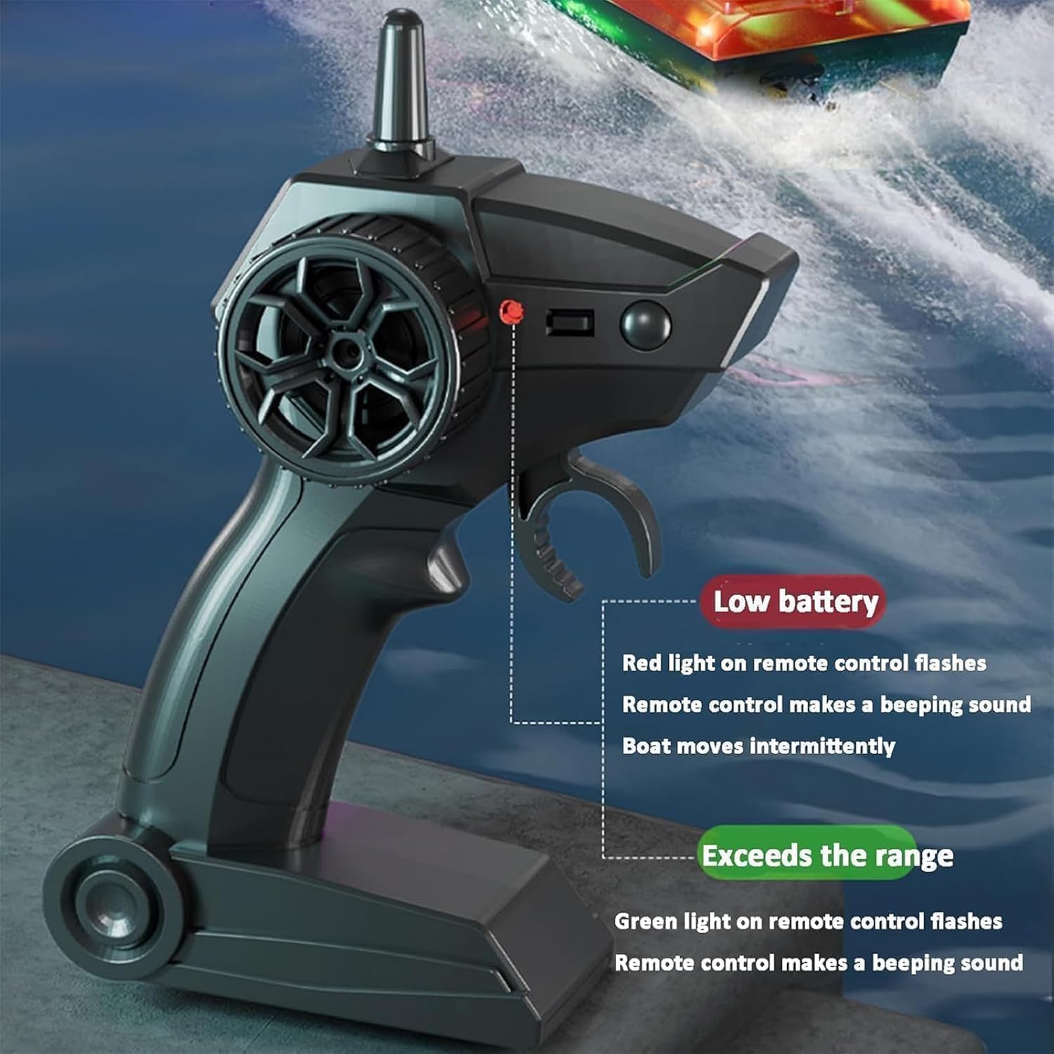 【Bright LED Lights for Improved Visibility】The Remote Control Boat features stunning LED lights to illuminate your direction during nighttime races, making it easy to track in dark waters. 【Reliable 2.4GHz Rc Technology】Advanced 2.4GHz RC boat technology for seamless navigation. This innovative system allows multiple boats to race simultaneously without interfering with each other. 【Waterproof Design】The Remote Control Boat for Lakes features a fully sealed waterproof structure that withstands water immersion, protecting its internal components from damage. Your boat is built to last and perform reliably, allowing you to enjoy fun in the pool and lake. 【Intelligent Low Battery Warning】Built-in low-battery warning keeps you in control. When the boat approaches low battery, you'll receive an audible alert to prompt your safe return, ensuring you never lose track of your RC boat during thrilling outdoor adventures. 【Adjustable Speed and One-to-Push Reset Function】Customize your racing experience with adjustable speed settings and a convenient one-button reset function.