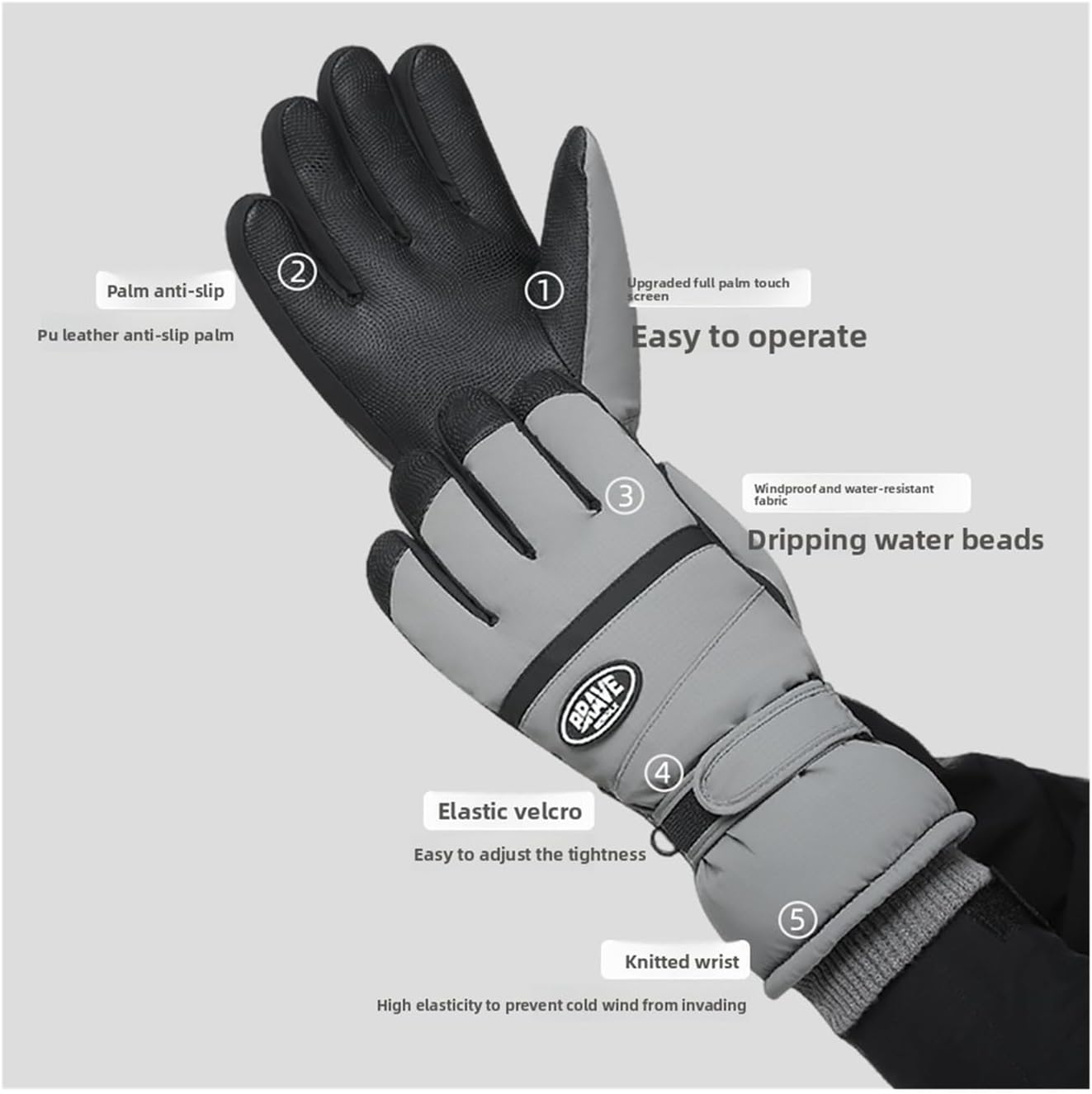 Funzione touch screen: il materiale conduttivo appositamente progettato su pollice e indice consente di utilizzare facilmente smartphone e dispositivi senza dover togliere i guanti durante le attività. Protezione migliorata delle nocche: design ergonomico con aree rinforzate sulle nocche per offrire maggiore resistenza agli urti delle mani durante l'attività sportiva e la guida. Isolamento termico a tre strati: realizzato con fodera in pile spesso e tecnologia termica a triplo strato per trattenere efficacemente il calore e bloccare il freddo nelle condizioni invernali. Cinturino da polso regolabile: dotato di una fibbia magica al polso per una tenuta personalizzabile, che garantisce una vestibilità sicura sia per uomini che per donne durante i movimenti dinamici. Costruzione impermeabile e antivento: realizzata in poliestere resistente con prestazioni completamente impermeabili e antivento, ideale per lo sci, il ciclismo, la motocicletta e gli sport sulla neve.