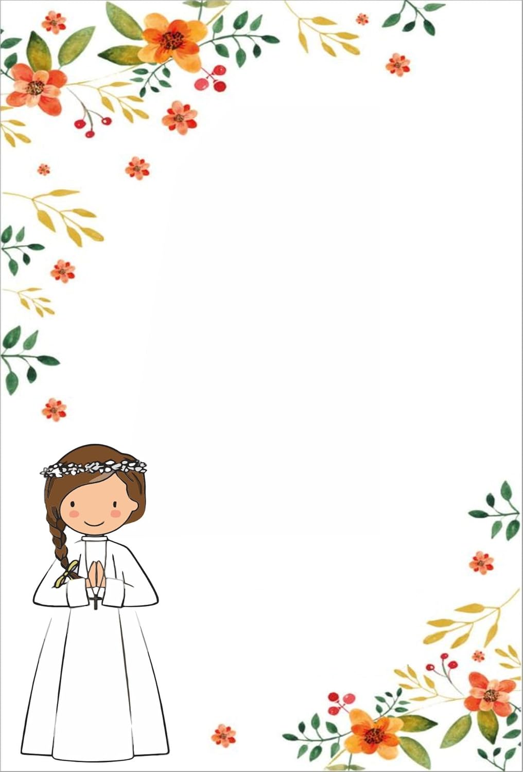 DESIGN ELEGANTE: Invito per Prima Comunione con delicati motivi floreali DETTAGLI EVENTO: personalizza con il tuo testo. FORMATO PROFESSIONALE: Layout strutturato con informazioni chiare e complete per tutti gli ospiti. STILE GRAFICO: Caratteri eleganti per il nome e i dettagli, con una disposizione armoniosa degli elementi