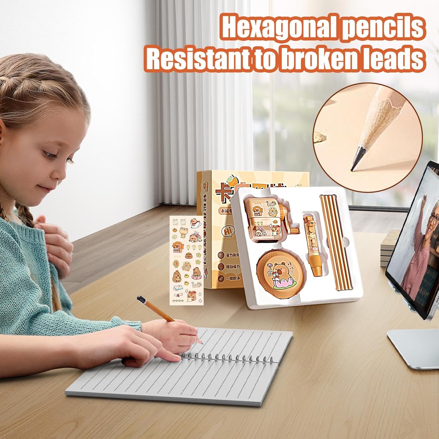Compagno Scrittura Efficiente: Unisce un pratico aspirabriciole elettrico per la pulizia, un temperamatite a manovella per punte perfette e gomme con presa ergonomica per migliorare la tua esperienza di scrittura Massima Igiene: L'aspiratore elettrico elimina efficacemente i frammenti di gomma da cancellare, favorendo un ambiente di studio piacevole che incrementa l'efficienza e si adatta praticamente a tutti i tipi di matite Materiali Robusti: La struttura in PP ad alta resistenza assicura durabilità prolungata anche con utilizzo intensivo, soluzione responsabile per esigenze quotidiane sicure Divertimento Assicurato: Porta sorrisi a bambini e ragazzi con questo set cancelleria , creato per esprimere cura in occasioni come compleanni, festività stagionali o celebrazioni di Capodanno Design Personaggi : La combinazione di adesivi con capibara e panda crea un'atmosfera coinvolgente che aumenta l'interesse per l'apprendimento nei bambini