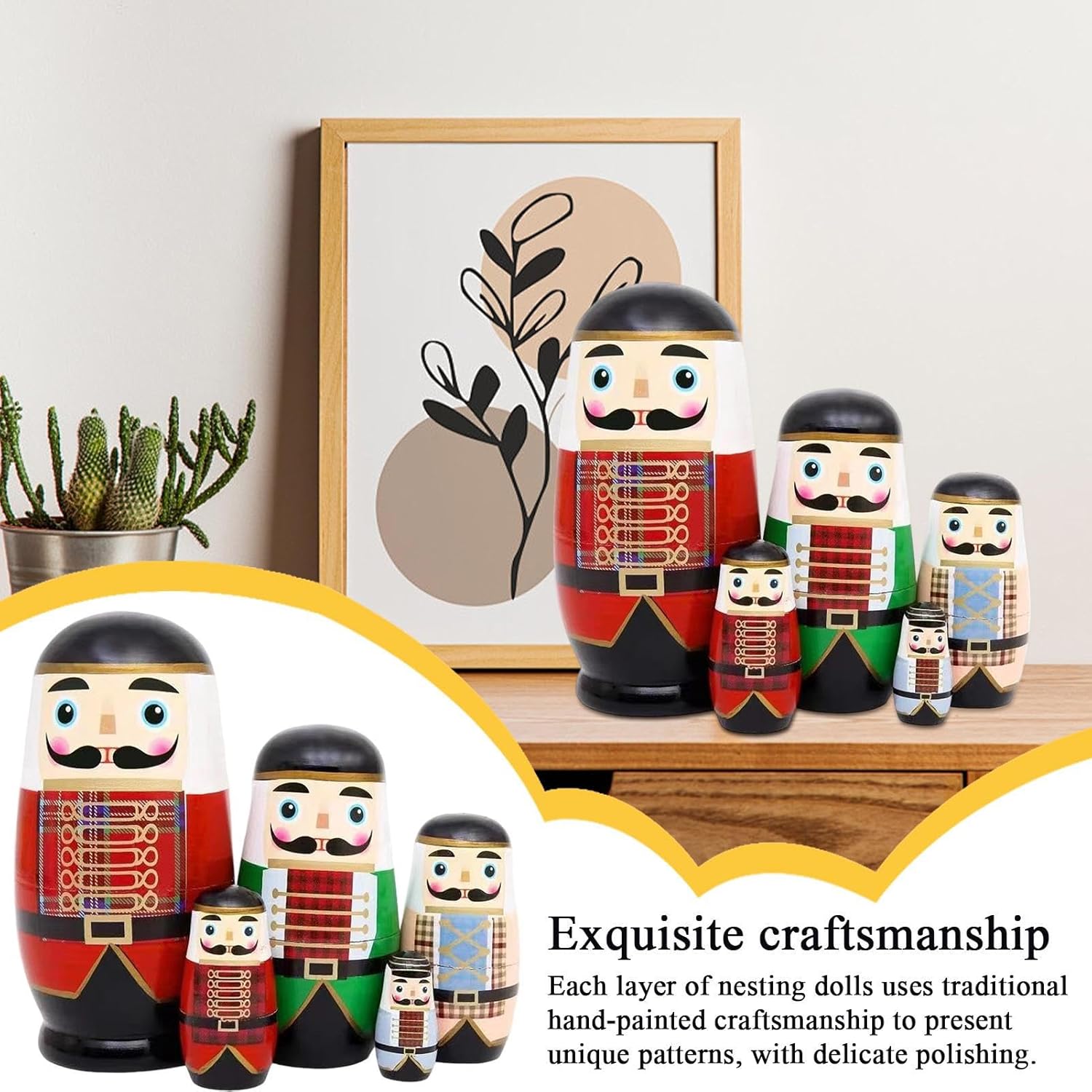 Prezioso: Porta gioia a famiglia, partner e amici in compleanni, festività, Natale o Capodanno con queste matriosche, che comunicano con grazia sentimenti d'amore e cura creando ricordi duraturi insieme Multiuso e Versatili: Portano calore e fascino in molte scene, dalle decorazioni festive all'artigianato educativo, unendo bellezza e coinvolgimento interattivo con facilità Design a Strati Multi: Queste matriosche presentano una struttura a nidificazione progressiva che stimola la curiosità nel scoprire ogni bambola, favorisce il risparmio di spazio grazie alla compatta impilabilità e funge da giocattolo educativo per sviluppare il gioco immaginativo dei bambini attraverso l'esplorazione tattile e visiva Esposizione d'arte culturale: Con dettagli meticolosamente dipinti a mano e una fine lucidatura, queste matriosche enfatizzano trame lisce e una buona creatività. Funzionano sia come attività familiare coinvolgente che come pezzo decorativo, riflettendo una notevole espressione artistica. Qualità Artigianale Affidabile: Scelta accurata di legno di tiglio essiccato all'aria per resistere a crepe e deformazioni, offre valore da collezione a lungo termine e sicurezza, rispondendo alle aspettative di chi apprezza materiali lignei naturali e lavorazioni eccellenti