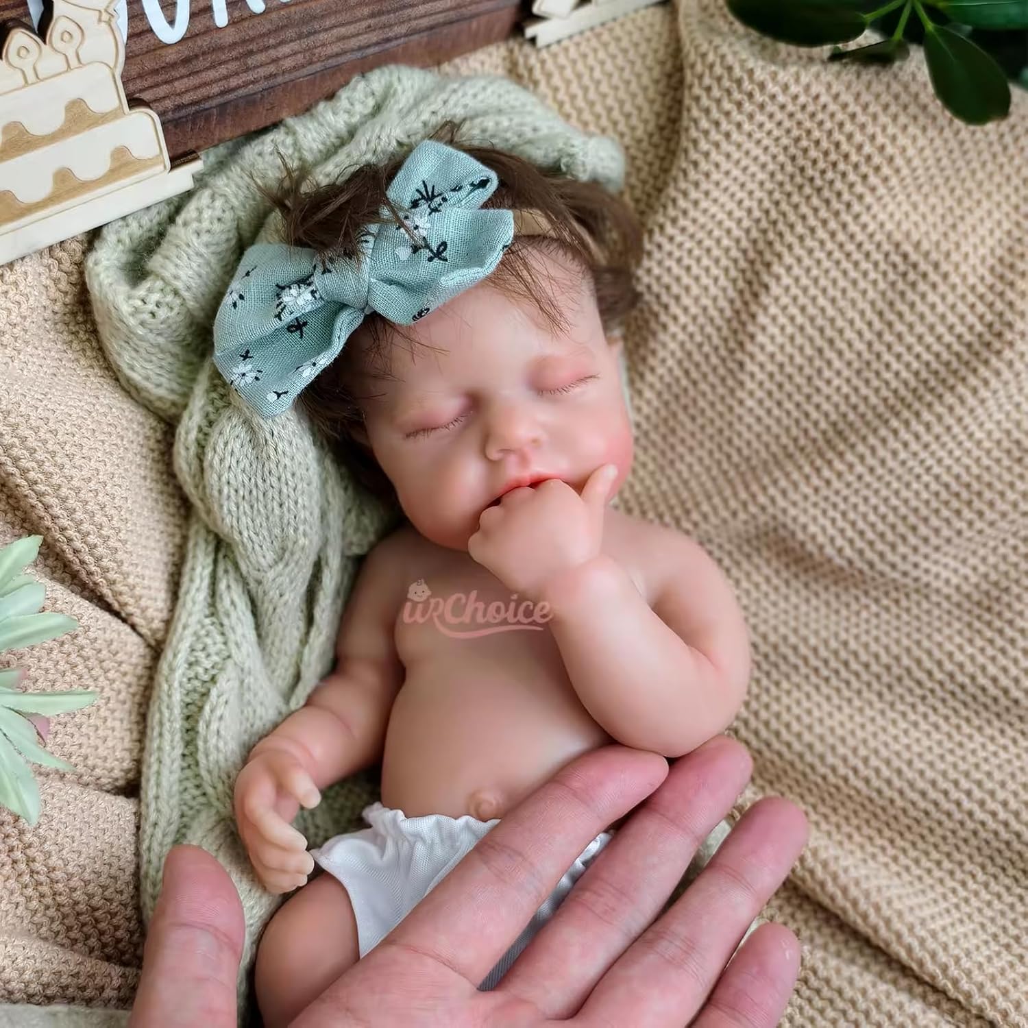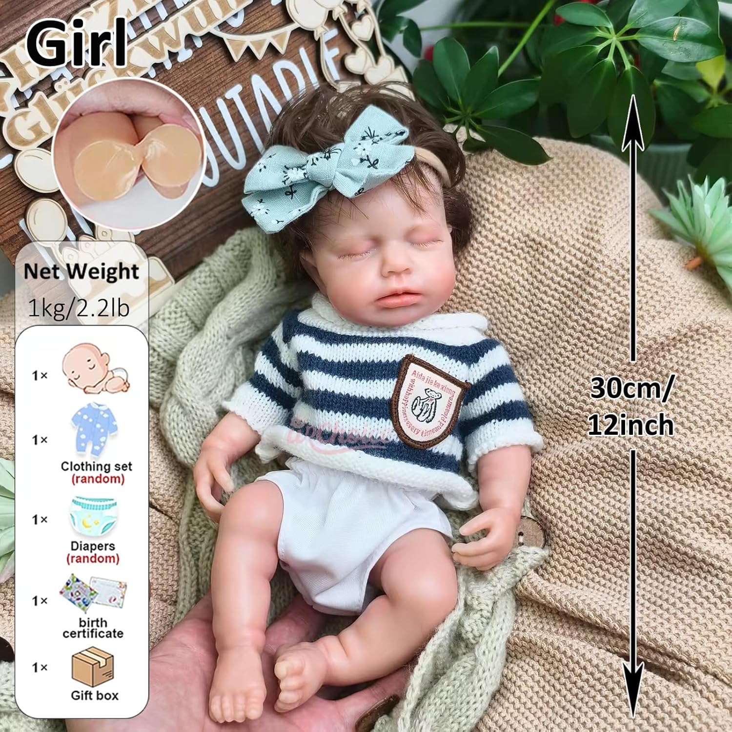 Dettagli squisiti e arti flessibili: questa mini bambola ergonomica misura 30 cm (12 pollici) di lunghezza e pesa 1 kg (2,2 libbre), con arti flessibili per pose naturali. Con caratteristiche facciali delicate e adorabili e caratteristiche del corpo realistiche, questa bambola in silicone fatta a mano è un compagno affascinante per l'esposizione e le coccole delicate. Materiale in silicone di platino premium: Questa bambola in silicone a corpo intero è realizzata in silicone di platino di alta qualità, non in vinile, per una finitura opaca morbida superiore che è antiadesiva e resistente alle strappo. Questo materiale resistente garantisce che la bambola in silicone realistica rimarrà un prezioso oggetto da collezione per anni, catturando perfettamente la sensazione di un vero bambino. Sicuro, lavabile e pratico: questa bambola rinata in silicone lavabile è certificata CPC, CE e ASTM, rendendola sicura per coccolare e visualizzare e realizzata con materiali non tossici. A differenza delle bambole in vinile, tutto il suo corpo in silicone può essere accuratamente lavato con acqua per una facile cura mantenendo i bei dettagli dipinti. Squisitamente realizzato per un look veramente realistico: questa bambola rinata realistica a occhi chiusi presenta un'espressione dettagliata a bocca aperta e capelli impiantati. Il tono della pelle è meticolosamente dipinto a mano con texture delicate e ombreggiatura, catturando perfettamente l'aspetto delicato di un neonato addormentato e creando un'atmosfera mozzafiato realistica. Nota: Tutte le bambole in silicone hanno un foro di iniezione in silicone nella testa come parte del processo di fabbricazione della bambola. Questa marcatura unica su ogni bambola in silicone non influisce sulla qualità della bambola.