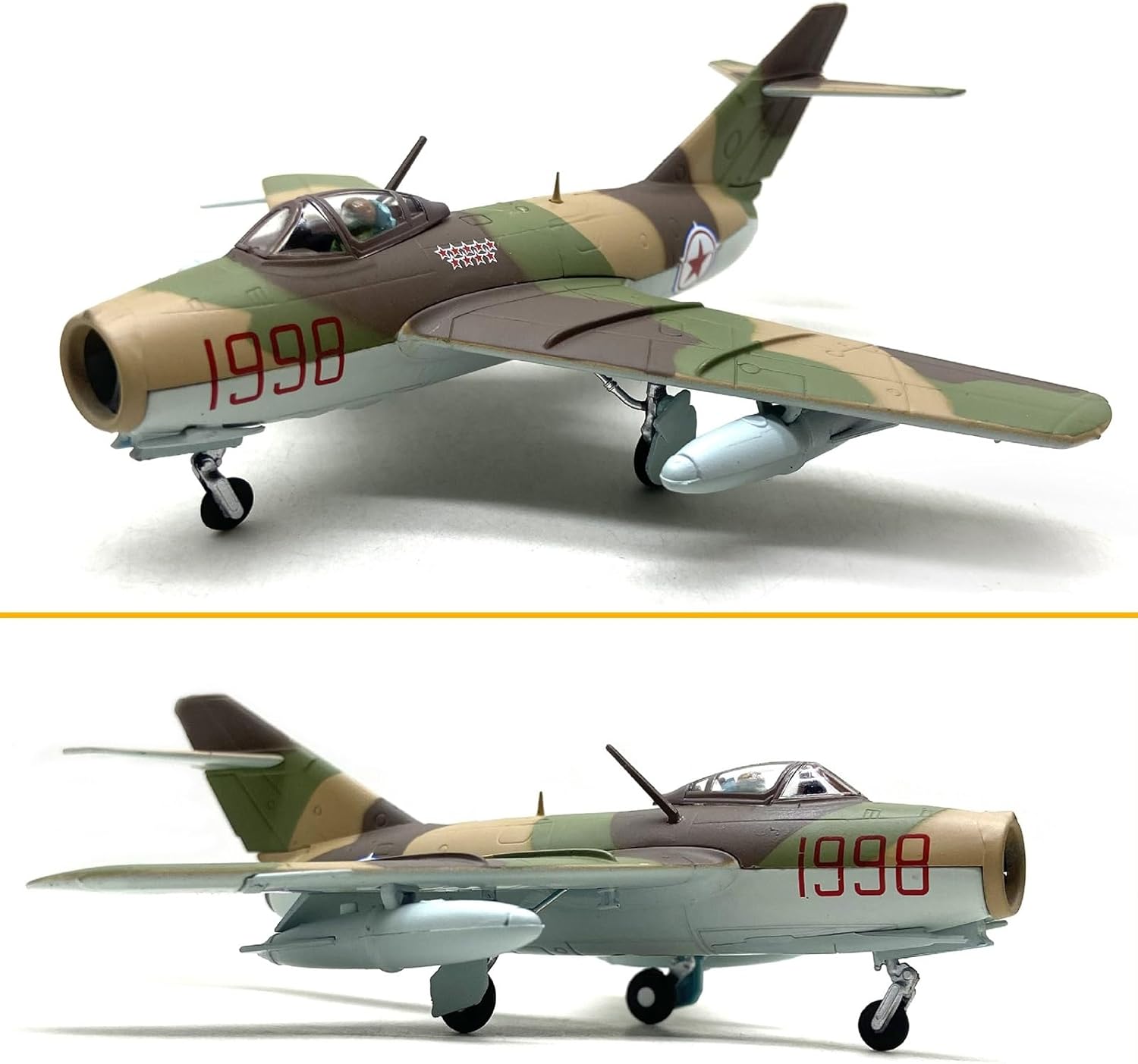 Aeromodelli in scala reale: 5,5" in scala 1:72, modello di aereo da caccia Mig-15, 5,5*5,5*1,97 pollici. Artigianato raffinato: il modello del caccia MiG-15 adotta una fusoliera in lega di alta qualità, una base solida e una staffa. Il modello dell'aereo è molto aerodinamico. Inoltre, il colore della carrozzeria è ricco e sottolinea la bellezza di molti dettagli. Modello di jet restaurato: modello di aereo da caccia Mig-15 in scala 1:72, dimensioni: peso circa 0,2 kg, la scala ridotta consente una migliore visualizzazione dei modelli di aerei in qualsiasi momento. Design semplice della fibbia: facile da montare e installare, basta installare le ali nello slot for schede e quindi utilizzare lo slot for schede speciale assemblato for fissare la base e la fusoliera. Regalo da collezione: il modello di aereo è dotato di una base pronta for essere esposta, una splendida decorazione e un oggetto da collezione for l'ufficio e la casa, ed è un regalo perfetto for gli appassionati di aviazione e i collezionisti.