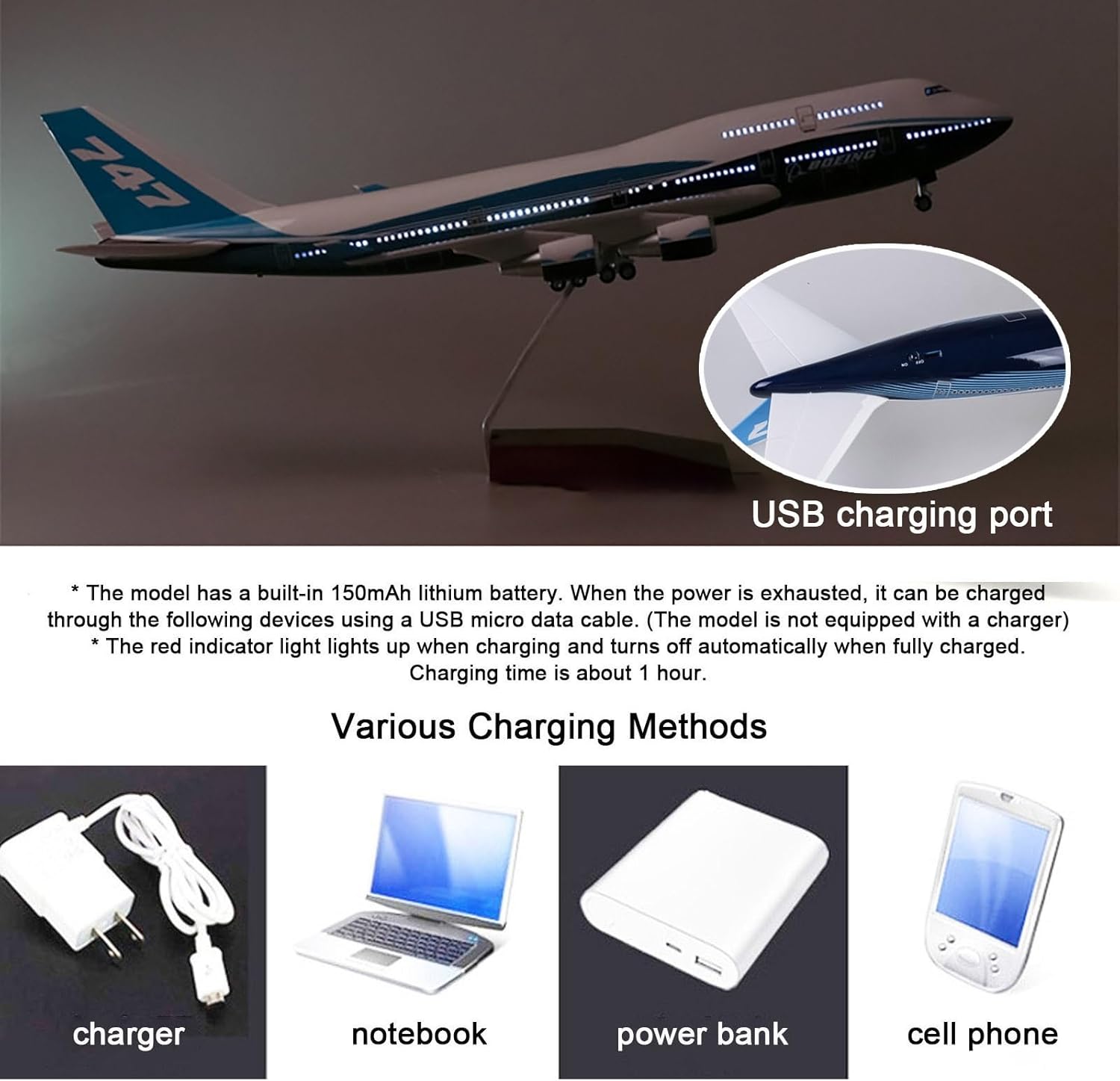 Generico Modello di aereo modello B474 in scala 1:150 da 18,1 pollici, prototipo di aereo, modello di aereo a reazione da collezione, in resina con ruote, pressofuso for collezione(LED B747)