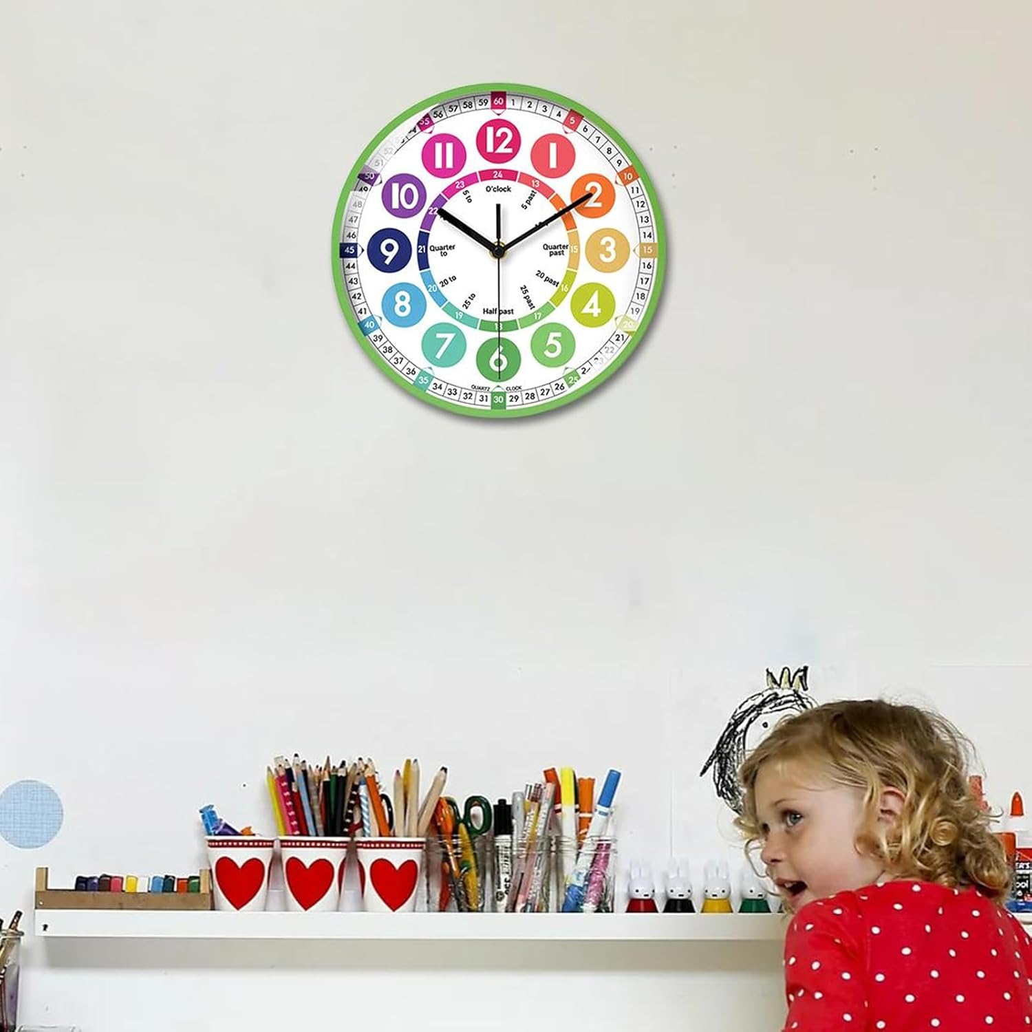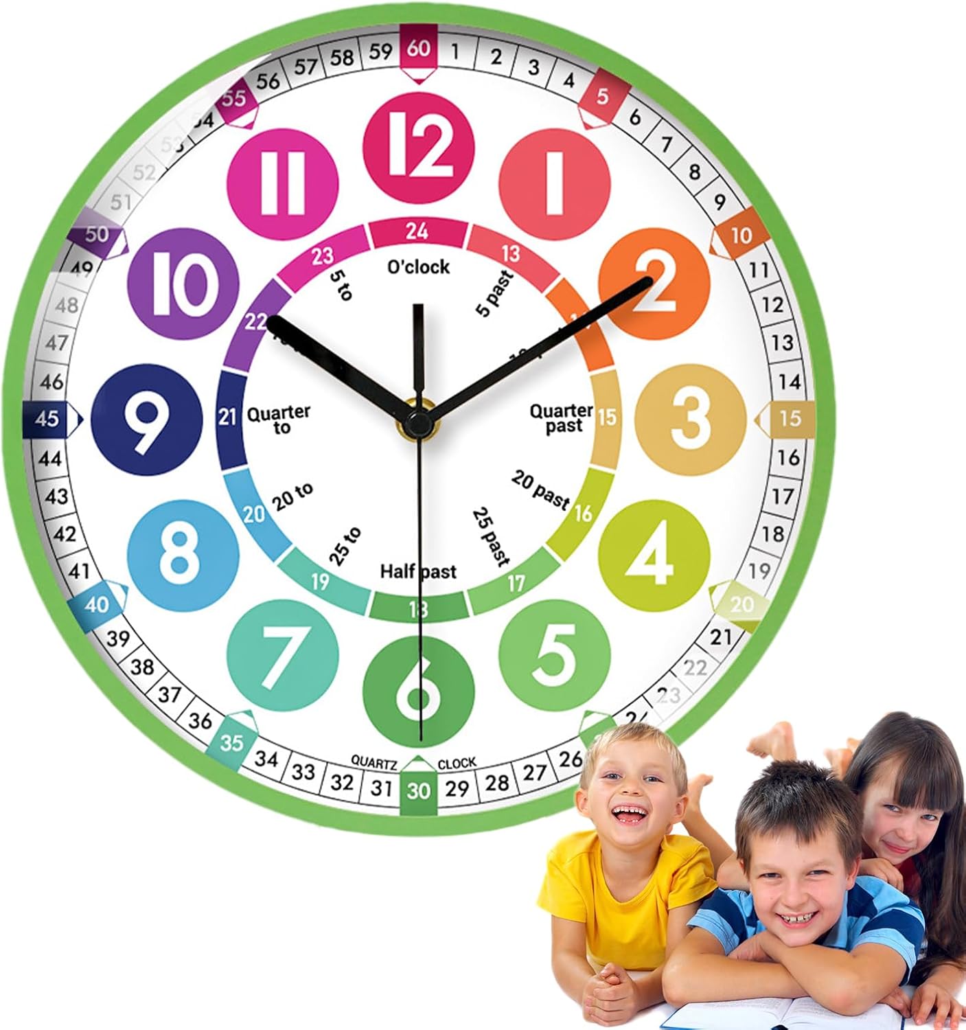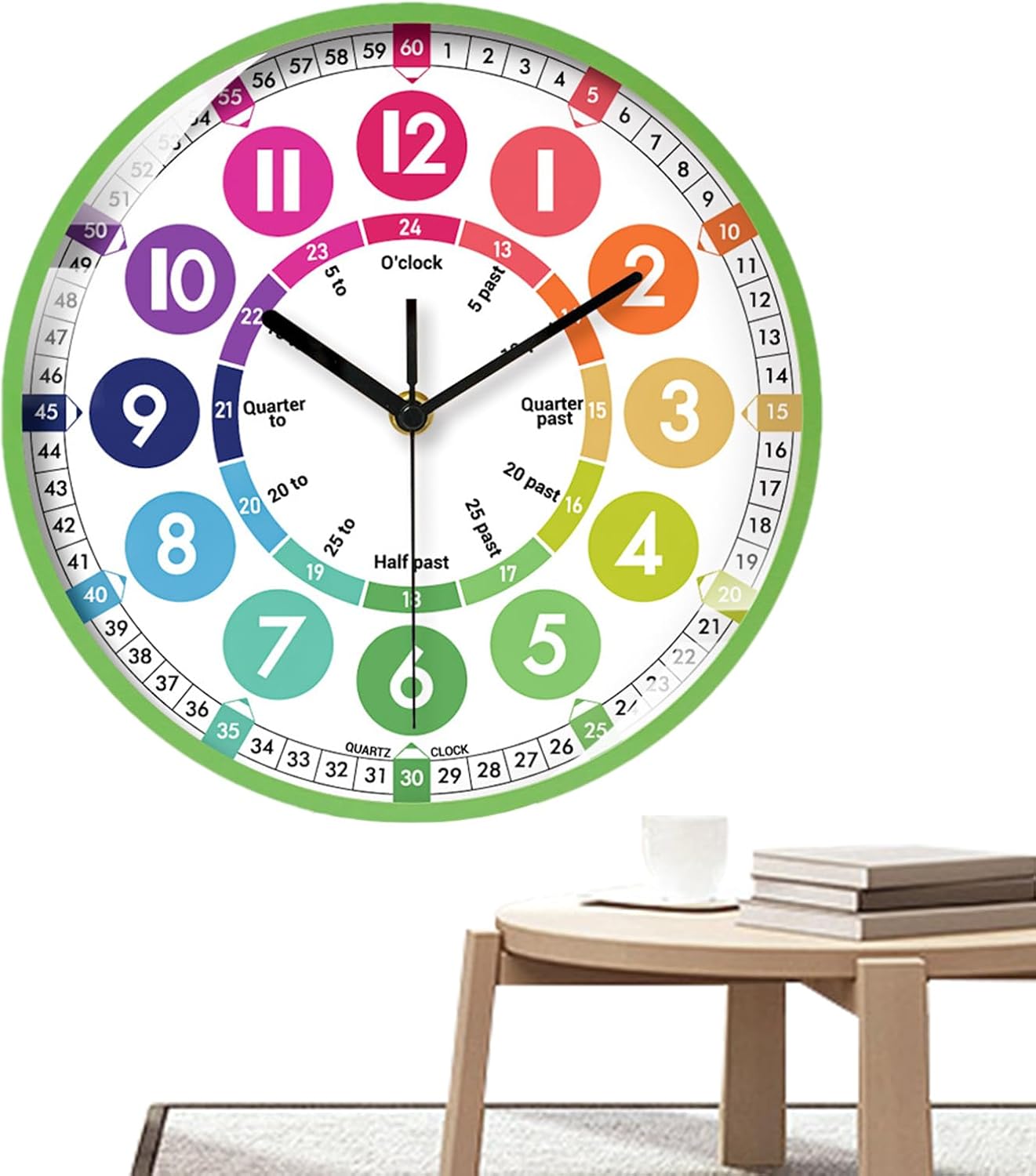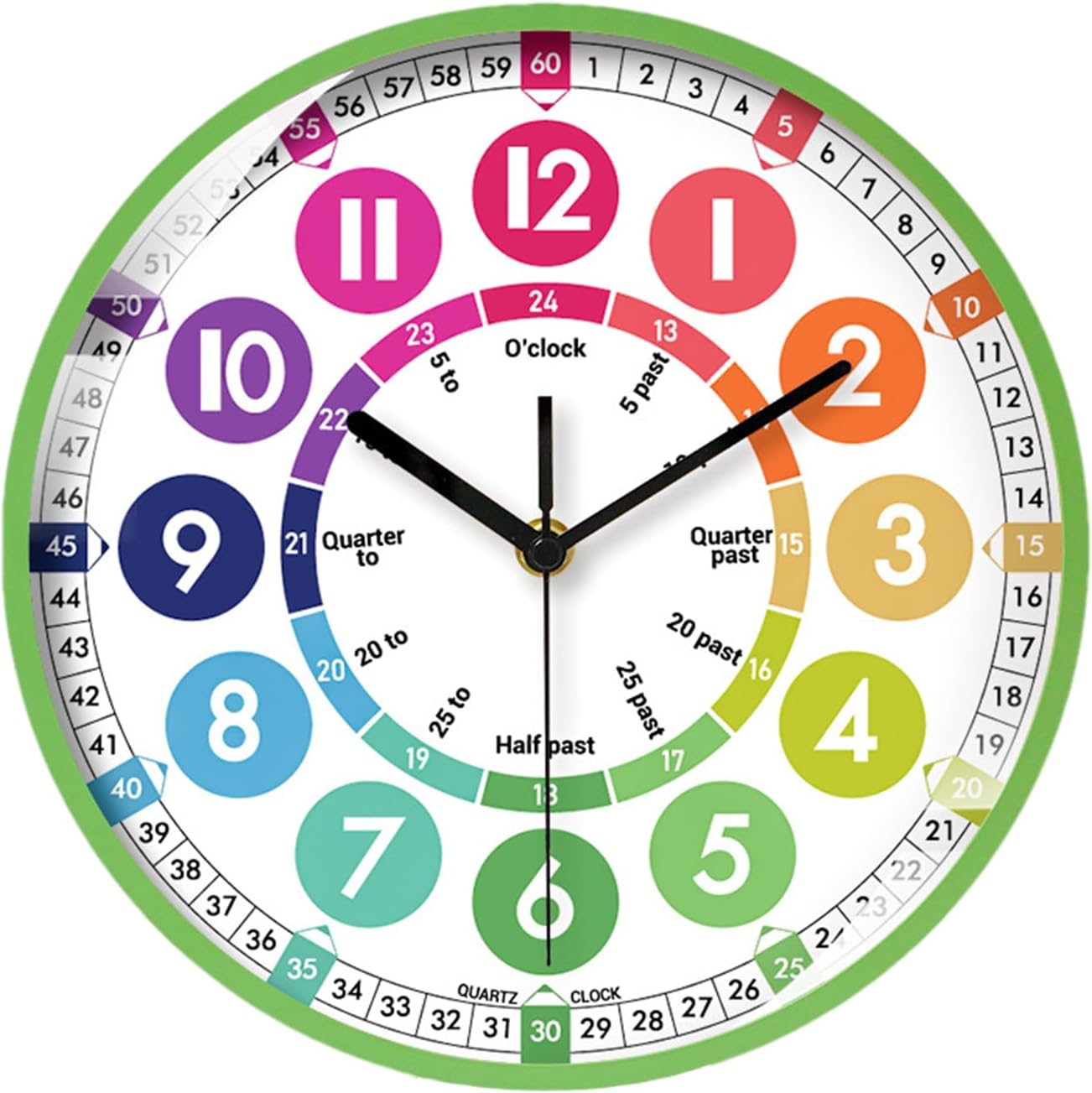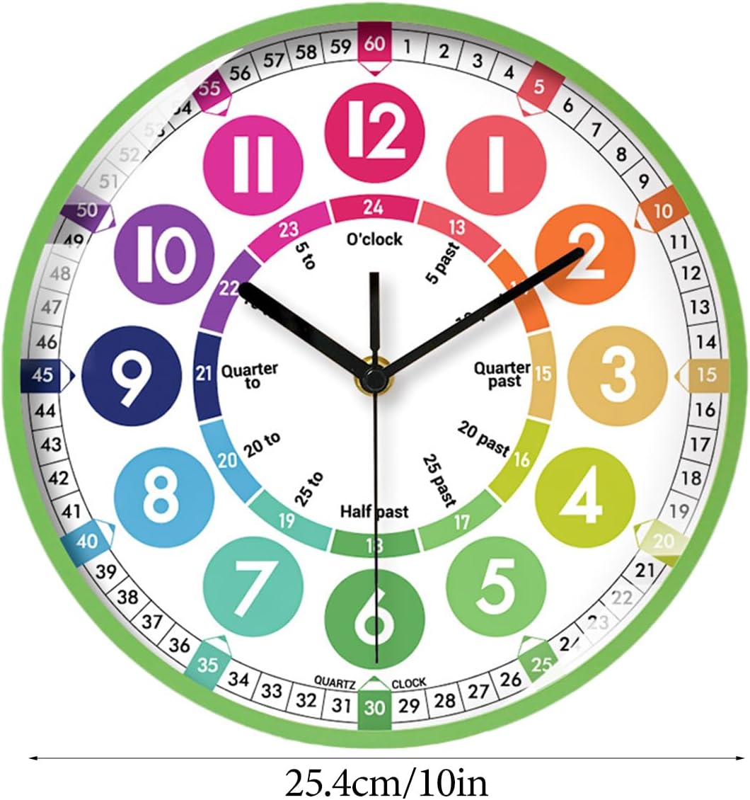 Interessante divisione dei numeri: inizia l'amore per l'apprendimento nei bambini con il nostro orologio per i bambini. Disegni colorati e divisioni intriganti di numeri e scale sul volto 'orologio attirano la loro attenzione e aumentano il loro interesse per gli orologi. mentre la loro curiosità aumenta e la loro comprensione cresce. Dimensioni adeguate: aiutare i bambini a imparare le abilità di per il nel modo divertente. Il nostro orologio di apprendimento da 25x25 cm, realizzato in materiale ABS, garantisce durata e sicurezza, rendendolo una scelta intelligente per la stanza di ogni bambino o l'area di studio. Apprendimento completo del : impara a distinguere gli orologi in più modi con il nostro orologio di apprendimento. Leggi diversi momenti di orologio da parete e combina senza sforzo il formato 12/24 per il facile. Migliore gestione del : con un movimento di scansione silenzioso, questo orologio da parete silenzioso garantisce tempi accurati senza rumore, rendendolo un'aggiunta perfetta all'ambiente di apprendimento di tuo figlio. Installazione semplice: il nostro orologio per i bambini può essere eseguito su una singola batteria (batterie non incluse). Sostituire la batteria è semplice e veloce e non influenzerà la durata del movimento o l'accuratezza 'orologio.