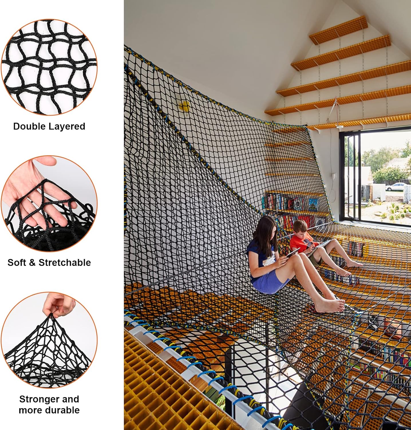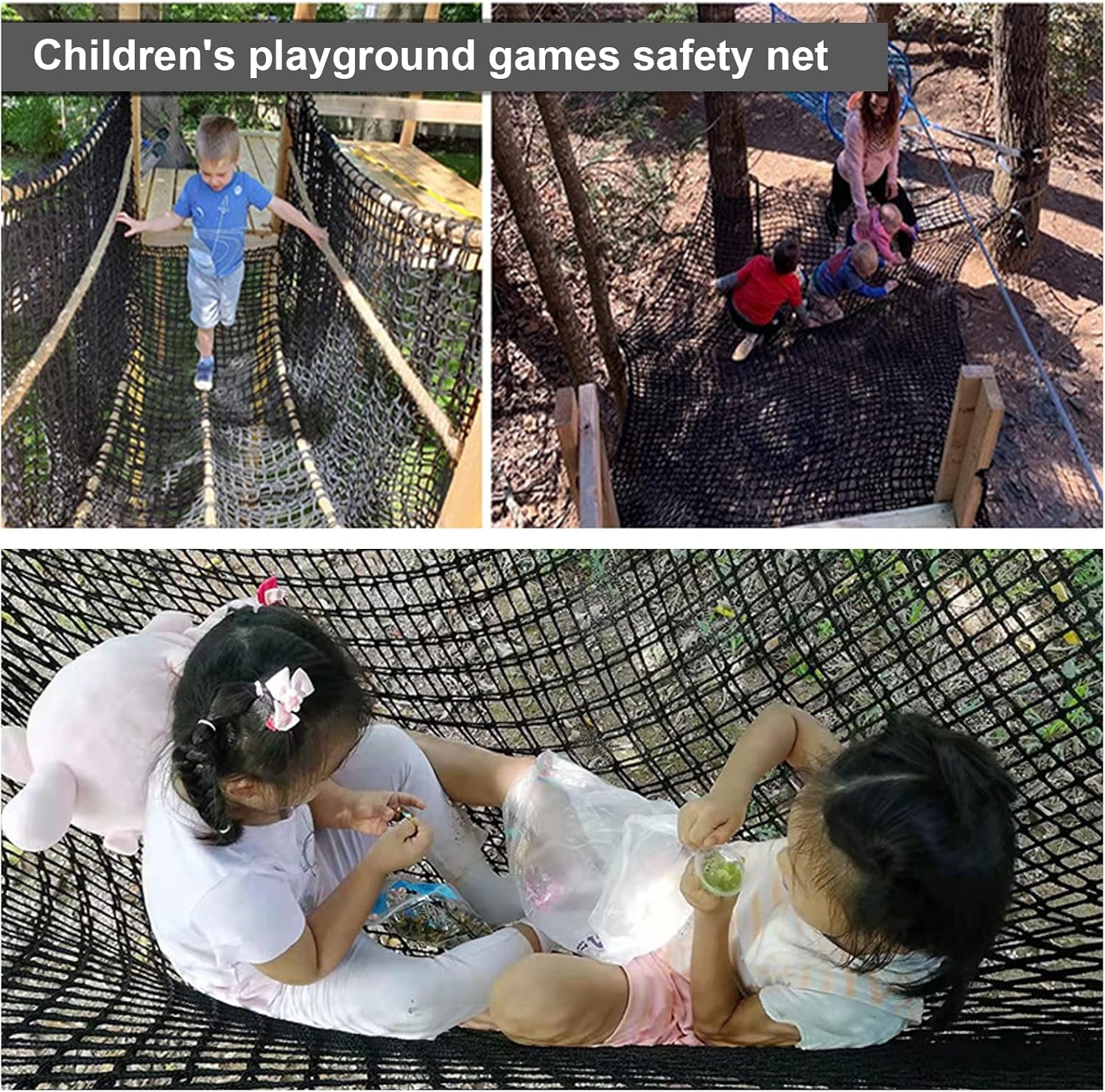 Realizzato in poliestere di alta qualità, è resistente e non si strappa facilmente. Ha ottime prestazioni anti-frammentazione e può essere utilizzato a lungo per garantire la sicurezza dei bambini. Il design della struttura a doppio strato migliora il fattore di sicurezza. La superficie in rete ha unelasticità moderata, che può prevenire efficacemente le cadute e fornire un supporto confortevole. Sono disponibili tre specifiche: 100x300 cm, 200x300 cm e 300x300 cm per soddisfare le esigenze di diversi luoghi e adattarsi a vari scenari di divertimento. Il design del rinforzo del bordo in corda è facile da appendere. È multifunzionale e adatto per ponti da parco giochi, altalene da giardino e impianti sportivi. Può anche essere utilizzato come rete di protezione per scale da balcone. Può essere strofinato con acqua saponata o risciacquato direttamente, il che è comodo da pulire; può essere piegato e riposto rapidamente quando non in uso, risparmiando spazio di archiviazione e non occupando spazio.