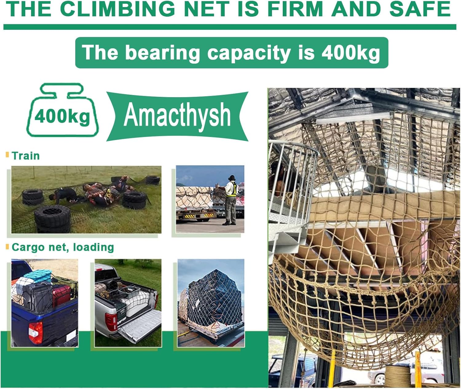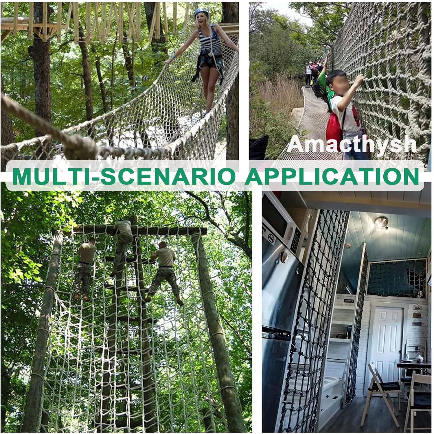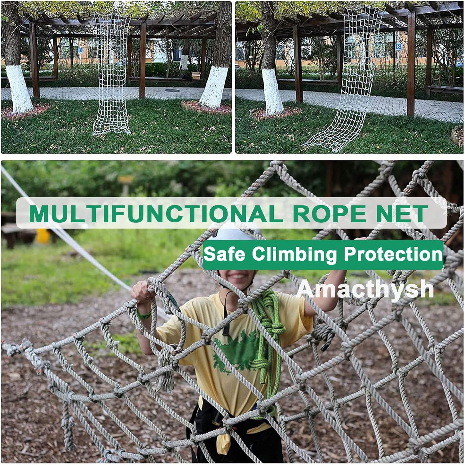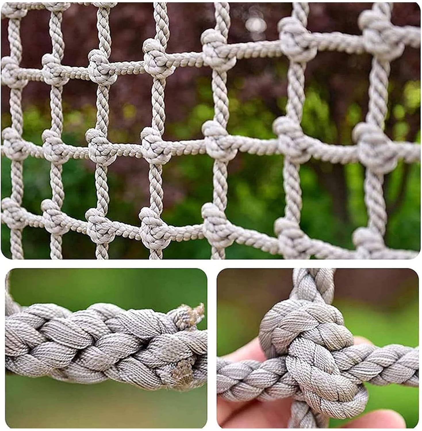 Specifiche della corda per rete da arrampicata: Diametro: 10 mm; Dimensione delle maglie: 20 cm. Ideale per arrampicata, decorazione e protezione di sicurezza. Questa corda versatile può essere facilmente piegata e riposta quando non in uso, rendendola un'aggiunta pratica alla tua attrezzatura da esterno. Migliora la tua esperienza di arrampicata con questa corda per rete da arrampicata affidabile e resistente. Rete per strutture da arrampicata: realizzata con tecniche di tessitura a mano, questa rete resistente supporta diametri di corda e dimensioni delle maglie personalizzati. Il suo design elastico migliora la versatilità e la resistenza all'usura, garantendo una lunga durata. Adatta a diverse strutture da arrampicata, offre una soluzione sicura e affidabile per il divertimento e l'avventura all'aria aperta. Perfetta per i bambini e il gioco attivo! Soluzione protettiva multiuso: perfetta per proteggere balconi, ringhiere delle scale e muri del patio. Ideale per feste a tema, bar, librerie e ristoranti. Utilizzabile per appendere decorazioni al soffitto o come recinzione. Ideale per campi di allenamento di calcio e come copertura per il carico dei camion. Migliora la sicurezza e l'estetica in vari ambienti senza sforzo. Rete da gioco per bambini che si arrampicano: questa rete da arrampicata di queste dimensioni è utilizzata principalmente per l'arrampicata, ha una capacità di carico fino a 300 kg, è più resistente, facile da installare e da smontare. Protezione multiuso: può essere utilizzata anche per proteggere balconi e ringhiere per scale, balconi, corrimano di sicurezza, pareti per patio, feste a tema per casa, pensioni, bar, librerie, ristoranti, decorazioni per soffitti sospesi; recinzione di siti; recinzione di base per allenamenti di calcio; copertura isolante per camion, ecc.