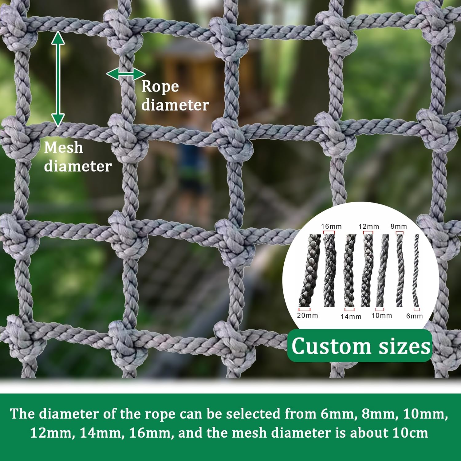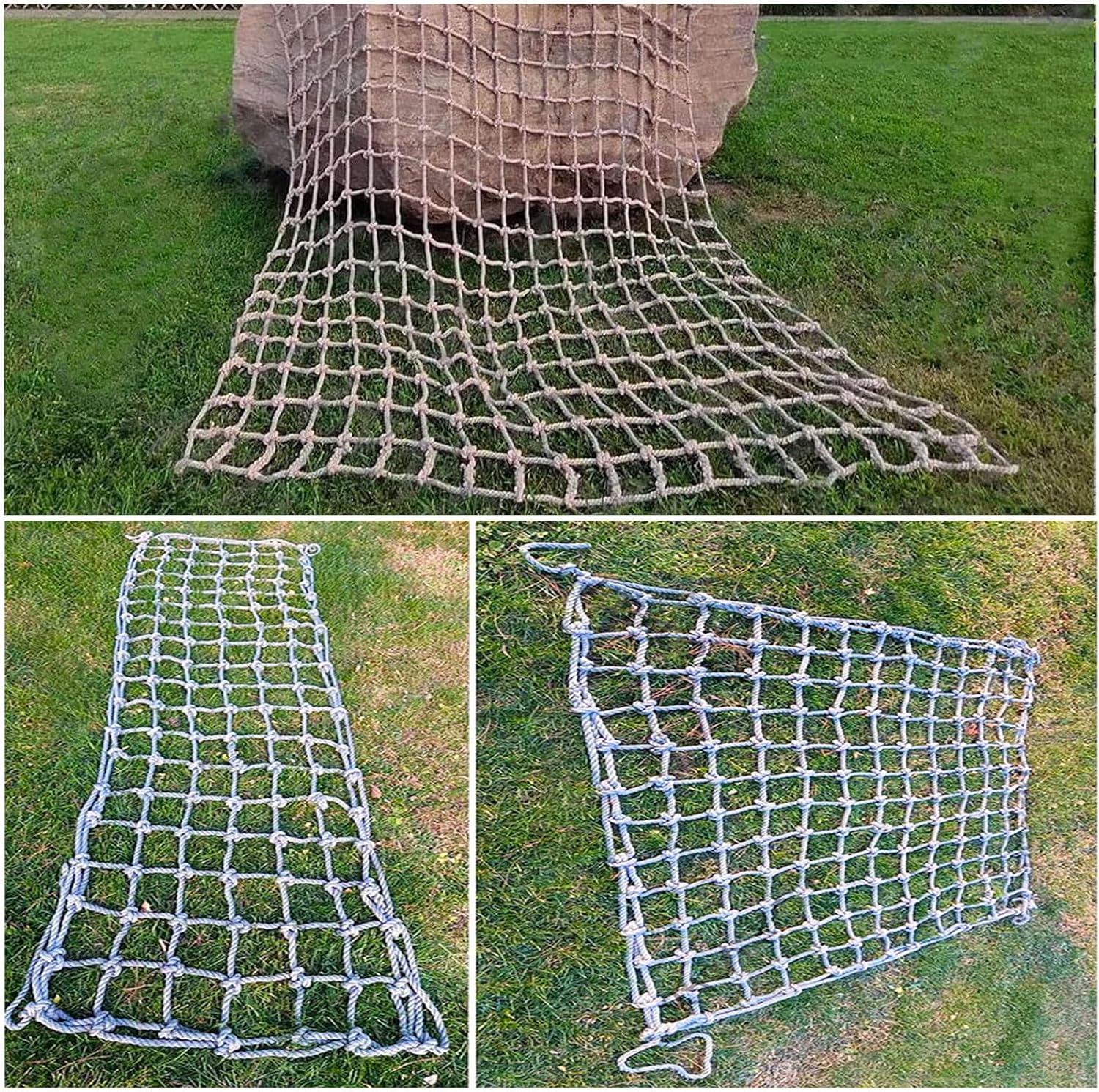Rete di corda multiuso: ideale per le attività di arrampicata dei bambini, come altalene, casette da gioco all'aperto e palestre nella giungla. Perfetta per l'uso in case sugli alberi, ponti di corda e parchi giochi in giardino. Può anche essere utilizzata come amaca versatile o rete di sicurezza per balconi, ringhiere e corrimano delle scale, garantendo divertimento e sicurezza ai bambini mentre giocano. Resistente a tutte le condizioni atmosferiche: realizzato con nodi intrecciati a mano in morbido poliammide, questo prodotto garantisce una distribuzione uniforme dello stress e può supportare oltre 360 kg. Con un'elevata resistenza alla trazione e un'eccellente resistenza alle intemperie, è progettato per un uso esterno di lunga durata. Perfetto per varie attività e ambienti all'aperto, è una scelta affidabile per qualsiasi avventura. Dimensioni personalizzate: disponibile in lunghezze da 1 a 10 metri, con larghezza, diametro della maglia e diametro della corda personalizzabili per adattarsi perfettamente a diverse esigenze di spazio. Ideale per creare configurazioni versatili in qualsiasi luogo, questo prodotto garantisce flessibilità e adattabilità alle vostre esigenze specifiche. Perfetto per la casa, il giardino o l'uso all'aperto. Portatile e leggero: la rete da arrampicata è leggera e facile da spostare, il che la rende perfetta per le attività all'aperto e può essere arrotolata in una borsa portaoggetti per il trasporto o lo stoccaggio Dimensioni personalizzate: la lunghezza e la larghezza sono disponibili da 3,3 a 33 piedi e la lunghezza*larghezza, il diametro della maglia e il diametro della corda possono essere personalizzati per adattarsi perfettamente a diverse esigenze di spazio