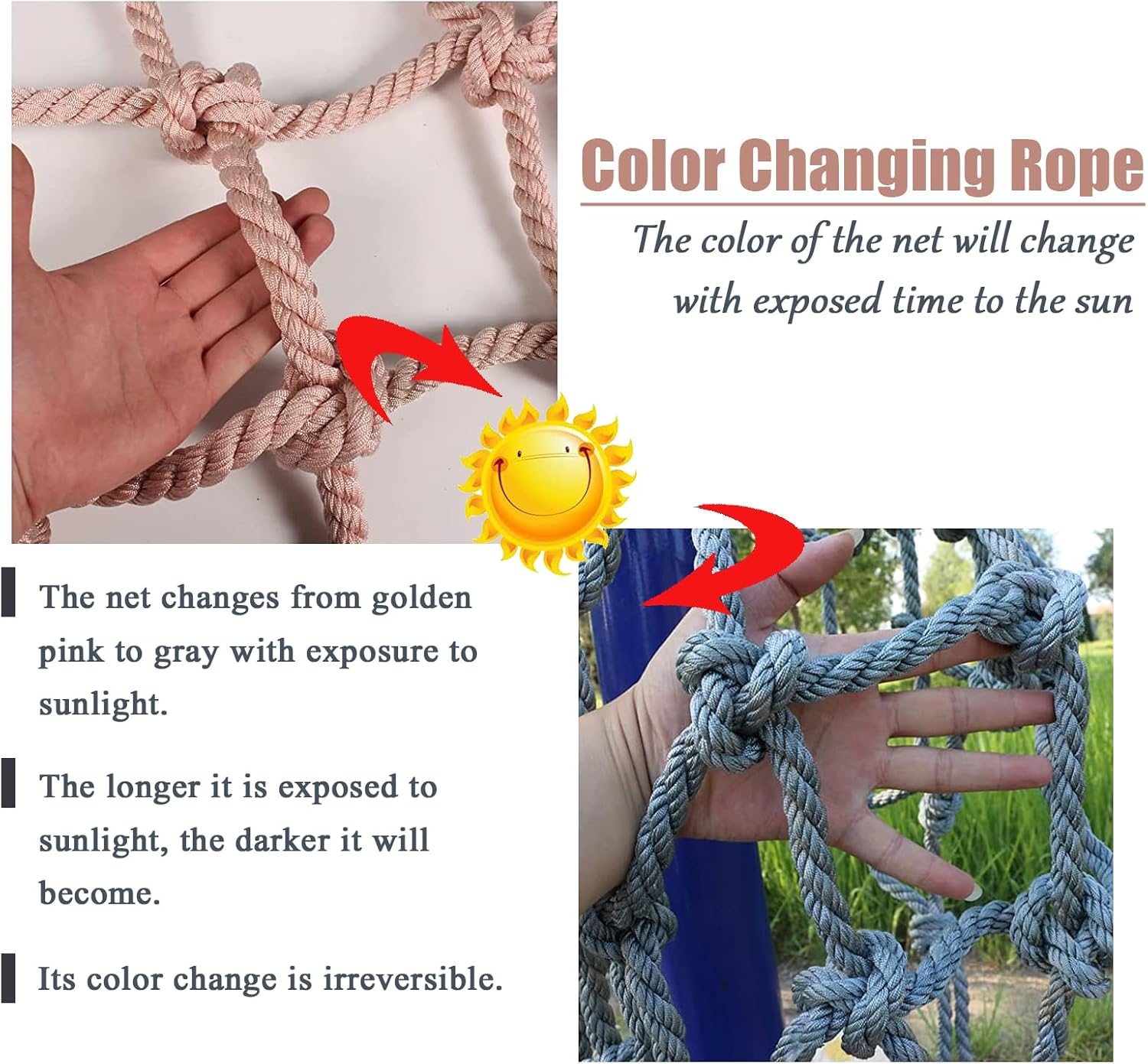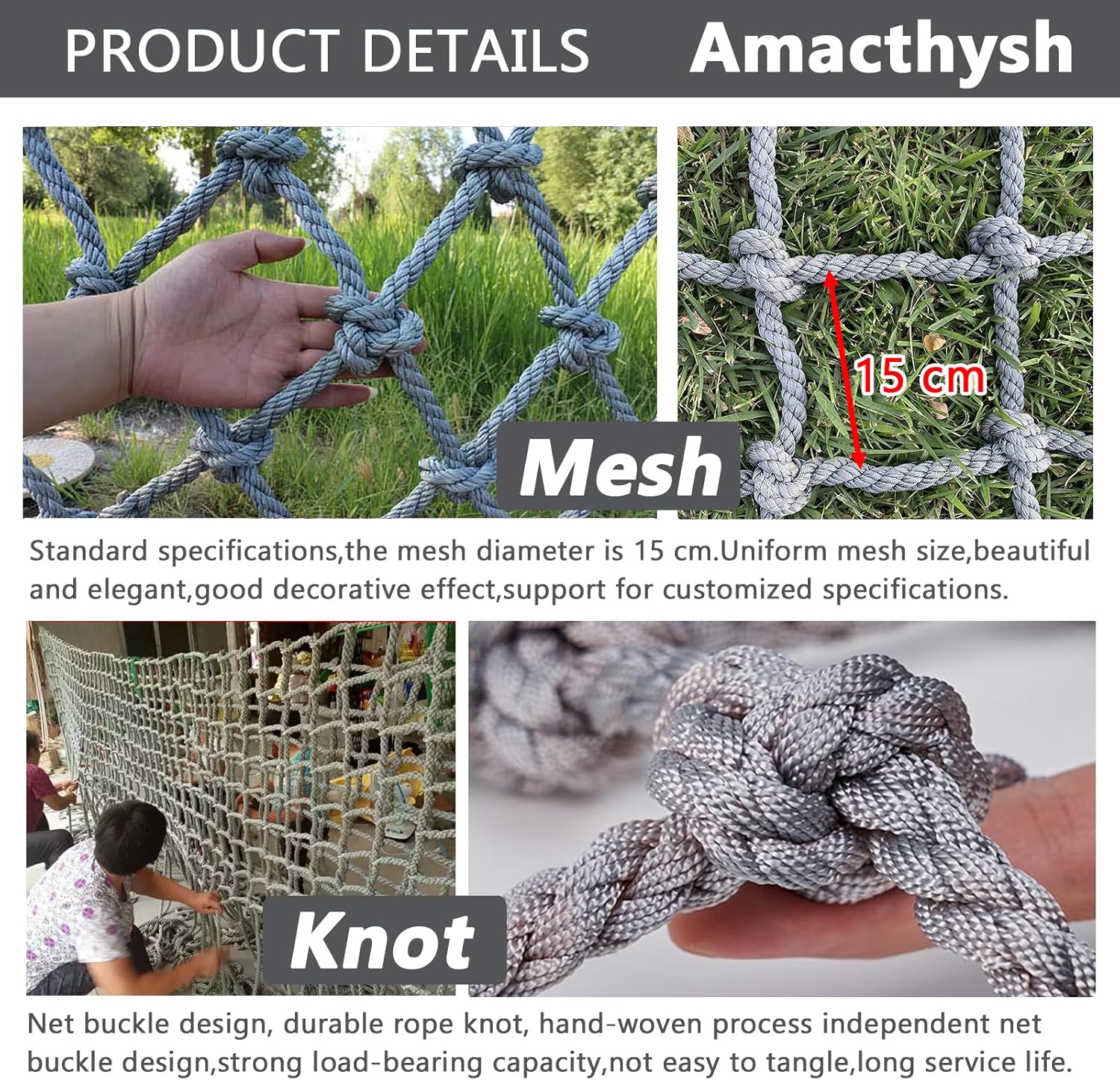 Rete da arrampicata intrecciata a mano: questa resistente rete di sicurezza per bambini è progettata per l'uso all'aperto. Realizzata con nodi robusti e tessitura multifilo, garantisce maggiore robustezza e resistenza agli urti. Perfetta per creare un ambiente sicuro, questa rete da arrampicata è costruita per resistere a diverse condizioni, offrendo sicurezza e tranquillità a genitori e tutori. Vi presentiamo il nostro prodotto in fibra di poliammide resistente alle intemperie di alta qualità, progettato per garantire durata e resistenza. Dotato di eccellente elasticità e resistenza all'usura, questo versatile articolo è progettato per resistere agli agenti atmosferici. Offre una notevole capacità di carico fino a 300 kg, garantendo prestazioni di lunga durata. Ideale per l'uso esterno, questo prodotto combina funzionalità e resistenza per tutte le vostre esigenze. Dimensioni personalizzate: distanza tra le maglie di 15 cm e diametro della corda di 10 mm. Questa rete protettiva è disponibile con diverse distanze tra le maglie, spessori della corda e dimensioni, per permetterti di trovare la soluzione perfetta per le tue esigenze. Scegli tra una gamma di colori per valorizzare il tuo spazio garantendo al contempo sicurezza e protezione. Ideale per diverse applicazioni, questa rete unisce funzionalità e versatilità. Applicabile a: varie scene interne ed esterne, case sugli alberi, camion merci, scale, balconi, asili nido, parchi di divertimento, strutture pubbliche, isolamento per la protezione delle piante, edifici, reti da carico, reti da giardino, ecc., possono essere utilizzate per proteggere la sicurezza di adulti e bambini Dimensioni personalizzate: spaziatura delle maglie: 15 cm; diametro della corda: 10 mm. La rete protettiva può essere personalizzata con qualsiasi spaziatura delle maglie, spessore della corda, lunghezza*larghezza e colore di cui hai bisogno.