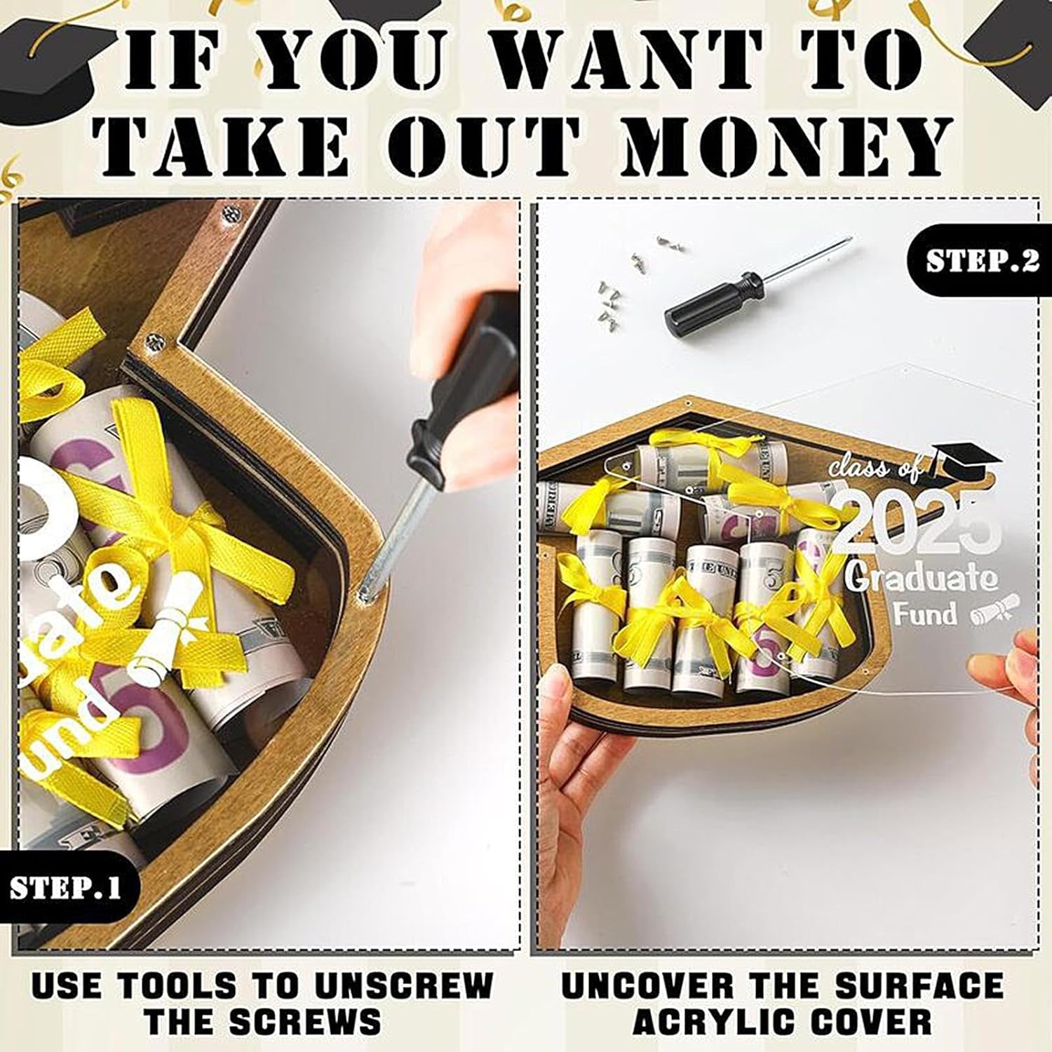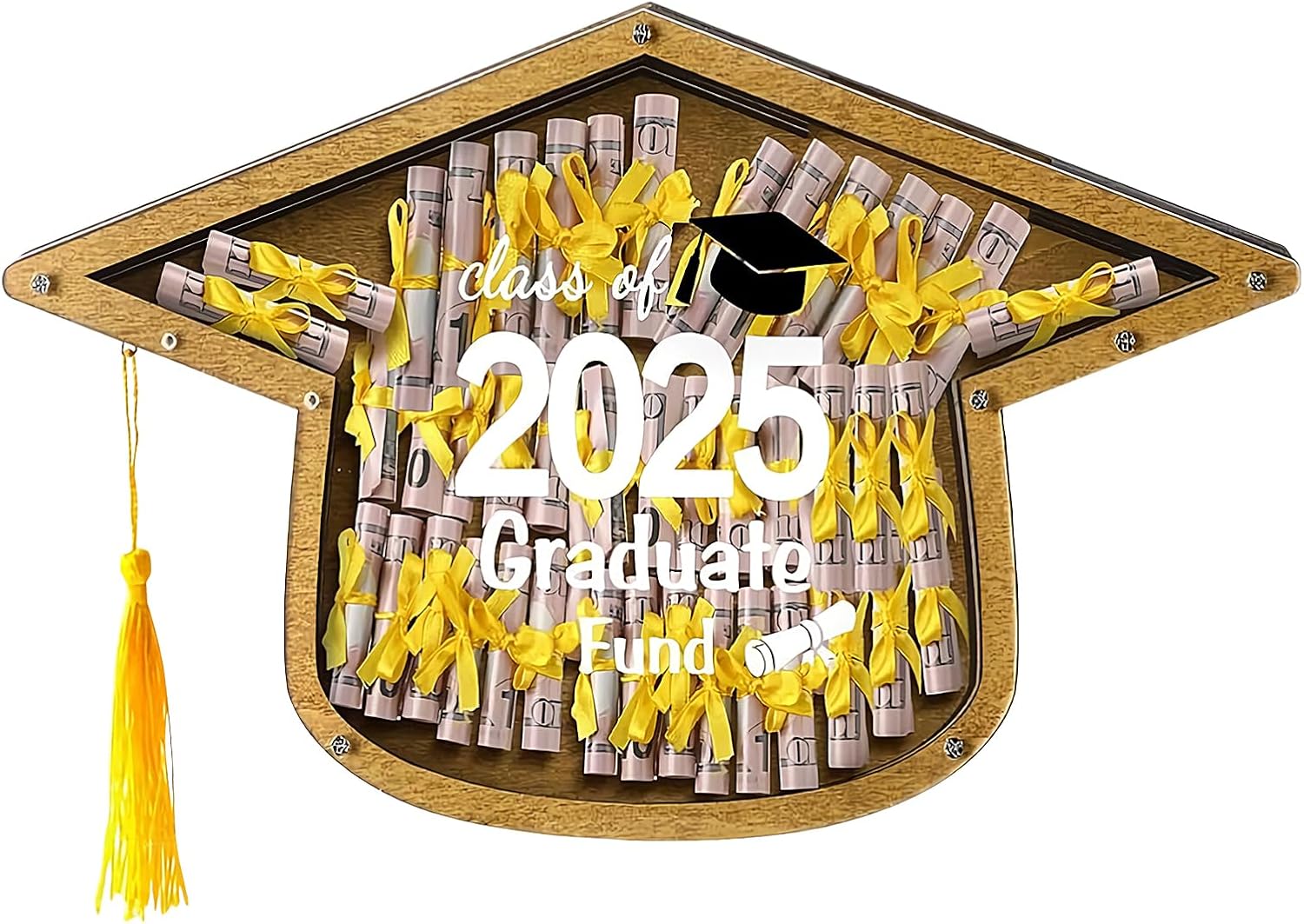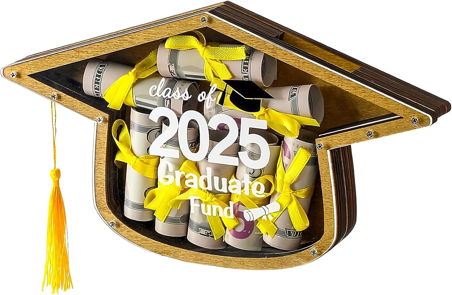 Design Birrete di laurea: evidenziate risultati accademici con questo pezzo a tema di birrette, ideale per segnare progressi educativi aggiungendo un tocco del caratteristico dell'anno 2025 su qualsiasi scrivania Organizer versatile: combina eleganza e utilità. Questa scatola per contanti per laurea offre una conservazione versatile per contanti e gioielli. È un regalo pratico e apprezzato per i laureati che segnano momenti memorabili. Aspetto estetico Premium: struttura di alta qualità con spazio organizzato per contanti, soluzione senza preparazione preliminare per regali spontanei, fodera testurizzata preinstallata semplifica ogni occasione Design solido: combina legno resistente con meccanismo a cerniera rinforzata. Offre resistenza eccezionale e finitura anti-schegge per conservare in modo sicuro ricordi preziosi in questa scatola di denaro per laurea. Souvenir simbolico: celebra la tradizione di laurea con questo souvenir simbolico, progettato con uno speciale girevole che esalta il significato del momento di lanciare la biretta, rendendo la cerimonia ancora più memorabile e piena di simbolismo.