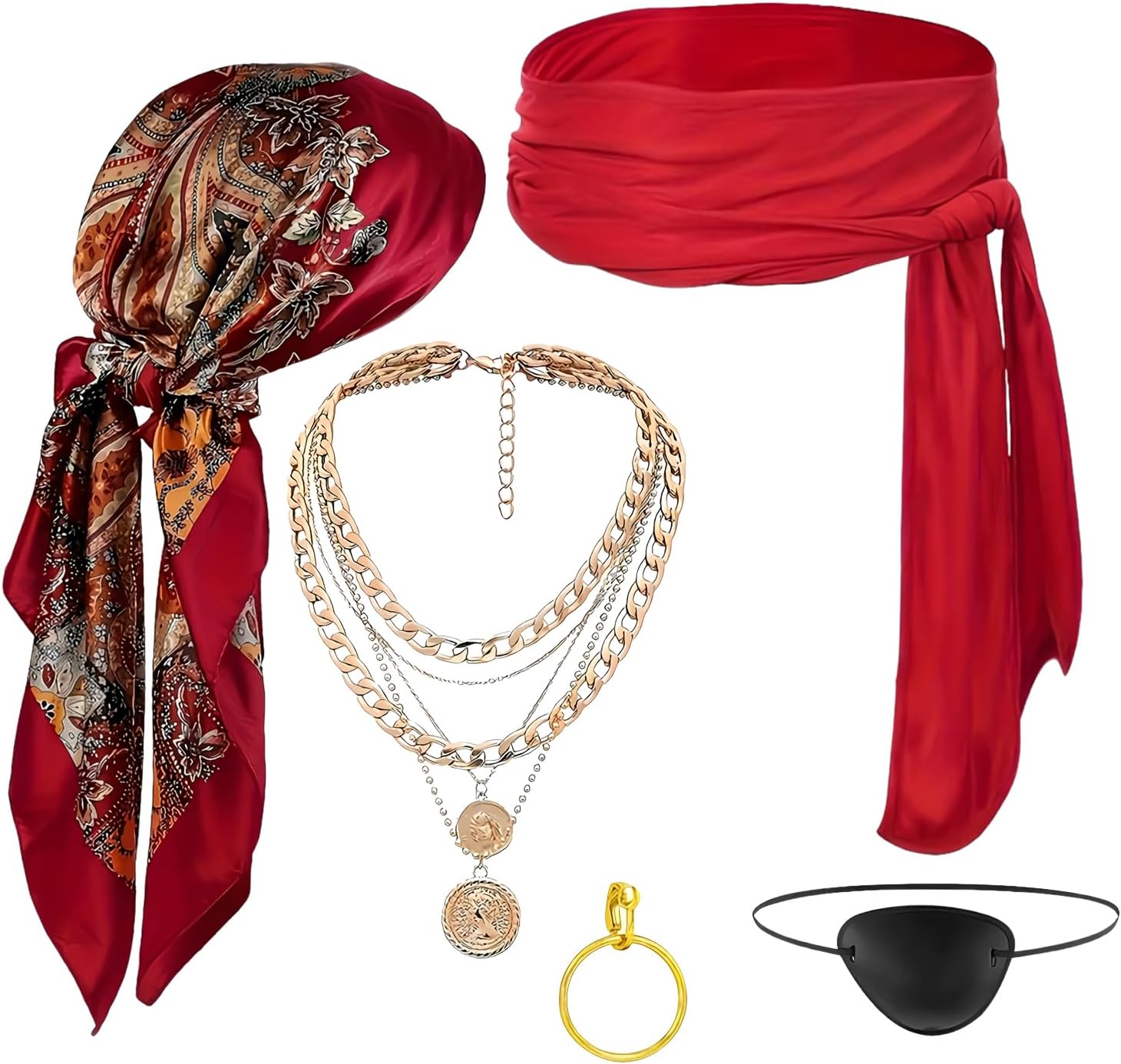 Generico Set Accessori Per Costume Da Pirata - Bandana Pirata Fascia Collana Benda Occhio Orecchino,5 Pezzi Articoli Travestimenti per Scuola Giochi Ruolo Maschere Eventi Carnevale