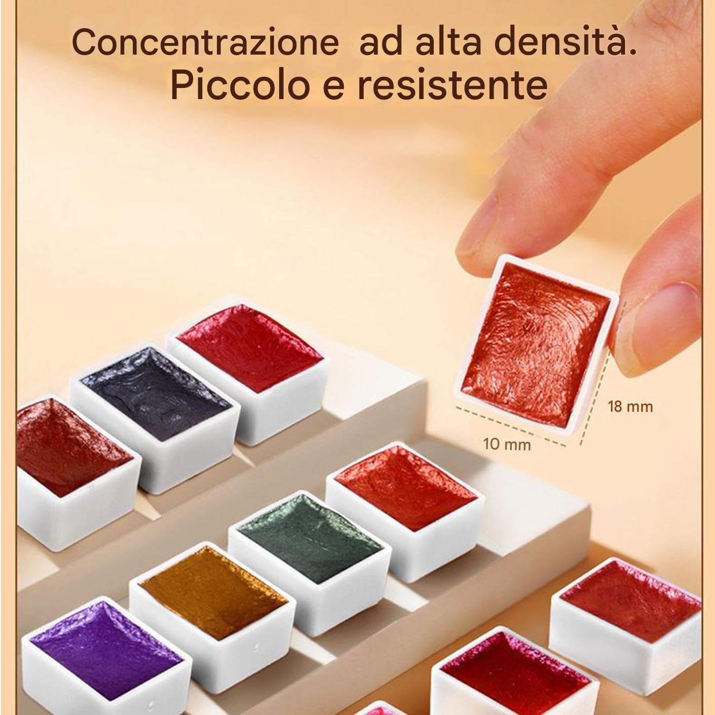 Versatilità d'Uso: I colori ad acqua supportano diverse attività creative come graffiti di viaggio, opere d'arte ispirate da caffè e schizzi all'aperto, rendendoli strumento artistico da aula ideale che migliora apprendimento ed esplorazione in vari ambienti artistici Sviluppo Abilità: I vivaci colori a tempera in questo set aiutano ad accendere immaginazione e capacità artistiche, regalo creativo significativo per feste o compleanni che mantiene i bambini felicemente occupati migliorando le abilità motorie fini Facile da Organizzare: Questo set di acquerelli per adulti offre una soluzione compatta e leggera per mantenere tutti gli strumenti pittorici ordinati senza ingombro, favorendo espressione artistica ovunque senza aggiungere volume alla borsa, grazie al design sottile e pratico Fusione Perlato-Opaco: La miscela di pigmenti perlati e opachi garantisce effetti cromatici stratificati per laboratori e pratica personale. Consente di produrre opere con contrasti unici e grande espressività artistica senza vincoli di tecnica. Impieghi creativi: Grazie a questi acquarelli è possibile esplorare tecniche di colorazione manuale e pittura ad , ideali per dare vita a biglietti artistici, personalizzare journal e aggiungere dettagli unici alla con facilità e precisione in ogni progetto