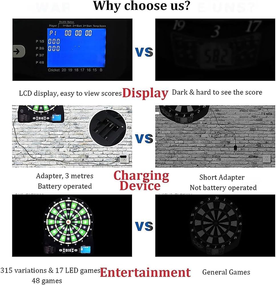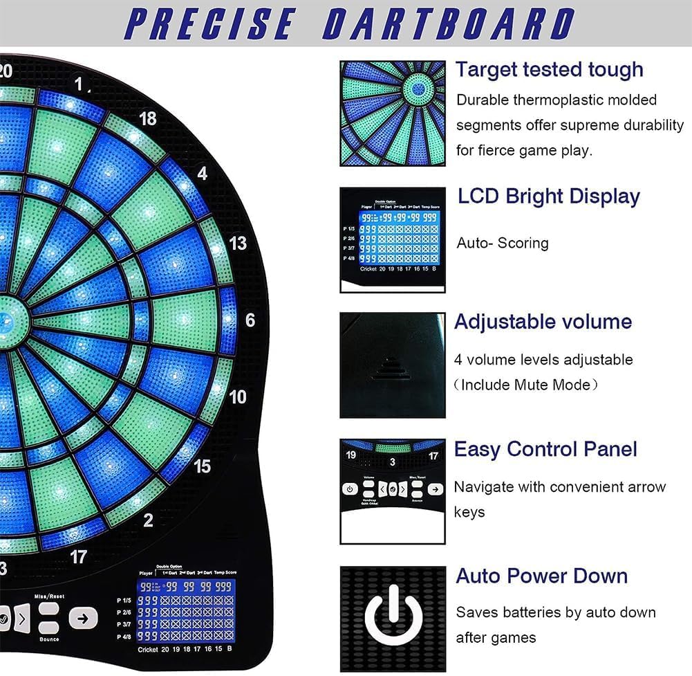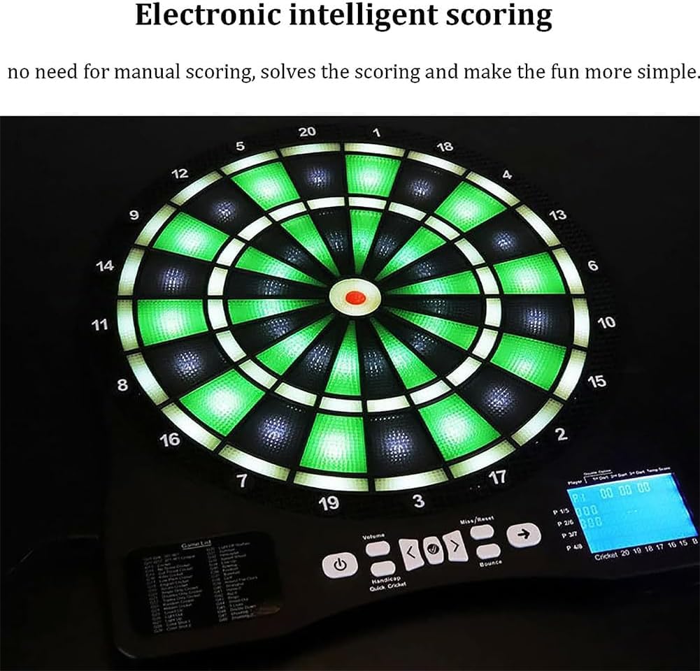 Il bersaglio per freccette fosforescente è dotato di illuminazione a LED ultra luminosa per giocare in ambienti bui. Offre inoltre modalità di gioco speciali progettate specificamente per il gioco notturno, rendendo lesperienza di gioco ancora più coinvolgente. Offre 48 modalità di gioco preimpostate per soddisfare le diverse esigenze dei giocatori, permettendoti di divertirti con la famiglia e gli amici in modo diversificato, rendendo ogni partita emozionante e competitiva. Il set include 6 freccette con punta morbida e 50 spille di sicurezza, rendendolo sicuro e facile da usare sia per bambini che per adulti per giocare in ambienti chiusi. Non richiede fori, il che lo rende la scelta ideale per sale giochi, sale ricreative e altro ancora. Il tabellone segnapunti digitale integrato registra automaticamente i punteggi in diverse modalità di gioco. È facile da usare e richiede 3 batterie AAA (non incluse). Supporta fino a 8 giocatori che giocano contemporaneamente, rendendolo perfetto per riunioni o eventi festivi, consentendo a tutti gli amici e familiari di divertirsi insieme.