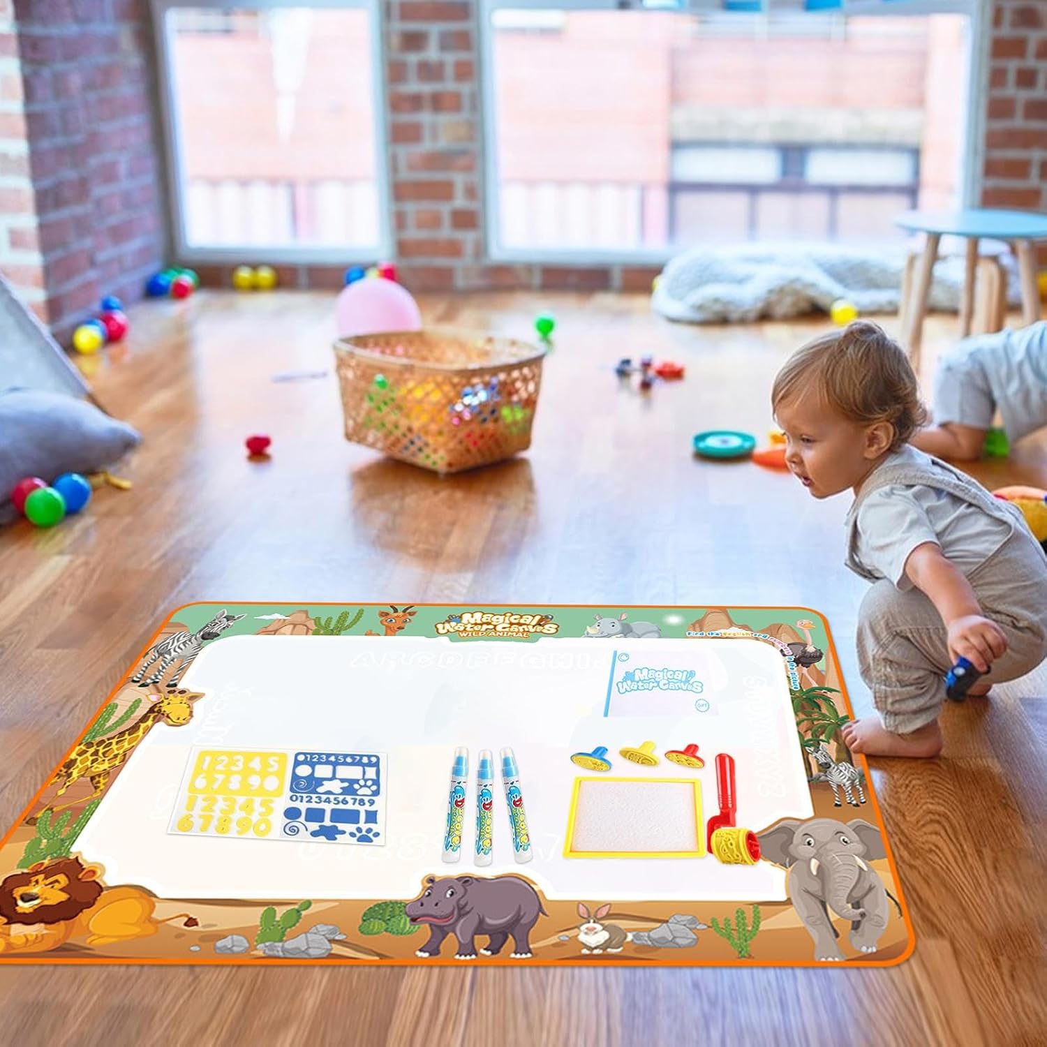 Materiali durevoli: il nostro blocco da disegno per scarabocchi ad acqua è realizzato in tessuto non tessuto di poliestere di alta qualità scelto con cura che garantisce sicurezza e durata. Facile da usare: disegna sul blocco per scarabocchi ad acqua con la penna charm riempita con acqua pulita e guarda la tua d'arte scomparire dopo 5-10 minuti, pronta per una nuova creazione. Non sono necessari inchiostro, vernice o pastelli, acqua. Goditi un divertimento senza inchiostro e senza problemi con i tuoi bambini. Sviluppa abilità: il nostro blocco da disegno per scarabocchi ad acqua aiuta a sviluppare la creatività e l'immaginazione del tuo bambino mentre disegna liberamente sulle superfici grandi e riutilizzabili. Inoltre, promuove il potenziamento di abilità come la coordinazione occhio-mano e la percezione dei colori, offrendo un'attività divertente ed educativa per il tuo bambino. Regalo eccellente: regala una creatività senza disordine con questo blocco da disegno con scarabocchi ad acqua. Non sono necessari inchiostro o vernice, acqua per ore di divertimento. Riutilizzabile e facile da pulire, per vacanze speciali e compleanni. Semplice da trasportare: grazie al suo design leggero e pieghevole, il blocco da disegno per scarabocchi ad acqua può essere comodamente trasportato in zaino, permettendoti di liberare la tua creatività all'aperto.
