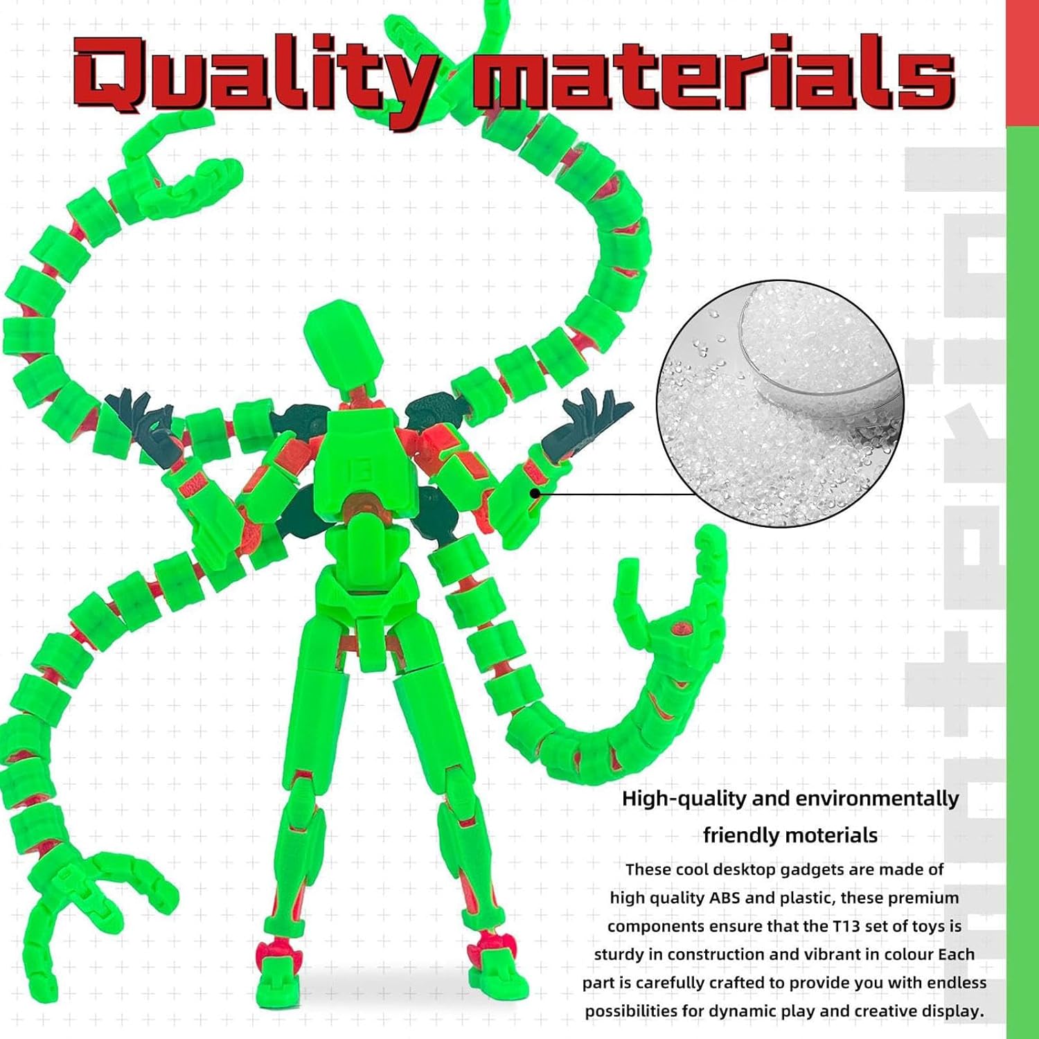 Personalizzazione Avanzata: estende il gioco tramite un supporto regolabile, 3 tipi di mani e 7 strumenti per modificare l'aspetto delle figure articolate per vari scenari Pose dinamiche: le articolazioni mobili consentono molteplici posizioni, promuovendo l'esplorazione creativa nel disegno e nella pittura rafforzando le abilità manuali attraverso il gioco immaginativo di figurazione. Divertimento garantito: statuetta articolata con guarnizioni mobili e accessori multipli che offrono un regalo di qualità per occasioni festive, adatta per collezionisti che richiedono esposizione interattiva Ampia applicazione: progettata per dipingere modelli e decorazioni, questa statuetta articolata svolge un ruolo versatile come accessorio fotografico e supporto per l'apprendimento delle posture. Si adatta a vari contesti di applicazione per ispirare l'espressione artistica grazie alle sue possibilità di posizionamento dinamico. Solidità Garanzia: progettato per resistere alle manipolazioni intensive grazie a materiali sicuri e tecniche di stampa 3D avanzate. Struttura solida e colori vivaci per un gioco duraturo.