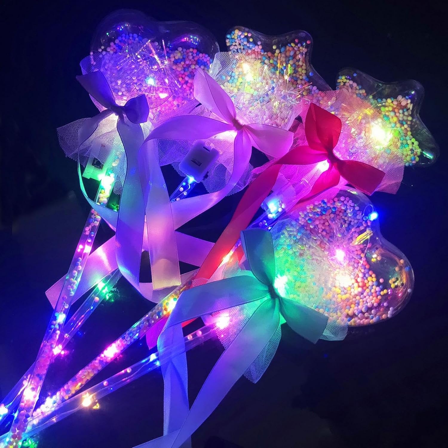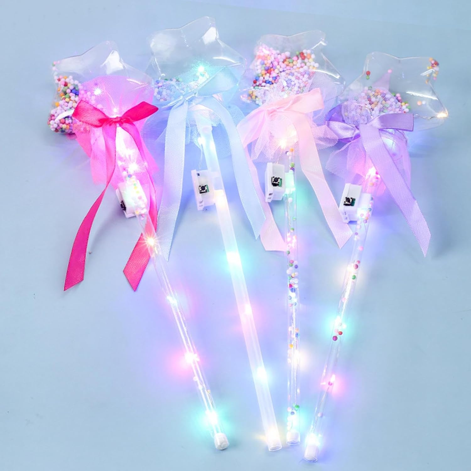 Incantevole bacchetta luminosa: il tuo bambino adorerà questa bacchetta luminosa che può produrre un bagliore mozzafiato al buio. È dotato di LED che cambiano i colori e brillano brillantemente, rendendolo favoloso e affascinante. Scegli in base alle preferenze dei bambini: con varie forme come farfalle, bambole, aceri ricoperti di zucchero e altro, queste bacchette possono far risplendere l'albero di Natale e deliziare i bambini. Comodo da usare: con un breve pulsante su questo bastone fatato, i bambini possono attivare o disattivare l'effetto luminoso e scintillante. È un giocattolo semplice e divertente per bambini di tutte le età. Divertente e decorativo: questa asta luminosa delle fate è un oggetto flessibile che può servire come giocattolo o oggetto di scena per diverse occasioni come festival, feste, spettacoli e altro ancora. Fata non irritante: questa bacchetta luminosa è delicata sulla pelle e sui sensi. È realizzato con materiali innocui e inodore che non causano disagio o allergie. Con facilità e gioia si può sperimentare la fata.