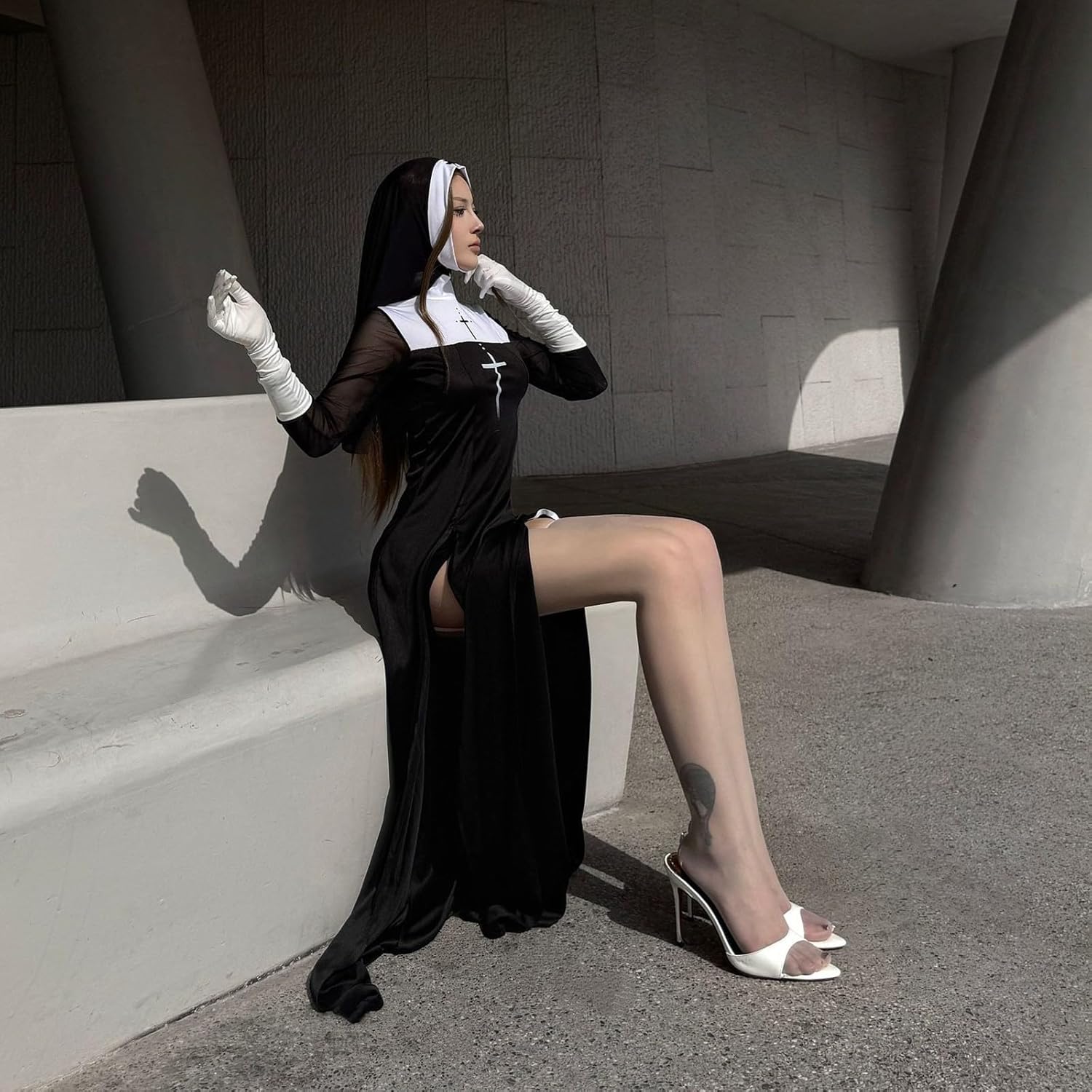 Questo è un set di costumi da suora sexy che si concentra sullo stile scuro e seducente e sul gioco di ruolo, adatto per Halloween, discoteca e carnevale.