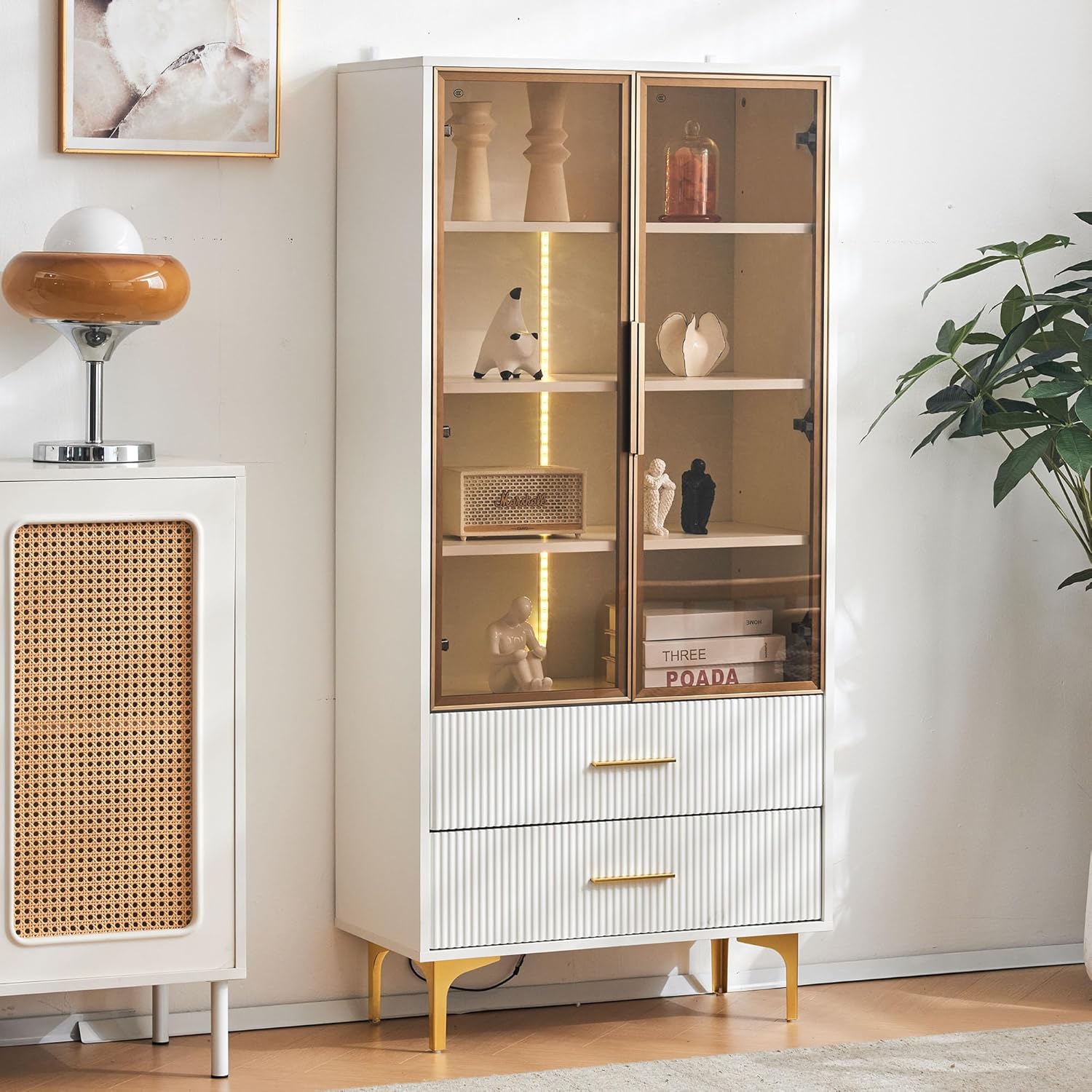 Questa vetrina in vetro combina un design senza tempo con un pratico vantaggio: le ante in vetro color tè e le gambe dorate conferiscono a qualsiasi stanza un tocco di lusso, mentre la struttura in truciolato di alta qualità e le superfici lisce (trattate con tecnologia di aspirazione) garantiscono una lunga durata. Con 70 cm di profondità e 150 cm di altezza, il modello offre un uso ottimale dello spazio senza risultare ingombrante, ideale per oggetti da collezione, oggetti di design o bottiglie di vino in locali residenziali o commerciali. Soluzione di presentazione professionale: LED a 16 colori integrati dietro le porte in vetro mettono in scena mostre come nel museo: scegli il bianco caldo per l'eleganza classica o sequenze di colori dinamici per accenti moderni. L'illuminazione è a risparmio energetico (possibile funzionamento 24/7) e può essere installata in modo pulito grazie alle aperture di gestione dei cavi sul retro. Grazie alla diffusione diffusa della luce vengono ridotti al minimo i riflessi, un'illuminazione ottimale senza abbagliamento per dipinti, orologi o materiali delicati. **【Design pratico per i dettagli】** Le 4 gambe dorate con cuscinetti di protezione del pavimento evitano graffi sul pavimento e garantiscono stabilità anche su piastrelle irregolari. Le ante si chiudono silenziosamente con chiusura magnetica, mentre i bordi arrotondati su cassetti e maniglie garantiscono una presa sicura. La parete posteriore è rinforzata (2,5 cm di spessore) e offre una maggiore stabilità durante il trasporto o il riposizionamento. **【Design pratico per i dettagli】** Le 4 gambe dorate con cuscinetti di protezione per il pavimento evitano graffi sul pavimento e garantiscono stabilità anche su piastrelle irregolari. La parete posteriore è rinforzata (2,5 cm di spessore) e offre una maggiore stabilità durante il trasporto o il riarrangiamento, un sistema ben studiato per famiglie con bambini o aree frequentate.