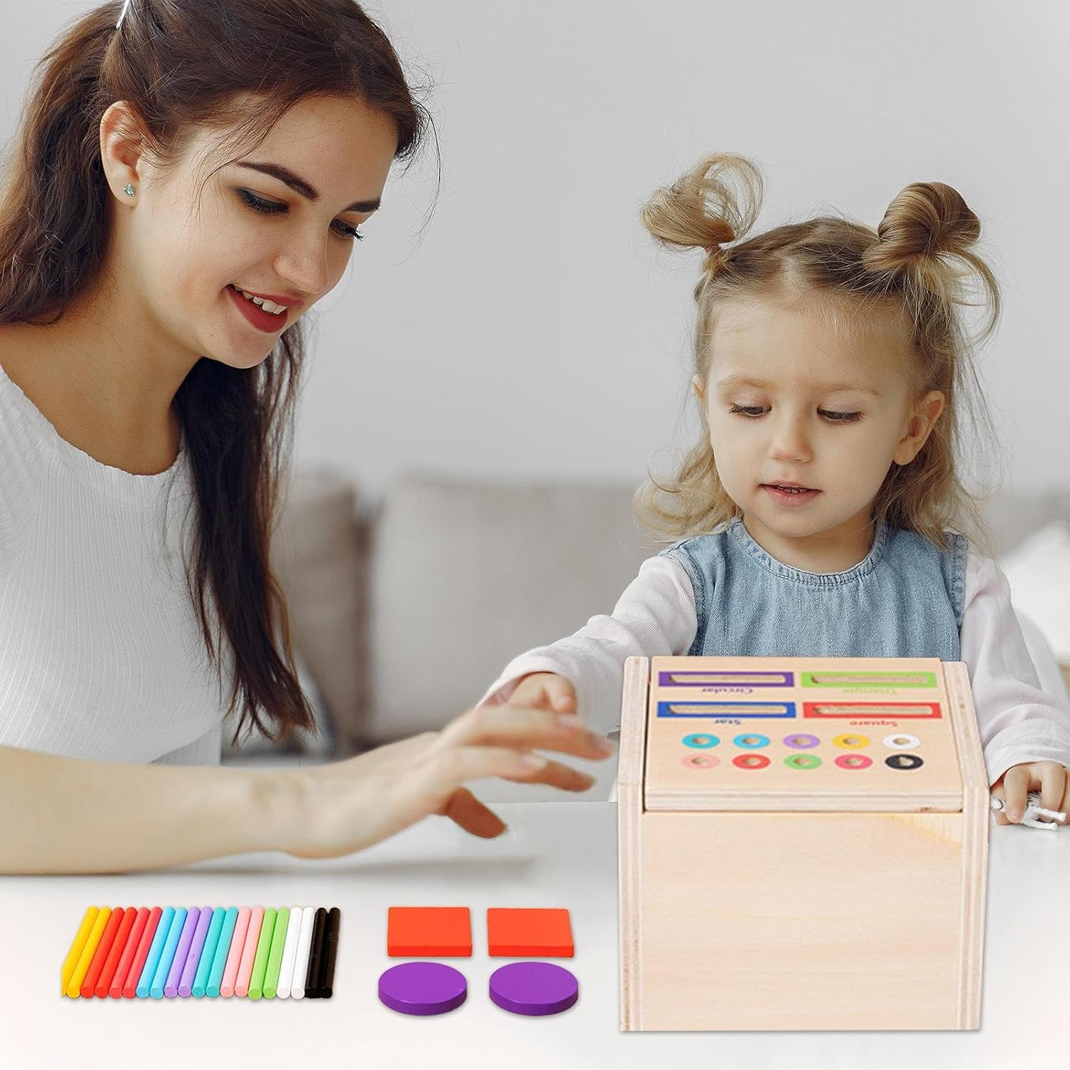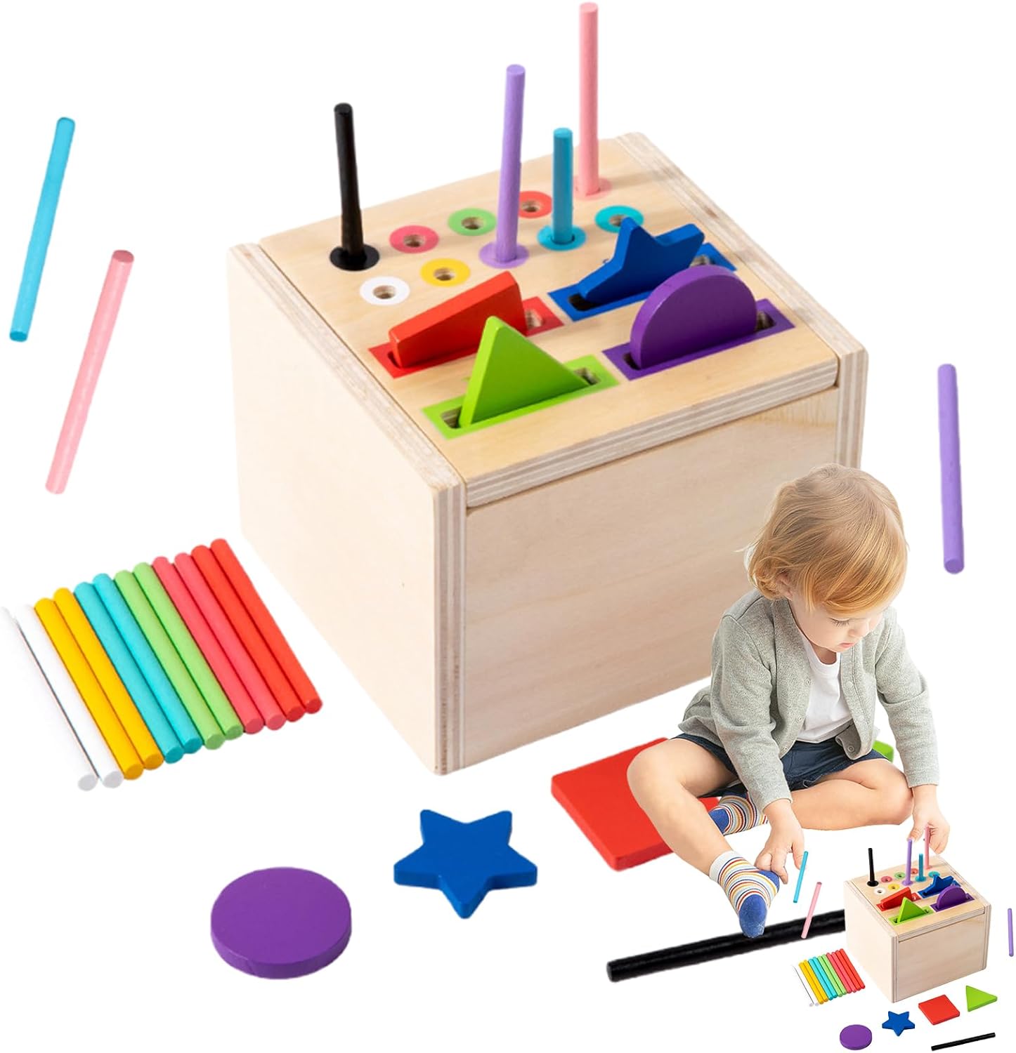 Giocattolo educativo ideale: questo prodotto è progettato per combinare divertimento e istruzione ed è il regalo perfetto per i bambini. Serve come scelta regalo ideale per la festa dei bambini, migliora le capacità cognitive e mantiene i giovani studenti felicemente impegnati nel gioco creativo. Le possibilità di gioco creativo promuovono l'immaginazione e le capacità di risoluzione dei problemi dei bambini in modo divertente, rendendolo uno strumento prezioso per lo sviluppo della prima infanzia. Legno naturale di alta qualità Materiale: questo giocattolo di assortimento di colori è realizzato in robusto legno naturale, che offre un'eccellente durata e sicurezza. Resiste all'uso frequente senza usura ed è completamente privo di sostanze nocive, garantendo un'esperienza di gioco sicura e rilassante per i bambini. La qualità del materiale naturale garantisce un piacere duraturo nel gioco di smistamento, senza preoccupazioni per sostanze nocive o durata. Portatile da usare: la combinazione di dimensioni portatili e struttura leggera assicura che questo giocattolo per la selezione dei colori si adatti facilmente a uno zaino. Consente attività di selezione dei colori senza interruzioni quando e dove si svolgono le avventure del bambino, aiutando così a giocare spontaneamente. Ampia varietà di applicazioni: aiuta il tuo bambino a sviluppare un senso di prestazioni e autostima con questo giocattolo di selezione dei colori. Adatto a bambini di tutte le età, questo giocattolo è perfetto per kite, homeschooling, lezioni prescolari o lunghi viaggi e può essere utilizzato in qualsiasi ambiente per aumentare la fiducia in se stessi. Supporta lo sviluppo personale attraverso esperienze di realizzazione. Costruisci abilità: questo giocattolo supporta lo sviluppo cognitivo attraverso una migliore percezione del colore e una migliore coordinazione occhio-mano, fornisce un approccio giocoso alla costruzione di abilità motorie fini e capacità di pensiero logico. Promuove efficacemente l'apprendimento attraverso attività divertenti che sviluppano abilità di riconoscimento del colore e risoluzione dei problemi, e aiuta i bambini ad espandere naturalmente le loro capacità.
