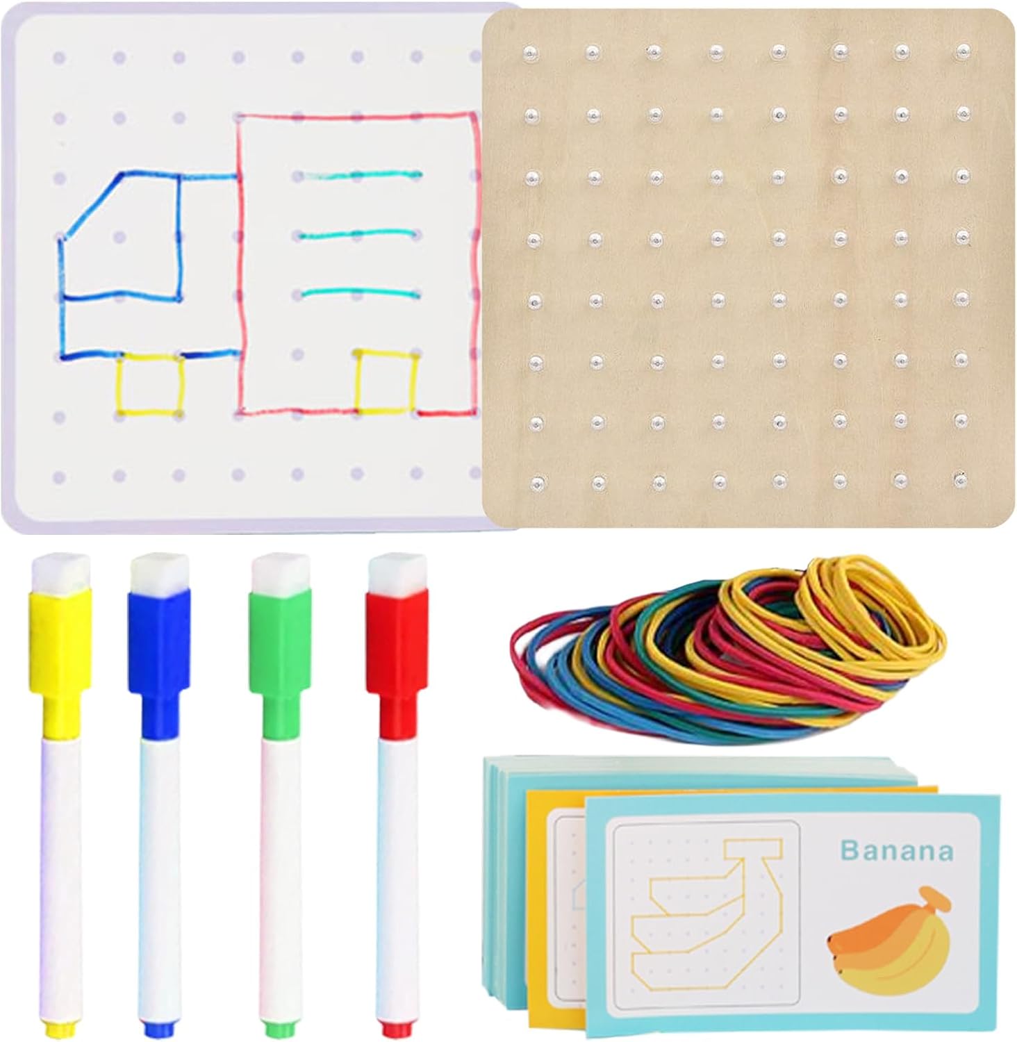 【Libertà e sicurezza】 Abbiamo progettato con cura 64 chiodi rotondi, l'elastico di Geo Boards For Classroom è abbastanza forte e il design degli angoli arrotondati consente ai bambini di giocare liberamente e in sicurezza 【Pratica delle abilità motorie fini】 Costruisci forme diverse sulla tavola geometrica in base alle carte , Geoboards With Rubber Bands è una grande opportunità per i bambini per promuovere le capacità motorie e la coordinazione occhio-mano 【Istruzione e intrattenimento】 Geo Board Set è adatto a bambini di età compresa tra 3 e 6 anni, costruisce le abilità di differenza di colore e dimensioni delle forme, aiuta i bambini a imparare forme, colori, contare 【Pensiero astratto】 Non solo le carte di design di Rubber Band Board sono progettate per avere forme geometriche astratte sul davanti e sul retro. E la giustapposizione deliberata aiuta i bambini a sviluppare il pensiero geometrico astratto. 【Multifunzionale】 Geoboard in legno non solo consente ai bambini di imparare la geometria, ma consente anche ai bambini di imparare il vocabolario sugli oggetti di uso quotidiano, come animali, veicoli, verdure, ecc.