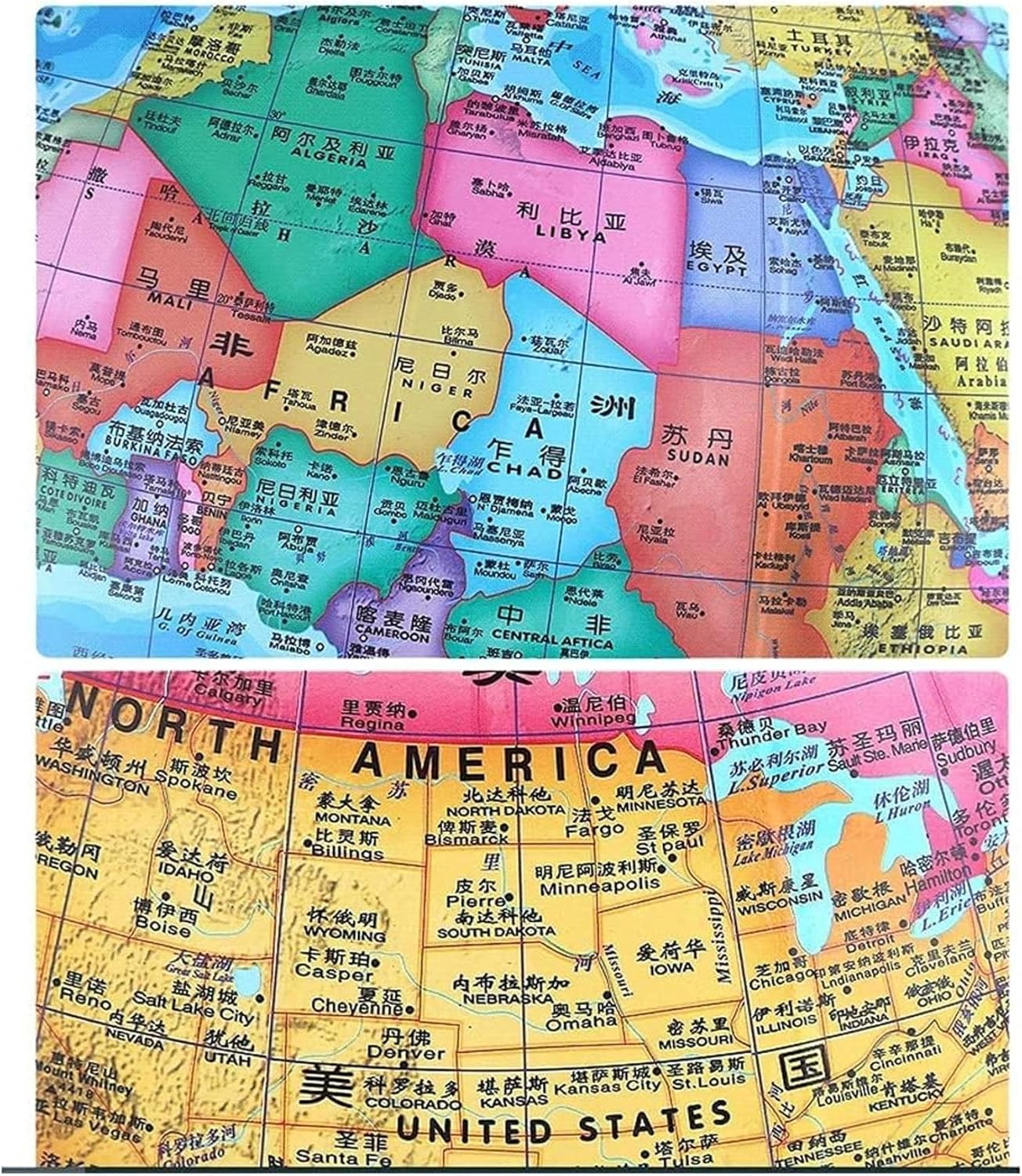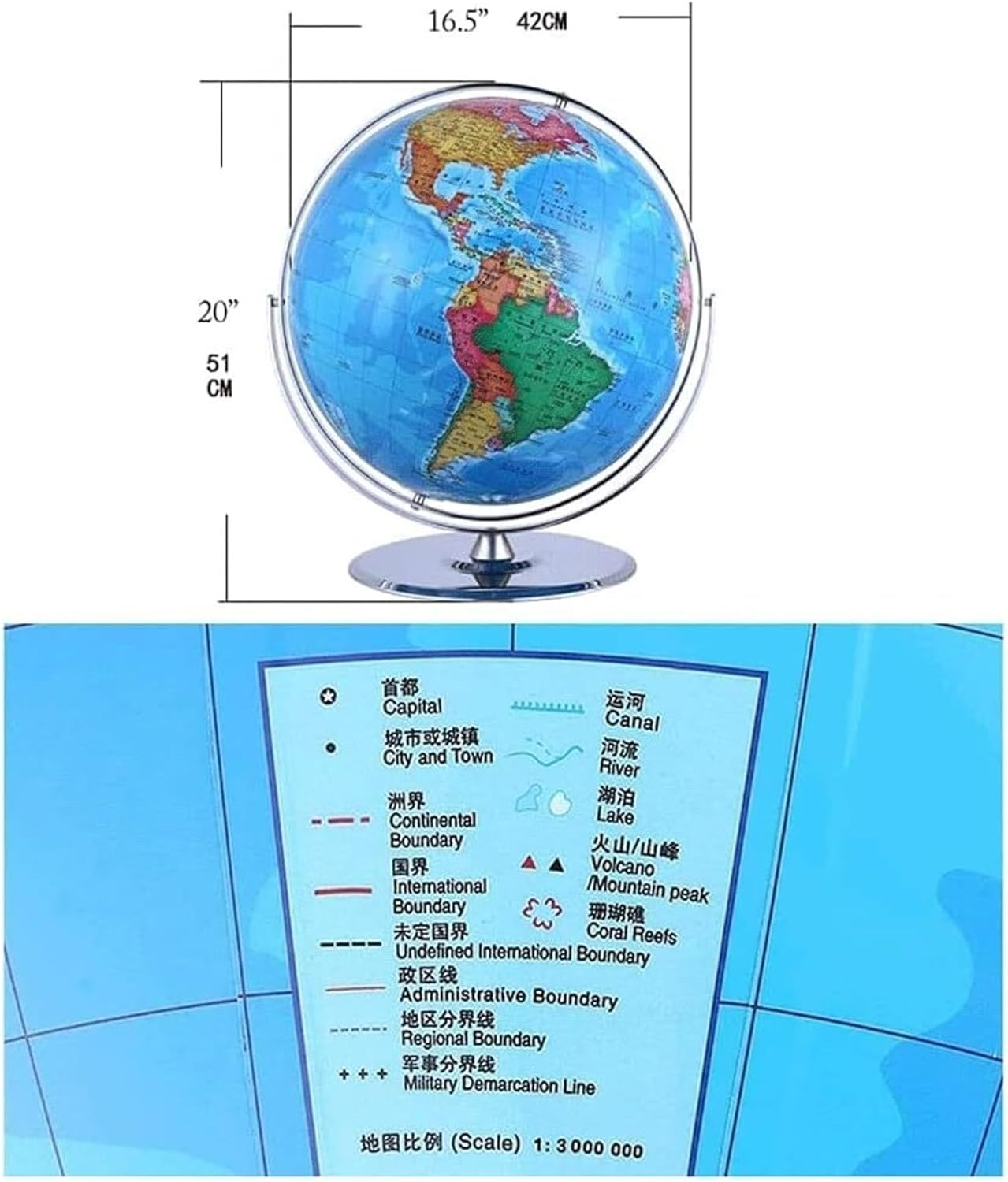 I mappamondi da tavolo aggiungono un tocco senza tempo di raffinatezza e curiosità intellettuale a qualsiasi arredamento domestico o d'ufficio. Acciaio inossidabile, telaio a sfera: telaio a sfera bimetallico, materiale di base: acciaio inossidabile, metodo di rotazione: trazione manuale. La fodera è realizzata con cura in acciaio inossidabile importato e la stampa delle informazioni geografiche a nove colori proviene dalla Germania. Il globo politico da 42 cm/16,5 pollici con oceano blu è perfetto per l'uso domestico o scolastico. L'altezza complessiva è di 51 cm/20 pollici Base in acciaio inossidabile lucidato, rotazione di 720°, fissaggio a vite non facile da staccare, indicatori di marcatura precisi, ricco contenuto didattico, base in metallo, bella atmosfera e supporto stabile.