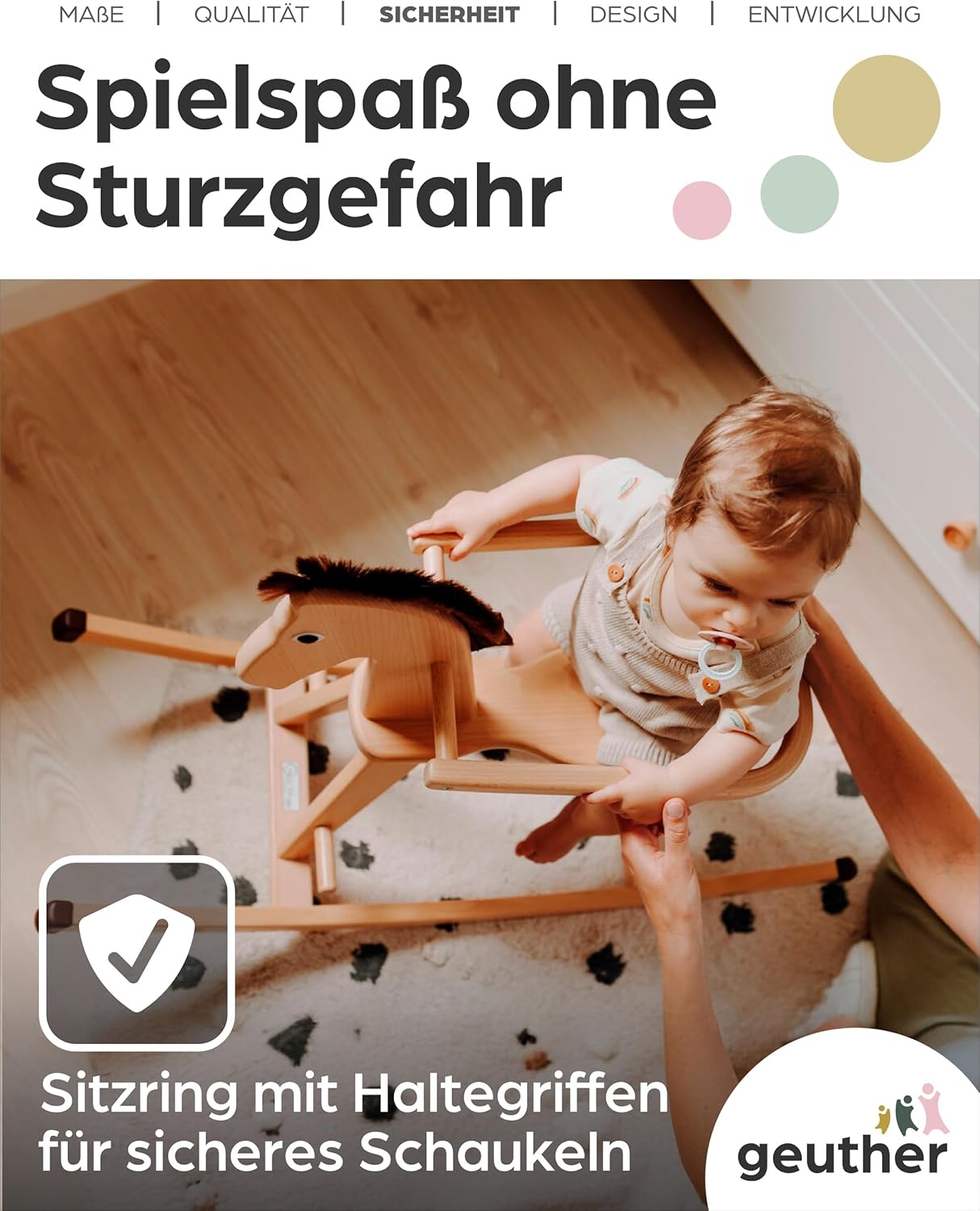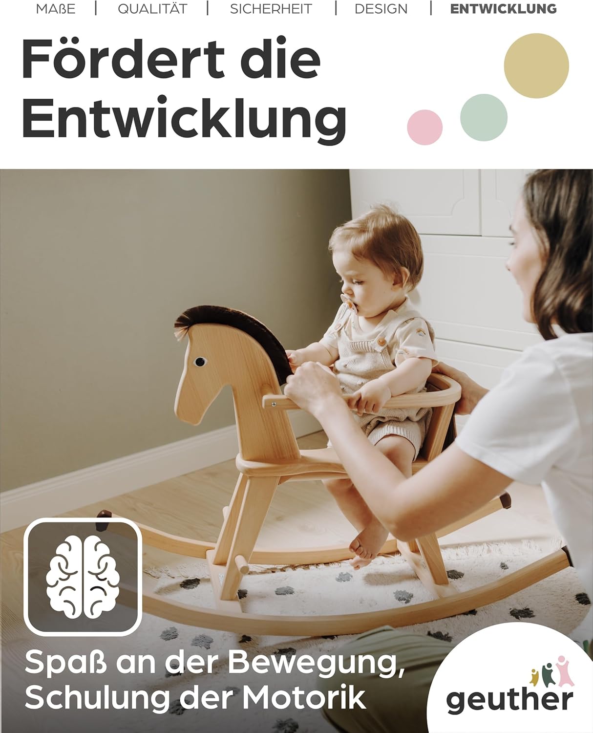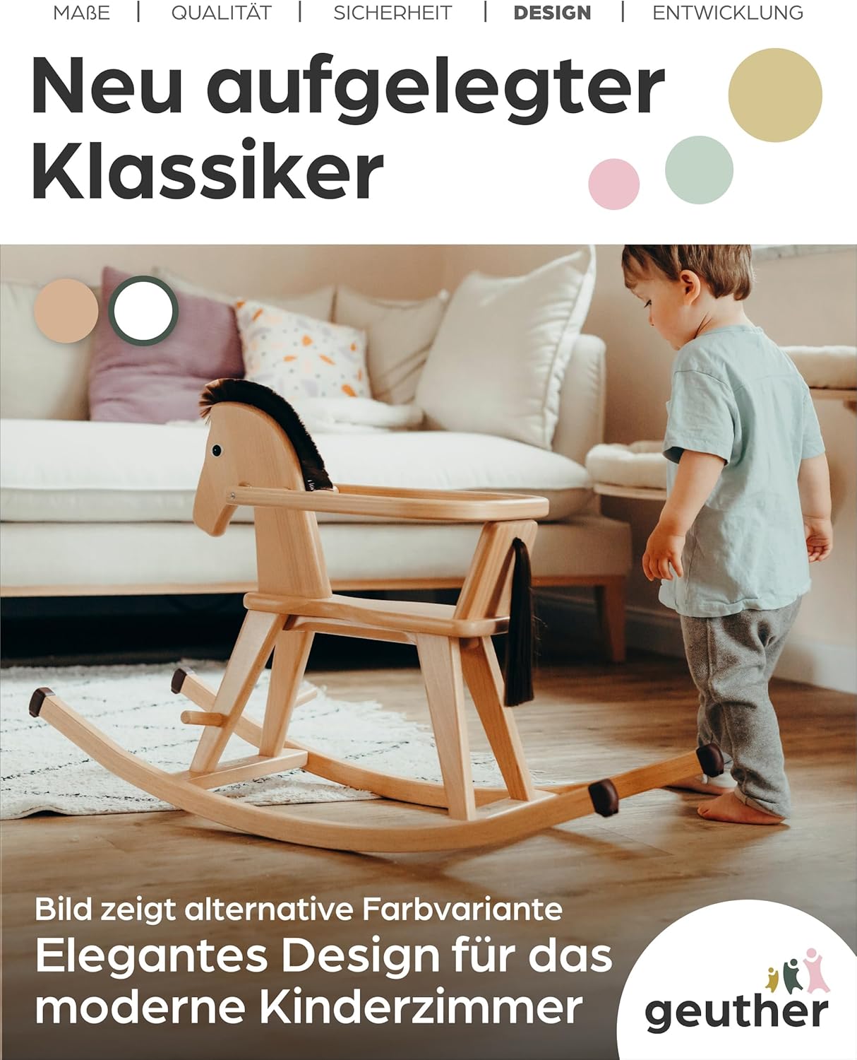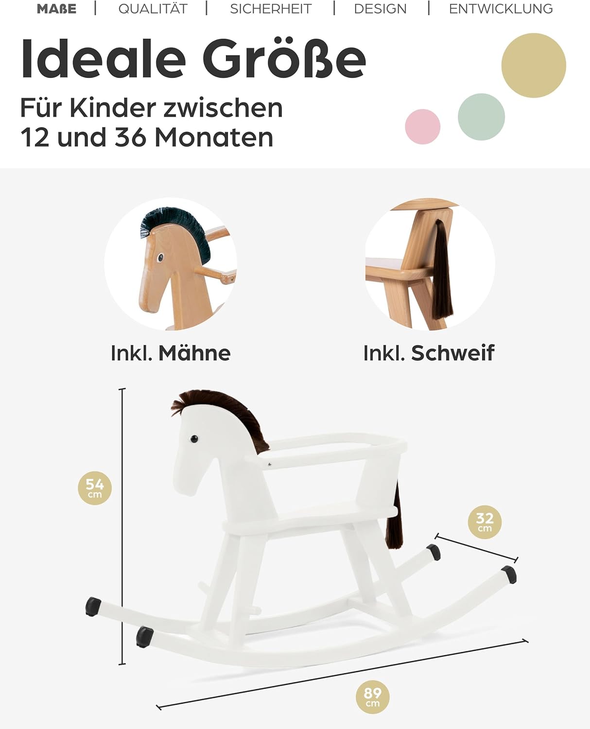 Un cavallo di legno non dovrebbe mancare nella stanza di nessun bambino: L'emozionante cavallo a dondolo è stato a lungo una bella e divertente tradizione nella stanza dei bambini a casa! Questo giocattolo di legno collega grandi e piccini in un modo particolarmente bello! Giocattolo per bambini particolarmente sicuro: la sdraietta è dotata di un importante anello di protezione, che protegge in modo ottimale il bambino dalle cadute quando gioca con l'animale a dondolo. Se necessario, l'anello può anche essere rimosso dal giocattolo per bambini. Incoraggiate i vostri figli nel miglior modo possibile: Il cavallo su cui sedersi con coda autentica e bella criniera è sempre stato uno dei giocattoli per bambini più popolari, perché combina idealmente il divertimento nel movimento e l'allenamento delle capacità motorie. Materiali di alta qualità e sistema ben congegnato: il dondolo per bambini con maniglie è fatto di legno robusto e di alta qualità, che è particolarmente durevole e quindi crea anche grandi ricordi d'infanzia per i fratelli più piccoli. Ambito di fornitura: Geuther rocking horse HALLA - cavallo di legno con maniglie - robusto dondolo per bambini con anello di protezione e poggiapiedi - robusto giocattolo di legno - disponibile in diversi colori - Max. Carico massimo: 25 kg - Colore: bianco
