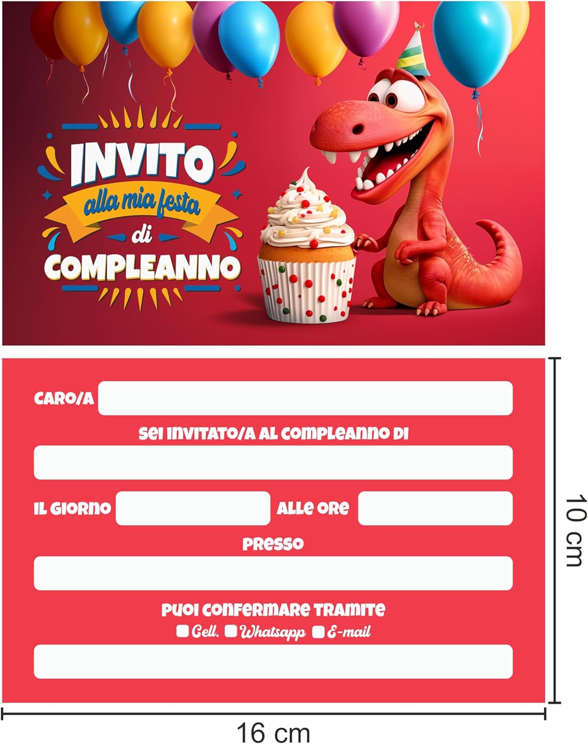🦖 Tema Dinosauro Allegro: Inviti per feste di compleanno con un simpatico dinosauro che promette un'avventura preistorica e tanto divertimento. 🎈 Colori Vivaci e Grafiche Dinamiche: Un design accattivante con colori brillanti e palloncini festosi che catturano l'attenzione e l'immaginazione. 🍰 Dettagli Che Deliziano: Un cupcake festivo accanto al nostro amichevole dinosauro aggiunge un dolce tocco di allegria. ✍️ Facilità di Scrittura: Con un retro pratico e non plastificato, è semplice aggiungere i dettagli della festa. 📏 Dimensioni Perfette per le Informazioni: Inviti di 16 cm x 10 cm che offrono ampio spazio per inserire tutte le informazioni essenziali. 📲 Opzioni di Conferma Multiple: Fornisce spazio per i dettagli di conferma tramite cellulare, WhatsApp o e-mail. 📦 Pack da 20: Una confezione da 20 inviti per assicurarti di avere tutti i piccoli esploratori invitati alla tua festa.