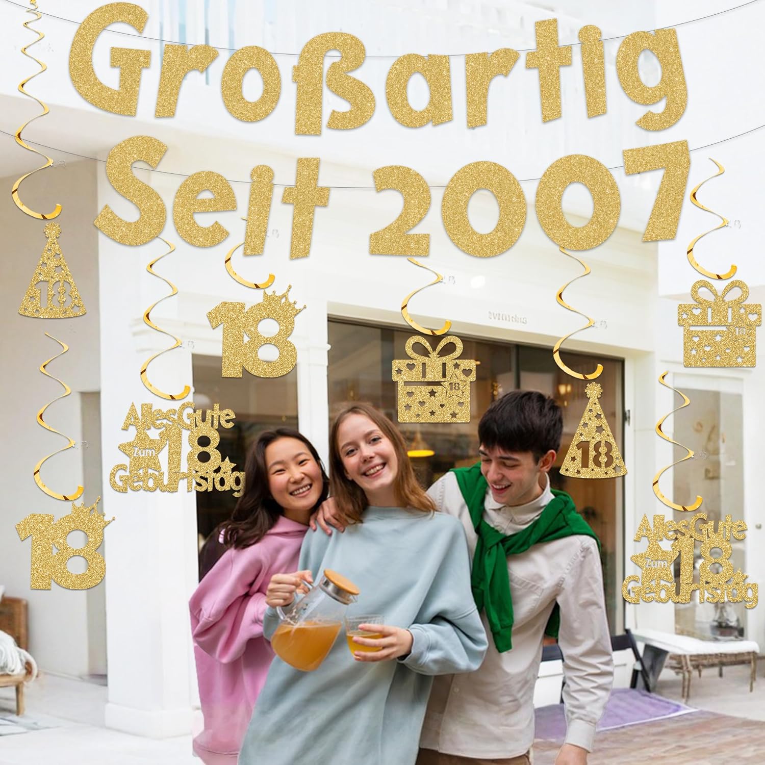 Decorazione per il 18° compleanno: riceverai 1 striscione di alta qualità dal 2007 e 8 decorazioni a spirale pendenti (da montare), perfette per la festa del 18° compleanno di ragazzi e ragazze e altre scene commemorative. Compleanno indimenticabile: questo set di ghirlande per il 18° compleanno ha un eccellente effetto decorativo e può anche ravvivare l'atmosfera delle riunioni di famiglia, creando ricordi indimenticabili per il 18° compleanno di tuo figlio. Materiali di alta qualità: sono realizzate la ghirlanda del 18° compleanno e la decorazione da appendere. di carta glitterata brillante e di alta qualità. La stampa in oro di alta qualità e la stampa a caldo creano un'atmosfera vivace ed elegante. Facile da usare: assemblare la ghirlanda di compleanno e appendere il ricciolo richiede solo pochi minuti. Infila il nastro attraverso la ghirlanda, collega la spirale e il cartone con l'anello di plastica e appendili ovunque. Versatile: gli striscioni e la ghirlanda in oro lucido sono adatti per la decorazione di pareti, scrivanie e giardini, adatti per diciottesimo compleanno, anniversari e allestimenti per feste, aggiungendo temperamento alla moda e un'atmosfera allegra