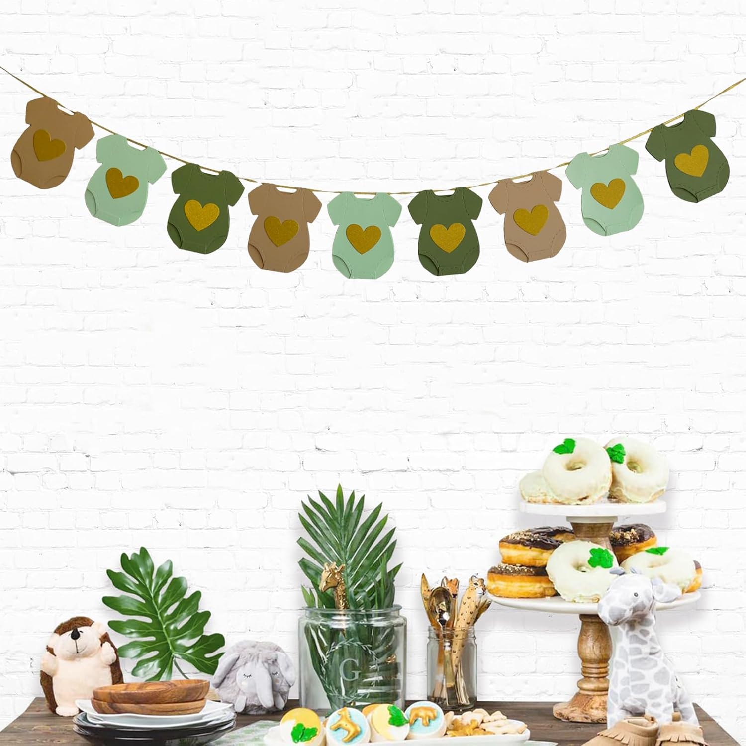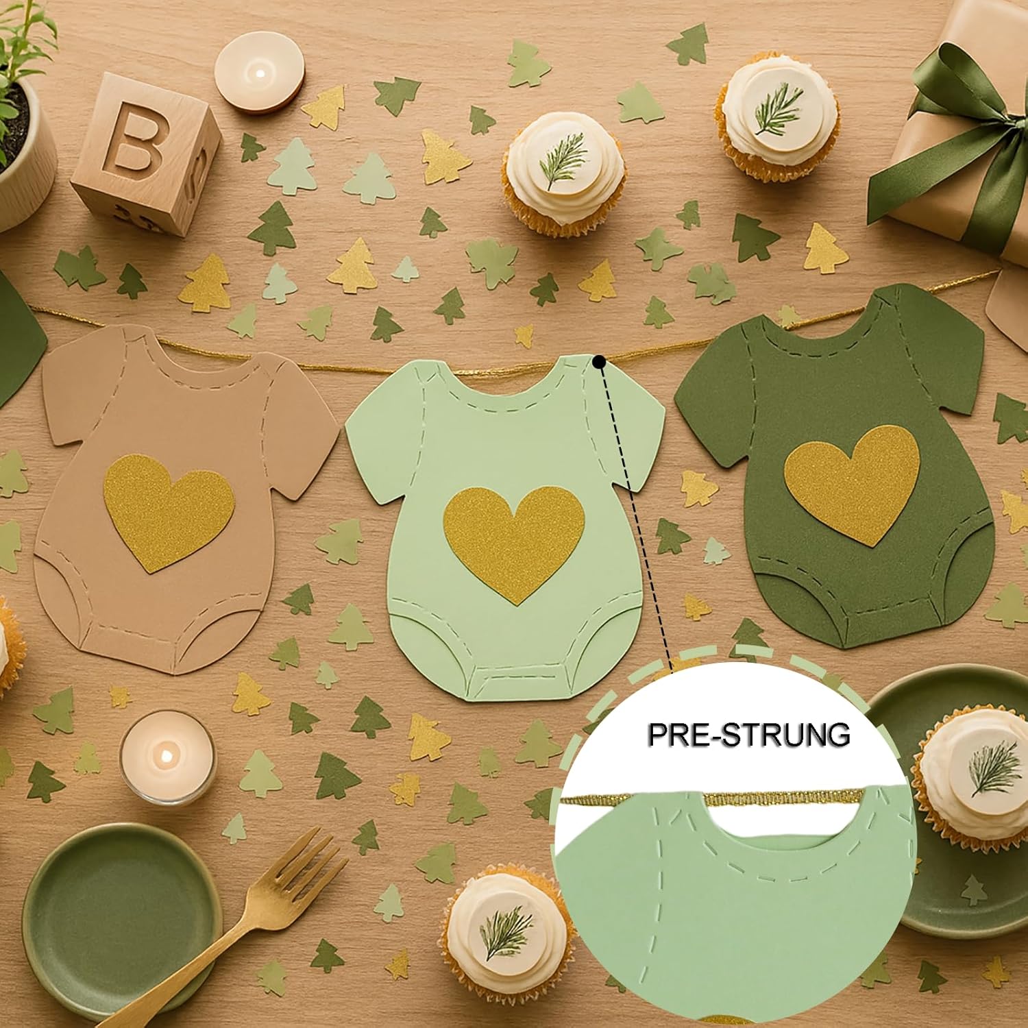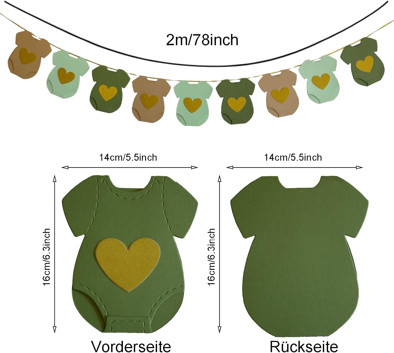 Ghirlanda preassemblata per baby shower: nessun assemblaggio richiesto, pronta per essere appesa immediatamente. Design adorabile: forma di body da neonato con un cuore dorato scintillante, simbolo di dolcezza e amore. Stile neutro e naturale – Colori verde, kaki e beige adatti sia a ragazze che a ragazzi. Materiali di qualità: cartoncino spesso, stampato su un lato con effetto glitter, resistente e riutilizzabile. Occasioni applicabili: perfetto per Baby Shower, Gender Reveal, Welcome Baby, Baby Shower o arredamento della stanza dei bambini.