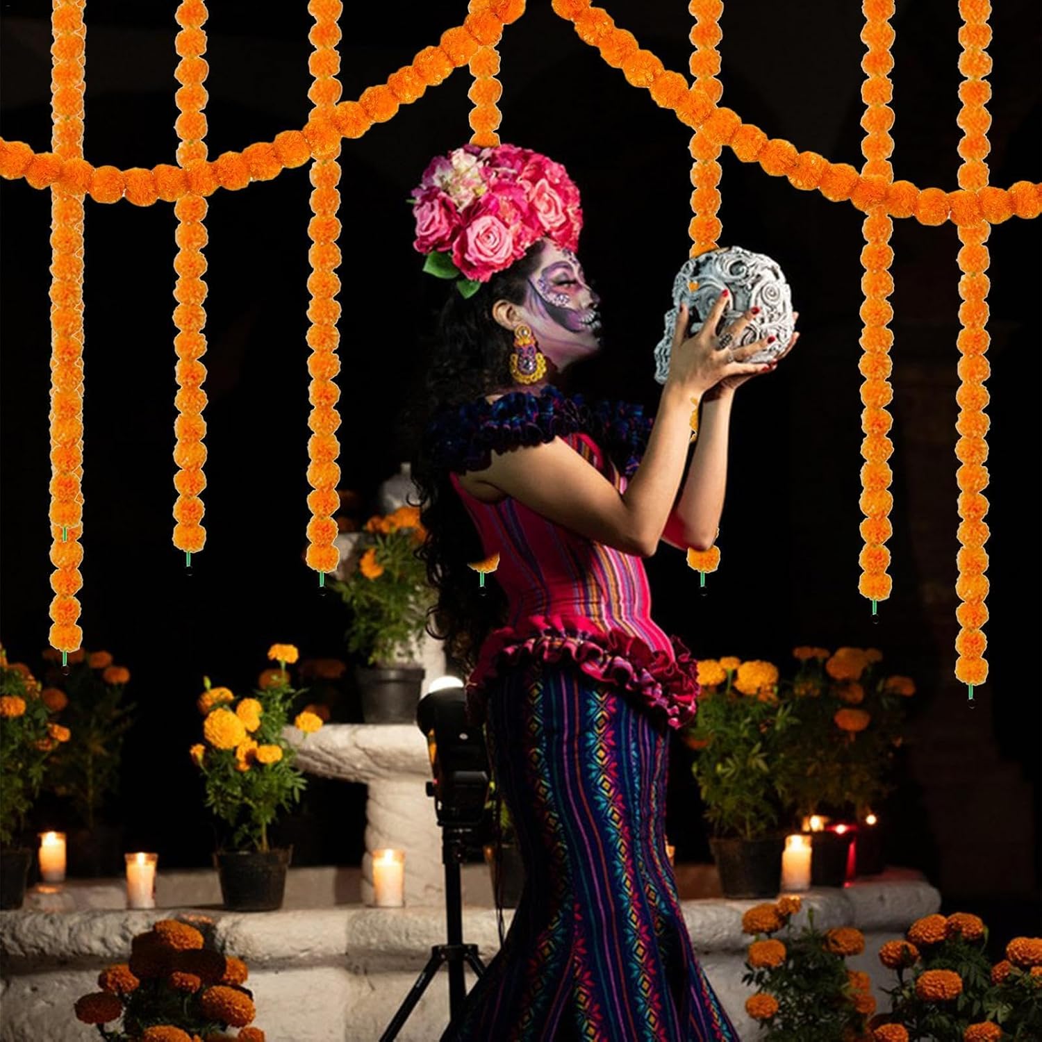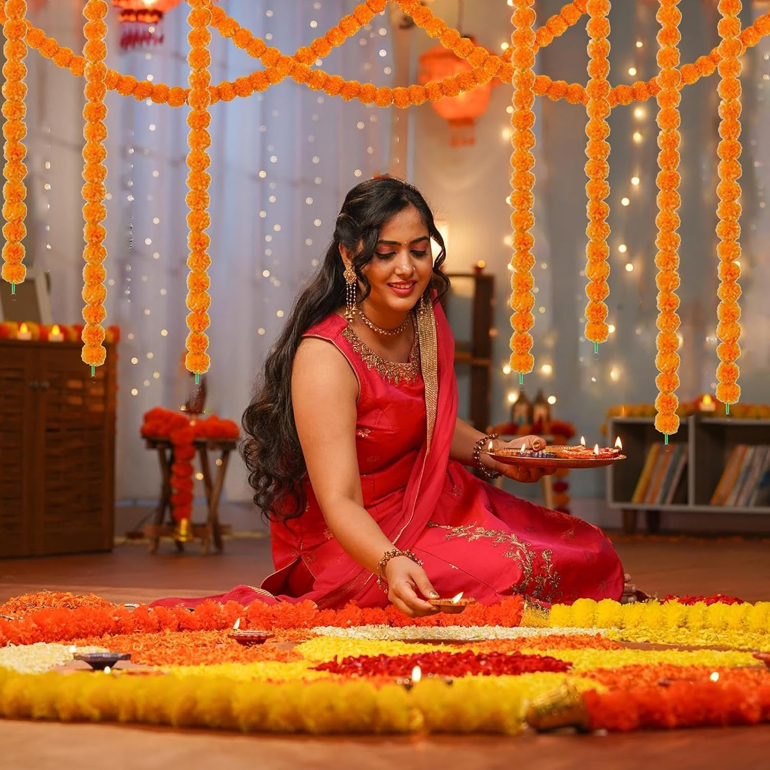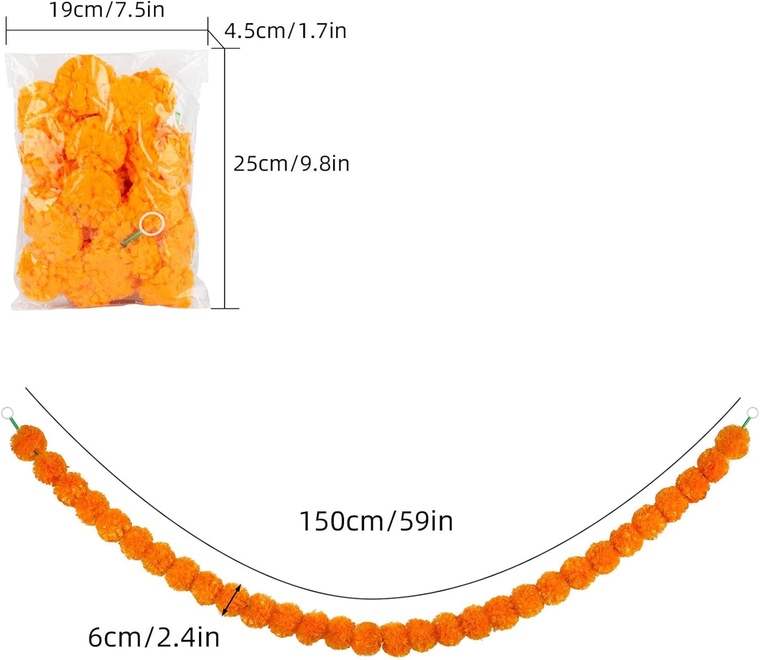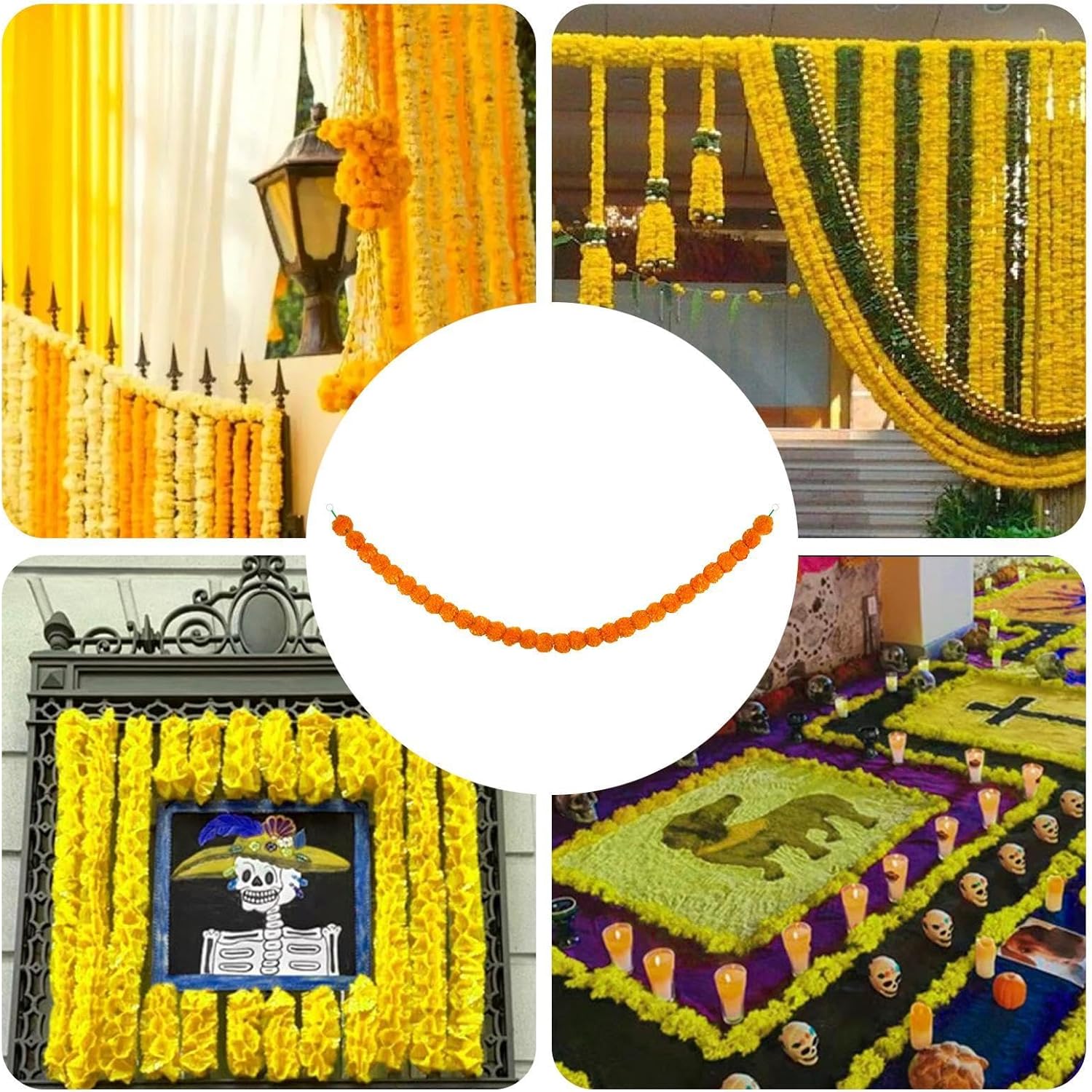 Migliora la tua decorazione: questa ghirlanda di calendule con la sua lunga apertura di 1,5 m è perfetta per decorare la tua casa o lo spazio di un evento ed è facile da appendere a porte, finestre o altrove Trasformazione festosa: trasforma il tuo spazio in un paradiso dei festival con la nostra ghirlanda di calendule con calendule vivaci e colorate che aggiungono un tocco vivace, perfetta per Diwali, il Giorno dei Morti o altre occasioni speciali Fascino festivo: la nostra ghirlanda di calendule artificiale è la decorazione ideale per ogni occasione. Con il suo colore brillante e la forma perfetta, aggiunge un tocco di bellezza e festività che durerà per anni e renderà le tue celebrazioni indimenticabili. Stili multipli: con 3 stili tra cui scegliere, la nostra ghirlanda di calendula è perfetta per vari scopi di eventi. Decorazioni semplici e sontuose per stanze di grandi dimensioni, che ti offrono opzioni versatili per illuminare il tuo spazio. Accenti a campana aggiungono gioia festosa: ravviva il tuo arredamento con la nostra ghirlanda di calendule con accenti a campana, che aggiunge un tocco affascinante e stravagante ed è perfetta per aggiungere un suono delicato e rilassante e un'atmosfera festosa a qualsiasi evento.