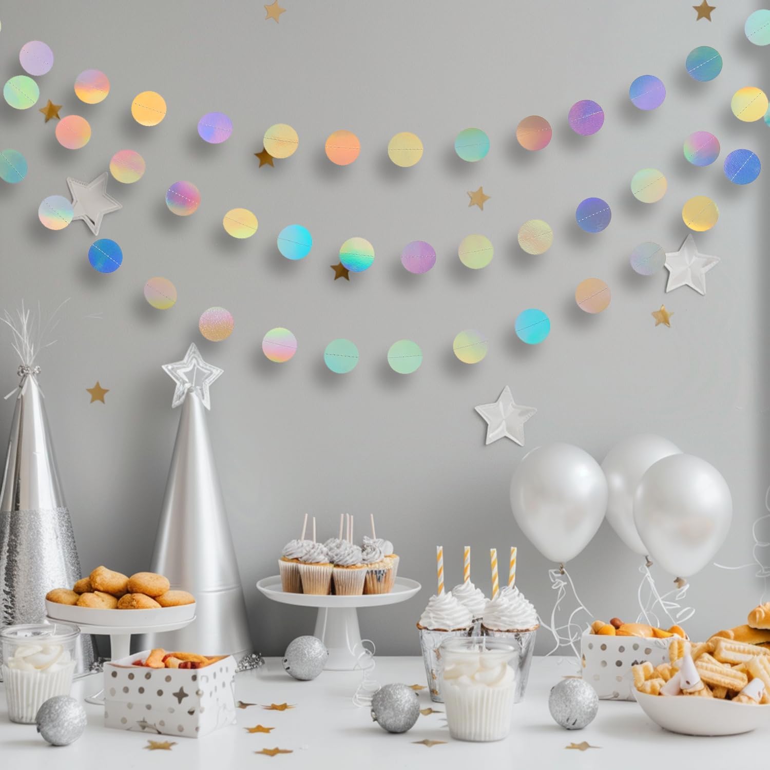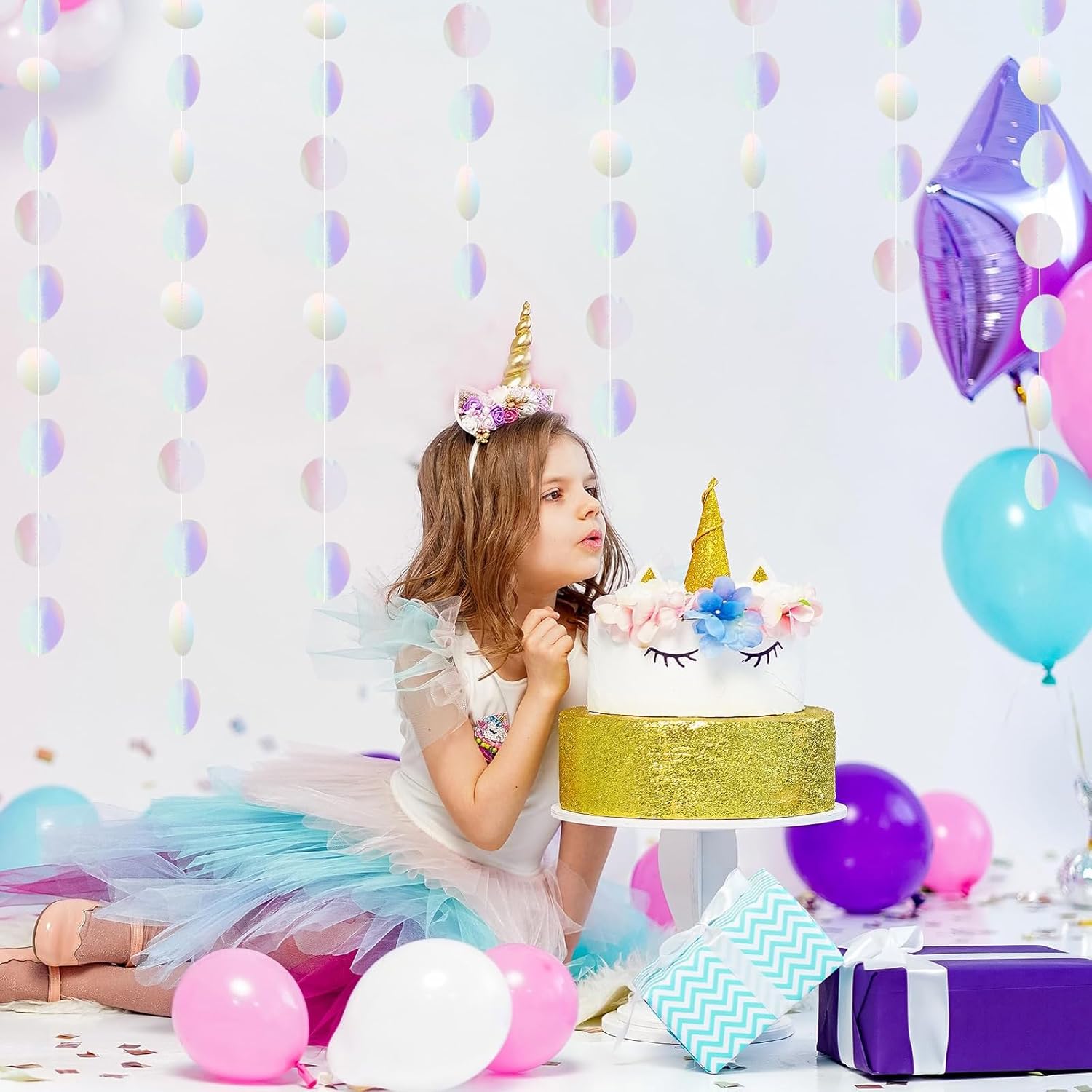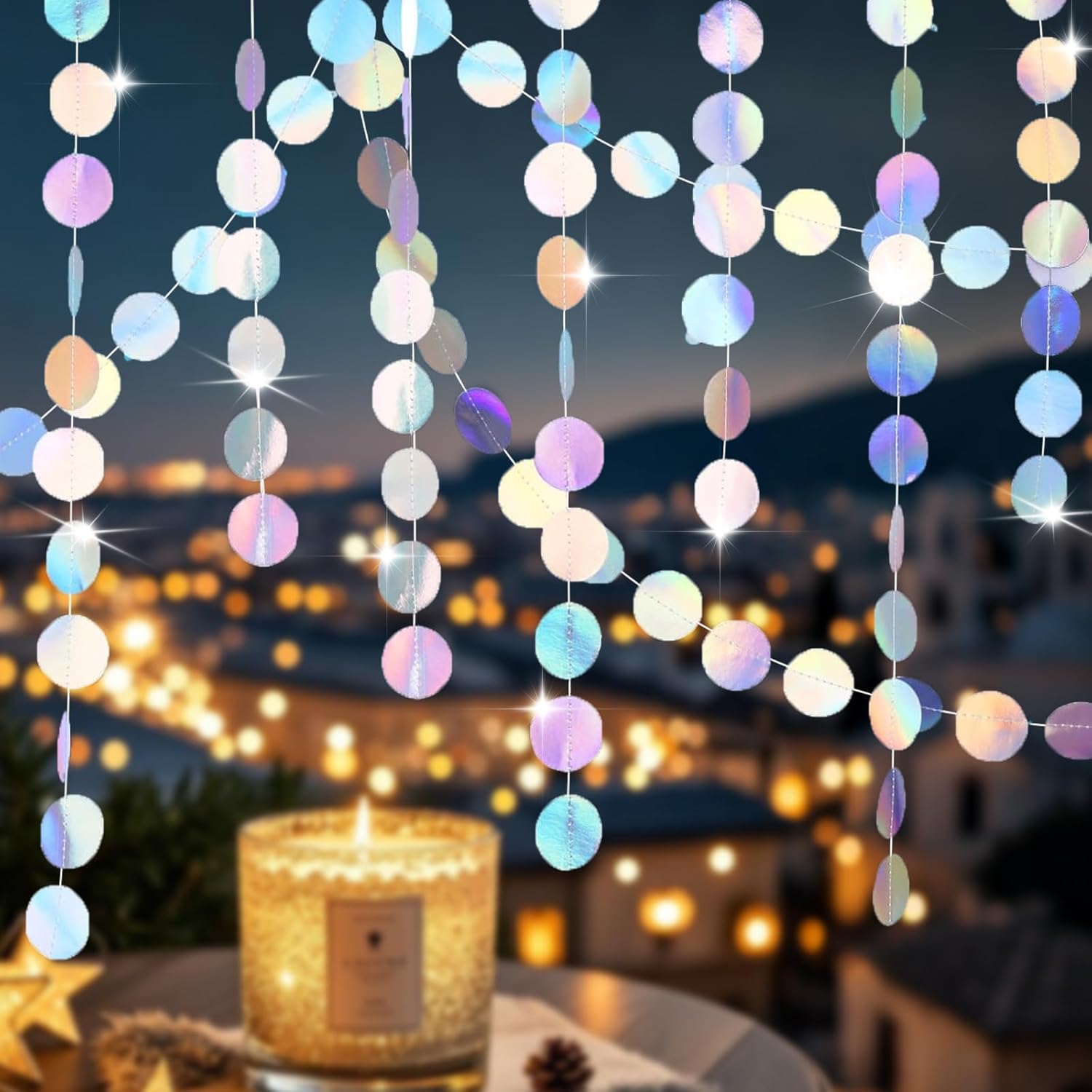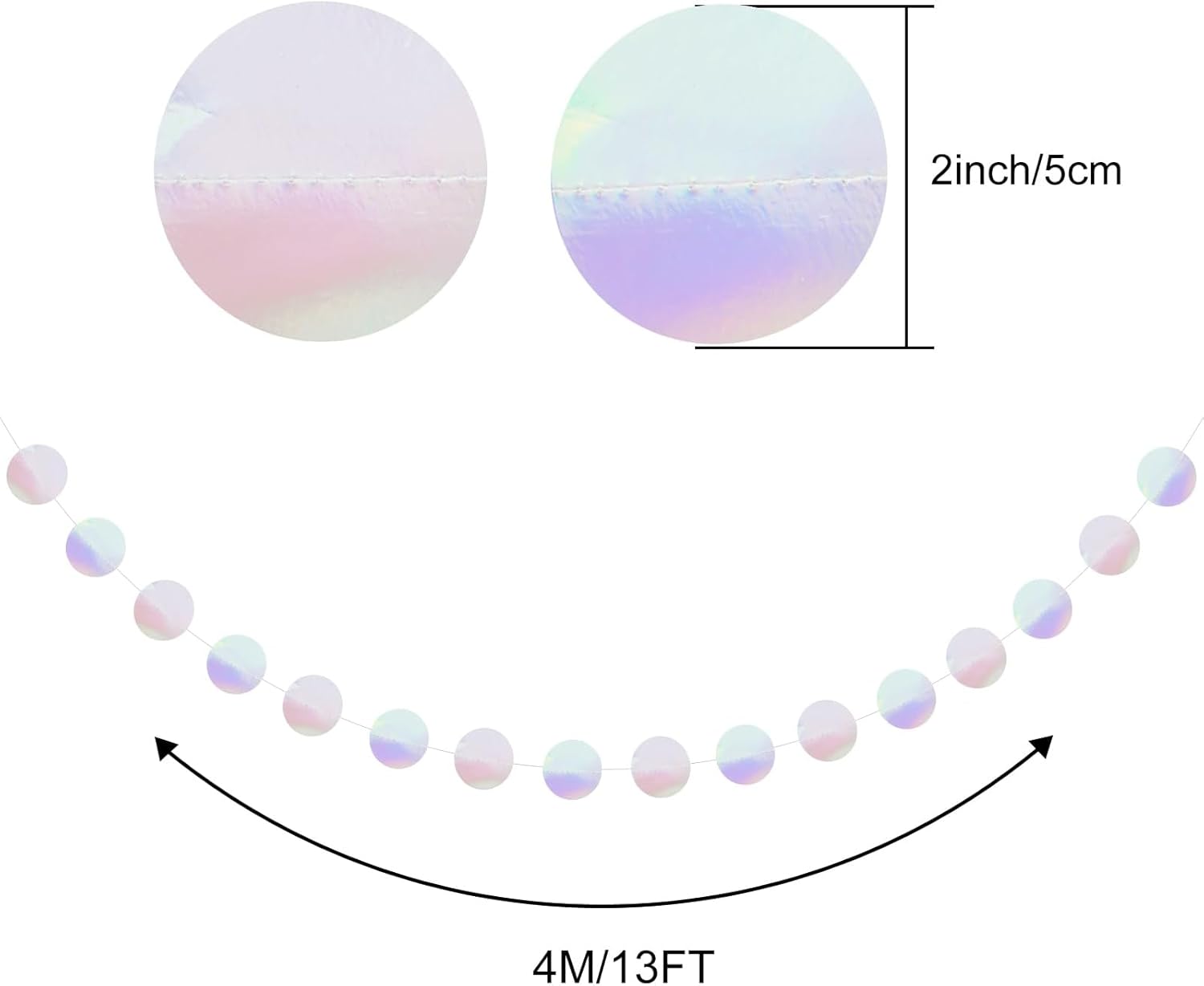 Materiale: Realizzata in carta ecologica di alta qualità, la ghirlanda presenta un design glitterato su entrambi i lati con una superficie liscia e riflettente che brilla nei colori dell'arcobaleno alla luce. Dimensioni: questa ghirlanda di conchiglie è composta da 6 fili di scintillanti stelle filanti rotonde, ciascuno lungo 4 metri, con 56 punti luccicanti (diametro di 5 cm). Ideale per feste di compleanno, feste a tema o decorazioni per la casa: crea un'atmosfera da sogno e festosa per ogni occasione. Durevole e riutilizzabile: realizzata in materiale durevole, atossico e inodore, questa ghirlanda è durevole e riutilizzabile, rendendola una scelta sostenibile per le decorazioni delle feste. Adatto a case, asili nido, matrimoni e altro ancora, è un must per un'atmosfera di festa vivace. Facile da usare: ogni ghirlanda è lunga 4 metri e può essere facilmente regolata per adattarsi al tuo spazio. Che si tratti di pareti, finestre, soffitti o alberi, è facile da installare e trasforma istantaneamente qualsiasi area in un festoso paese delle fate. Versatile: perfetta per feste subacquee, compleanni, matrimoni, lauree, festeggiamenti di Capodanno e altro ancora, questa ghirlanda aggiunge un tocco di magia agli eventi per adulti e bambini