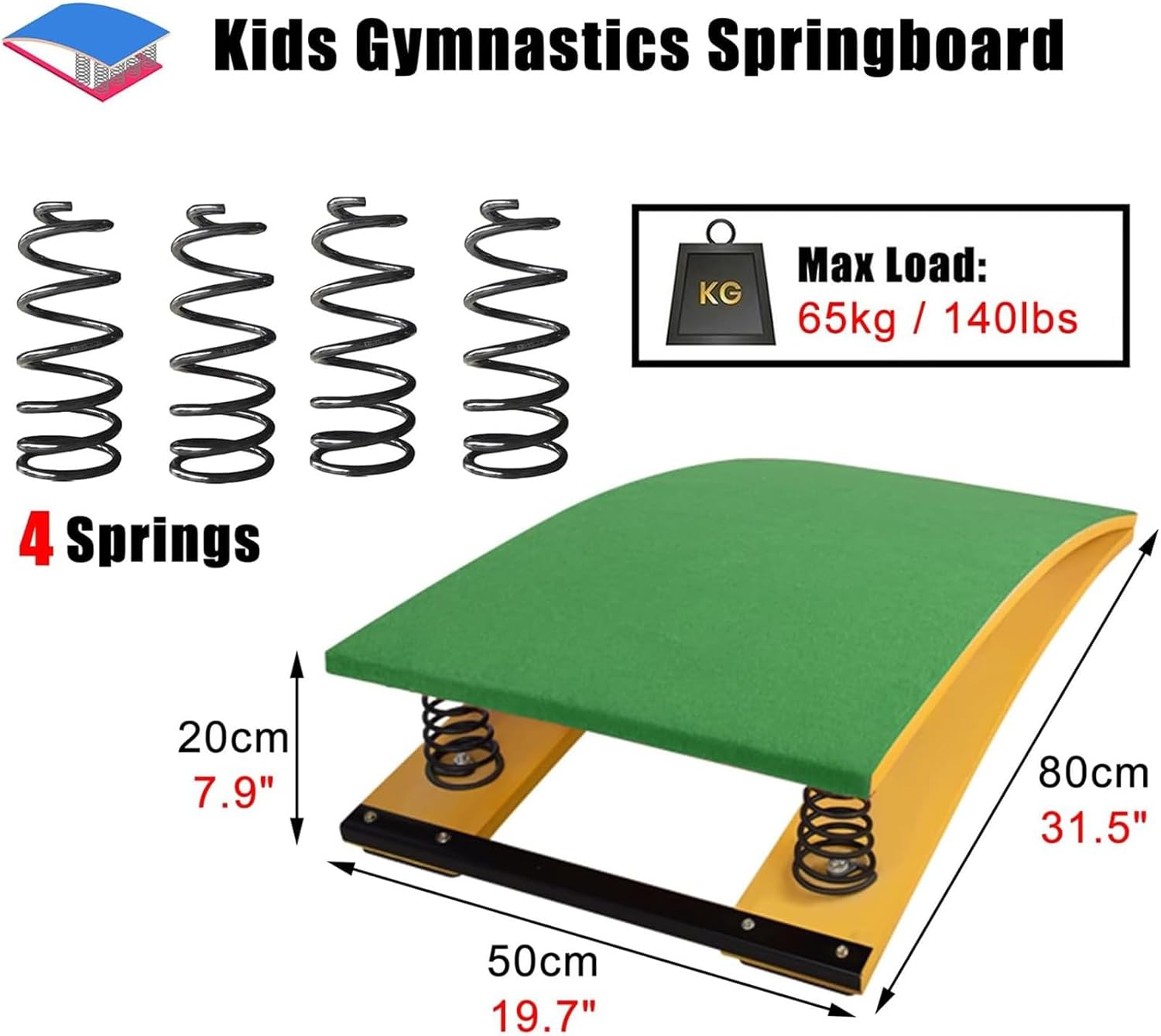 【Trampolino Junior per Giovani Ginnasti】: Progettato per i ginnasti in erba, questo trampolino è la scelta ideale per i bambini che vogliono perfezionare le proprie abilità a casa. Il suo design versatile lo rende perfetto per salire sulle barre e praticare le discese. Con una capacità di carico massima di 65 kg/140 libbre, offre un supporto affidabile. 【Trampolino da ginnastica】Il trampolino da ginnastica è un ausilio per il salto negli eventi di volteggio, utilizzato per migliorare le abilità di salto, esercitarsi nello sbarco e nell'atterraggio, nell'arte sportiva e nello stretching. Il trampolino aiuta gli atleti ad aumentare l'altezza del salto e supporta i movimenti tecnici complessi negli sport aerei. 【Attrezzatura da ginnastica robusta e durevole】I nostri trampolini sono realizzati con assi di legno duro, feltro antiscivolo sulla superficie, molla in acciaio al manganese ispessita all'interno, forte capacità portante, nessuna deformazione, nessuna piastra in acciaio antiruggine fissata. In qualsiasi condizione atmosferica, adatti per interni ed esterni. 【Quattro molle ad alta elasticità】: Progettato con quattro robuste molle caratterizzate da eccezionale elasticità e resilienza, questo trampolino offre un'esperienza sicura e duratura. Queste molle ad alta resistenza offrono un supporto superiore, consentendo un utilizzo ottimale per varie routine di ginnastica. 【Feltro antiscivolo】La superficie del trampolino è rivestita in feltro antiscivolo e resistente all'usura, che consente ai piedi di mantenere una buona presa durante il salto, ed è sicuro e anticaduta, proteggendoci il più possibile dagli infortuni. Non pungerà i piedi anche se sei a piedi nudi.