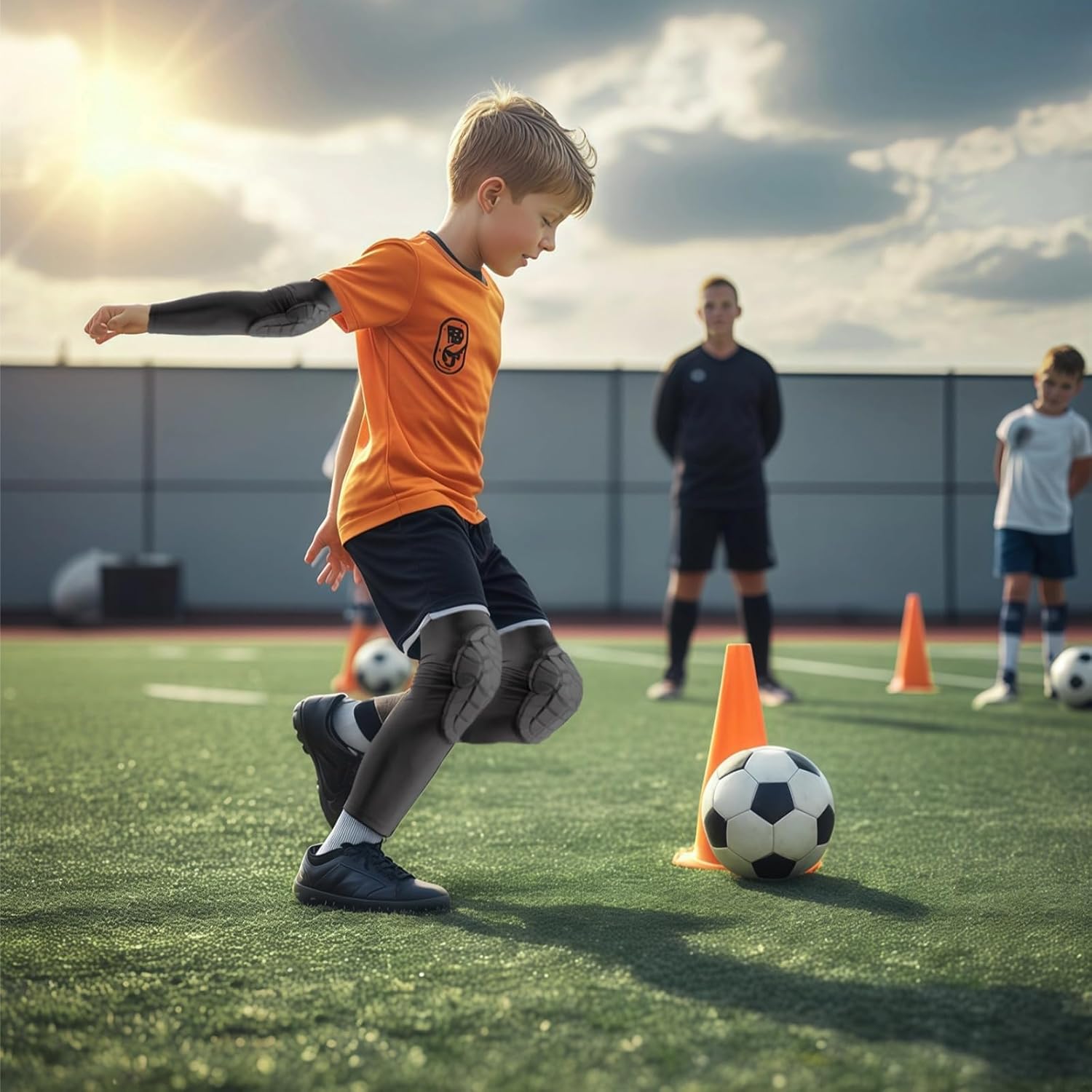 Tessuto ventilato: offre comfort e circolazione dell'aria attraverso un mix di 82% poliestere e diciotto percento di spandex; rimane fresco e privo di umidità durante gli sforzi impegnativi; eccellente per il calcio e la partecipazione atletica Protezione EVA durevole: la sostanza EVA ad alta resilienza offre tolleranza agli urti; difende ginocchia e gomiti da cadute e traumi; adatto per sport rigorosi e attività attive Funzione di presa stabile: include gel di silicone antiscivolo; impedisce ai cuscinetti di scivolare mentre sono attivi; offre una presa salda per corsa, ciclismo e altro ancora Protezione completa: la configurazione del cuscinetto a maniche lunghe fornisce una protezione totale; protegge da abrasioni e scuoiatura; aumenta la sicurezza negli sport esterni Taglie incentrate sul bambino: disponibile in dimensioni S, M, L, XL; modellato esclusivamente per utenti più giovani; il contorno aderente consente agilità e adattabilità sfrenate; adatto per numerosi usi atletici
