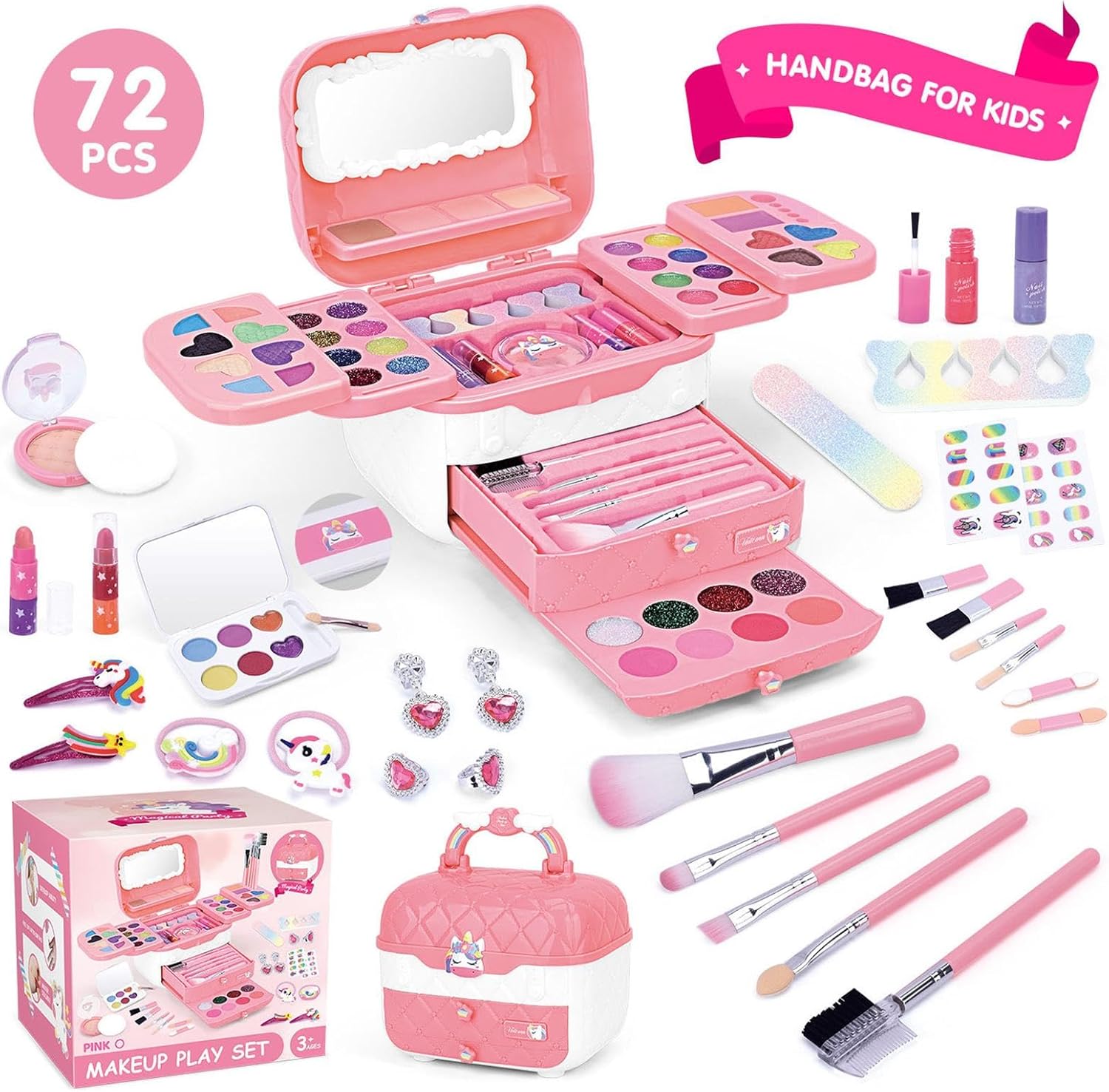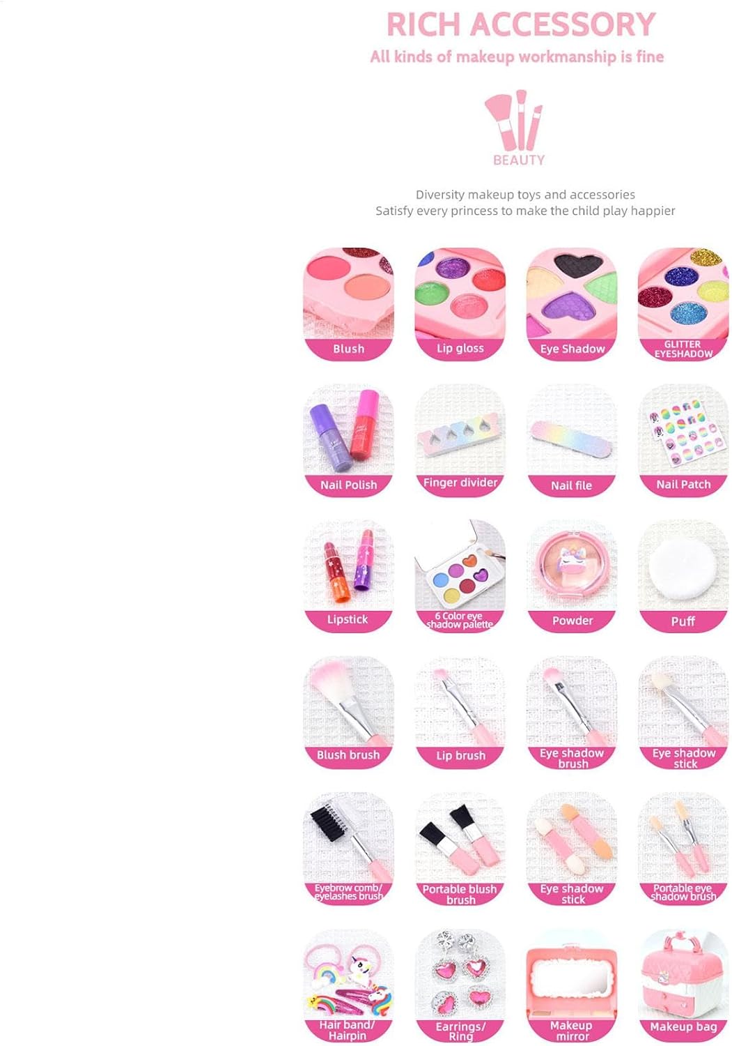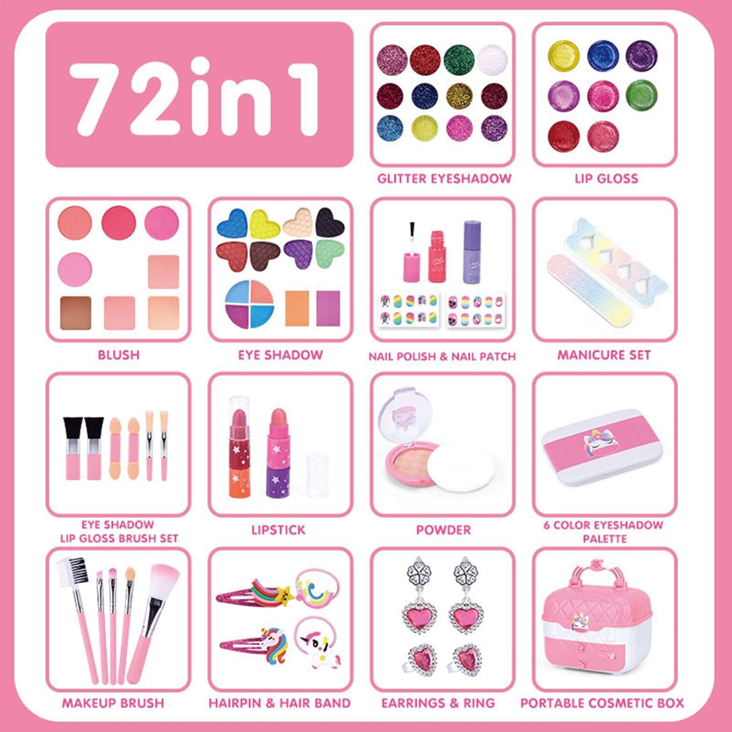 Promuovere la crescita artistica: incoraggiare la creatività e l'intrattenimento, aiutare a sviluppare l'immaginazione dei bambini, esprimere il loro fascino unico e migliorare le capacità motorie, promuovendo in definitiva i loro interessi e abilità. Promuovi l'unità familiare: con il nostro set di trucchi, costruire forti legami tra genitori e figli non è mai stato così facile. Goditi del tempo di qualità insieme migliorando l'interazione genitore-figlio e coltivando un interesse comune Facile da pulire: attribuiamo grande importanza alla sicurezza di tuo figlio con il nostro set per il trucco, realizzato con materiali sicuri e delicati sulla pelle. Puoi stare tranquillo perché questo set garantisce igiene e si lava facilmente con acqua, facilitando la pulizia. Comodo da trasportare: il nostro set per il trucco offre una soluzione conveniente per conservare e accedere a tutti i prodotti indispensabili per il trucco di tuo figlio. Questo innovativo set per il trucco viene fornito con una scatola portaoggetti dal bellissimo design, uno specchio e una maniglia, che lo rende perfetto per l'uso all'aperto o a casa per risparmiare spazio. Regalo meraviglioso: lascia risplendere il truccatore interiore di tuo figlio con il nostro set per il trucco. Questa attività di gioco sicura e divertente è una perfetta introduzione al trucco e un regalo perfetto per le ragazze che amano sperimentare colori e stili diversi