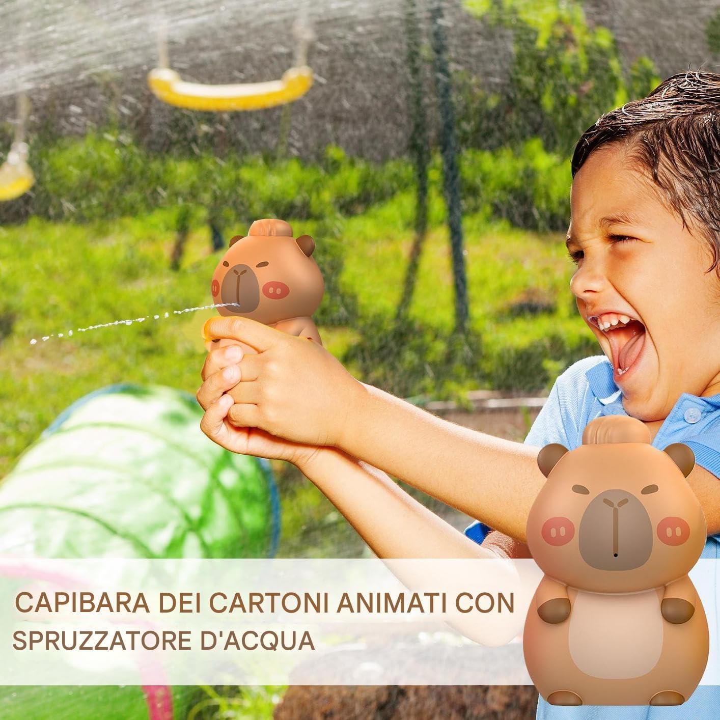 Portabilità Ottimale: Formato compatto e peso ridotto garantiscono trasporto agevole, abbinati a serbatoio d'acqua bilanciato che sostiene sessioni di gioco vivaci senza fatica, ideale per spiagge e parchi. Meccanismo Acqua Nascosto:Design con idrico integrato che genera una delicata nebbiolina tramite piccoli fori, arricchendo il gioco con sorprese piacevoli e intrattenimento acquatico coinvolgente Materiali delicati:Costruzione conforme agli standard sicurezza, materiali morbidissimi e non irritanti, bordi perfettamente lisci e assemblaggio sicuro per un utilizzo privo di rischi da parte dei bambini. Companion : Progettati per scherzi in compagnia, divertimento familiare e momenti estivi memorabili, sono alleati ideali per lezioni di nuoto e attività ricreative in giardino Divertimento Assicurato: Rallegra i bambini con giocattoli spruzzo giocosi che mostrano un tenero capibara cartoon, realizzati per una facile presa e attività acquatiche estive piene di gioia