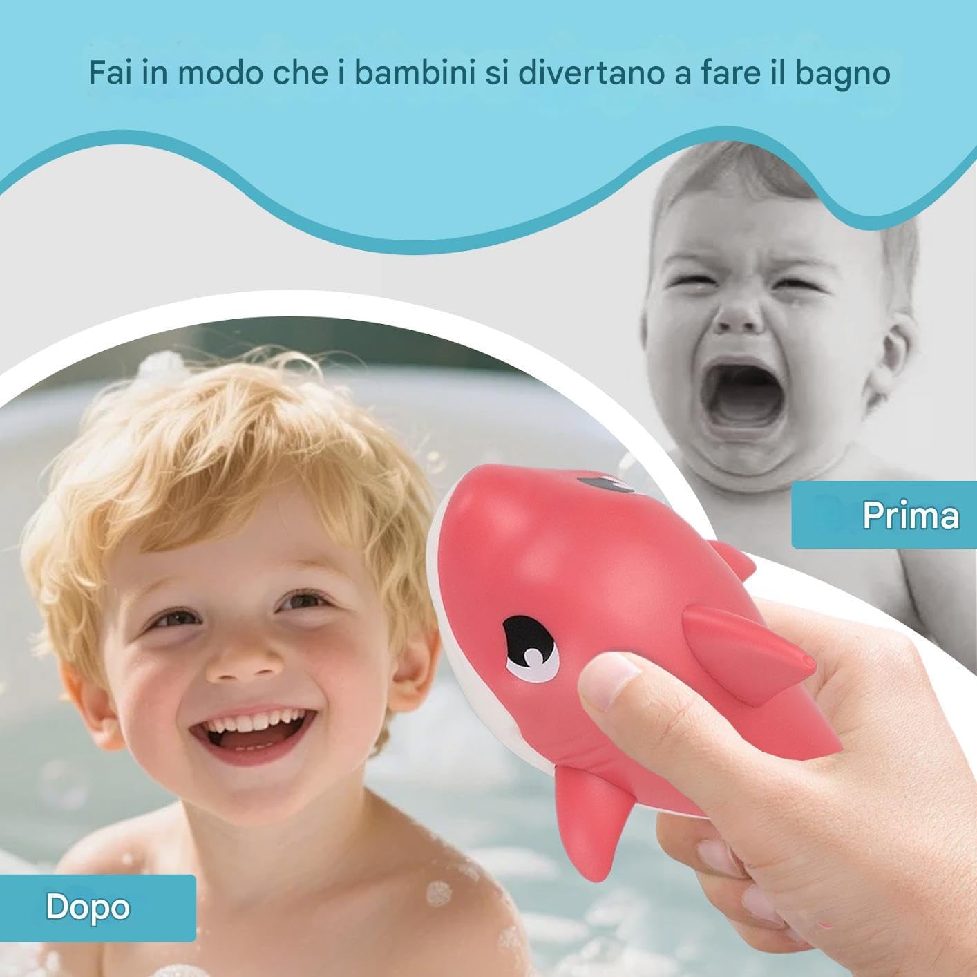 Divertimento immediato: Carica facilmente il giocattolo con una rotazione, poi rilascialo in acqua per vederlo . Aggiunge allegria alla routine del bagnetto con un funzionamento alla portata di tutti. Qualità Premium: Realizzato con materiali durevoli atossici resistenti all'acqua. Facile da pulire e asciugare rapidamente mantenendo brillanti i colori dopo ogni utilizzo per una lunga durata nel Compagno di Giochi: La giocosa dello squalo intrattiene il bebè durante il bagnetto, offrendo intrattenimento senza fine. Permette ai bambini di esplorare la gioia degli schizzi e del gioco in acqua mentre scoprono il divertimento nel momento della pulizia quotidiana. Materiale Pregiato: Costruiti in ABS di prima scelta, questi giocattoli da bagno offrono perfetta robustezza e durevolezza di lunga durata, garantendo funzionalità affidabile anche dopo ripetuti utilizzi nel Utilizzo versatile:Ideale per piscina vasca da bagno o doccia domestica questi giochi da bagno offrono ampia versatilità per intrattenere i bambini in diversi ambienti acquatici garantendo momenti di gioco felici e coinvolgenti durante il bagnetto o attività acquatiche domestiche