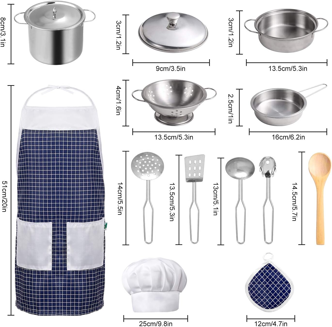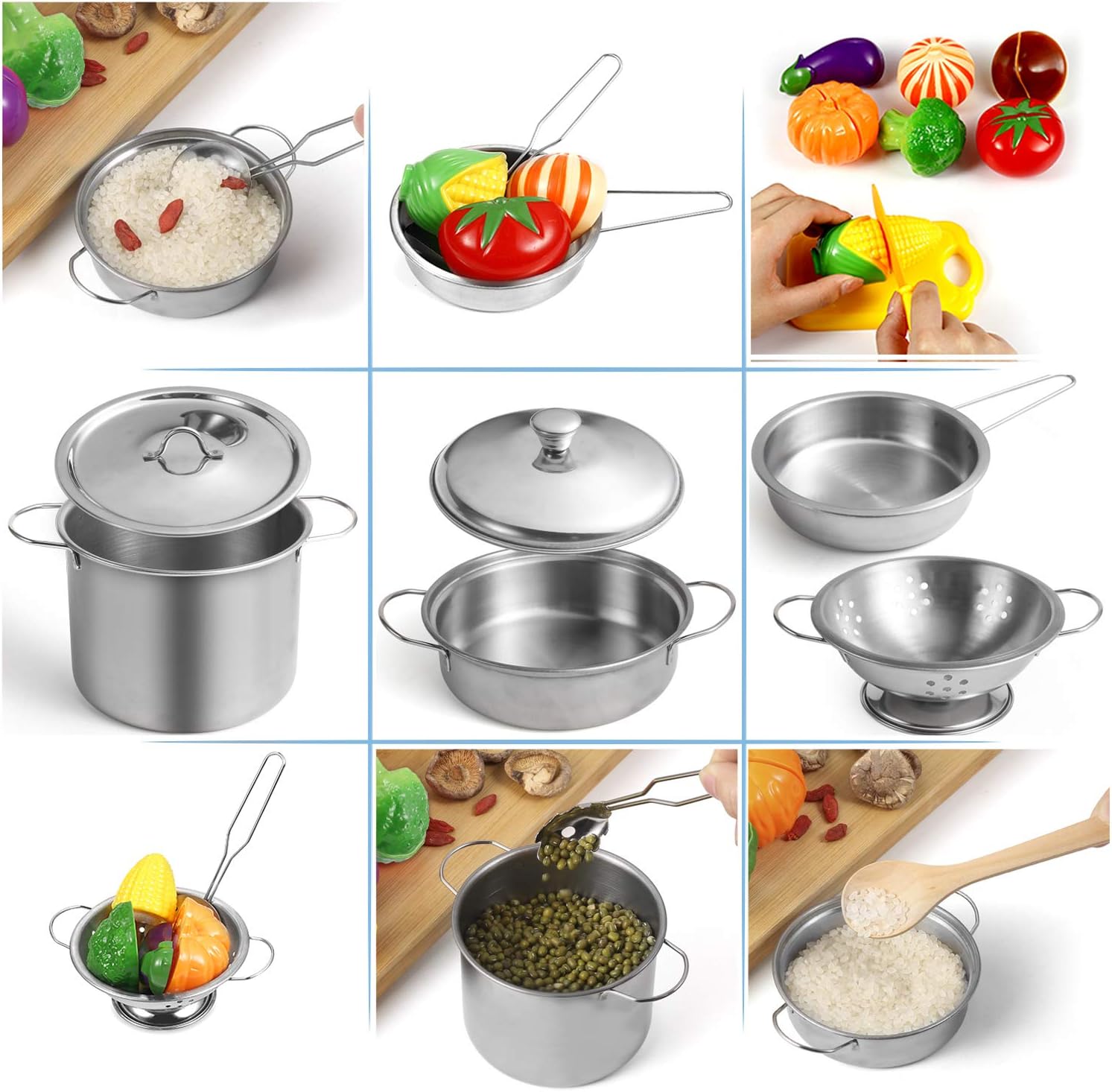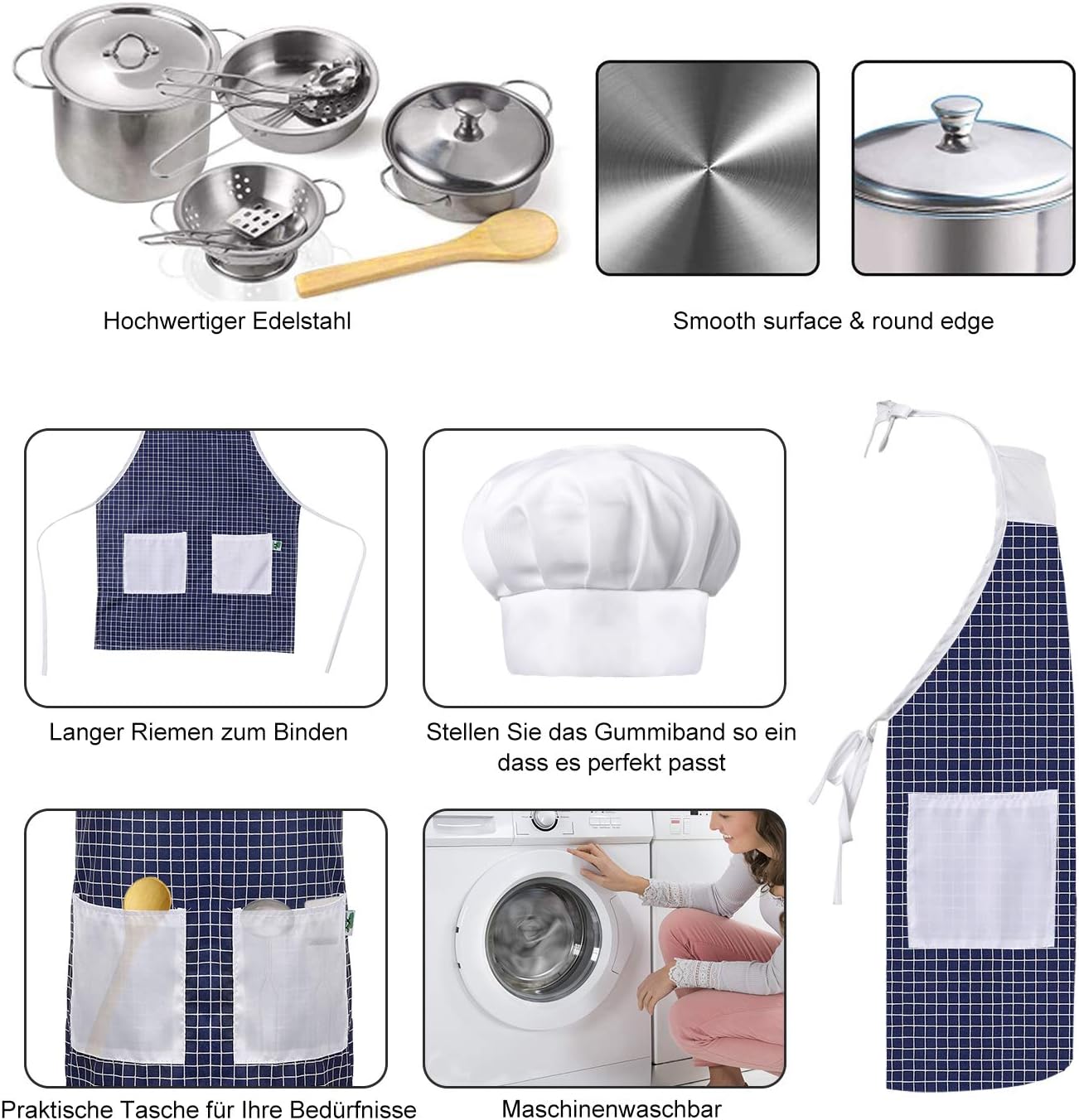 ✅ ACCESSORI COMPLETI PER LA CUCINA GIOCATTOLO - I pezzi totali 23 includono: uno scolapasta, pentole e padelle in acciaio inossidabile con coperchio e manici, 4 utensili in acciaio inossidabile e in legno, grembiule e cappello da cuoco, presina e giocattoli per tagliare le verdure. ✅ SET CAPPELLO E GREMBIULE DA CUOCO PER BAMBINI - Il grembiule da cuoco è blu navy con strisce bianche semplici e generose, il cappello da cuoco è bianco e fascia elastica regolabile per adattarsi perfettamente alla testa di un bambino. ✅100% SICURO e non tossico. I giocattoli degli accessori del set da cucina per bambini sono realizzati in metallo e plastica in acciaio inossidabile di alta qualità. Testato per essere sicuro per i bambini. Riutilizzabile e facile da pulire. Può essere utilizzato per il giocattolo educativo, il giocattolo sensoriale, fa sembrare una vera affettatura quando si taglia Finta di giocare, per creare un'atmosfera realistica per i bambini mentre giocano. ✅ GIOCATTOLO DIVERTENTE E EDUCATIVO - Il gioco di ruolo per i bambini è estremamente importante. Permette alla loro immaginazione di correre libera. Il set di accessori per la cucina del gioco ispira i bambini ad assumere il ruolo di uno chef, insegna loro alcune semplici abilità culinarie, passeranno felicemente ore a preparare finti "pasti" per la famiglia! ✅ REGALO MIGLIORE - Il giocattolo da cucina per bambini è il migliore per feste di compleanno, festival e festività (festa dei bambini, Natale, Halloween, Ringraziamento e Capodanno). Fai un regalo a tuo figlio che crea infiniti momenti felici!