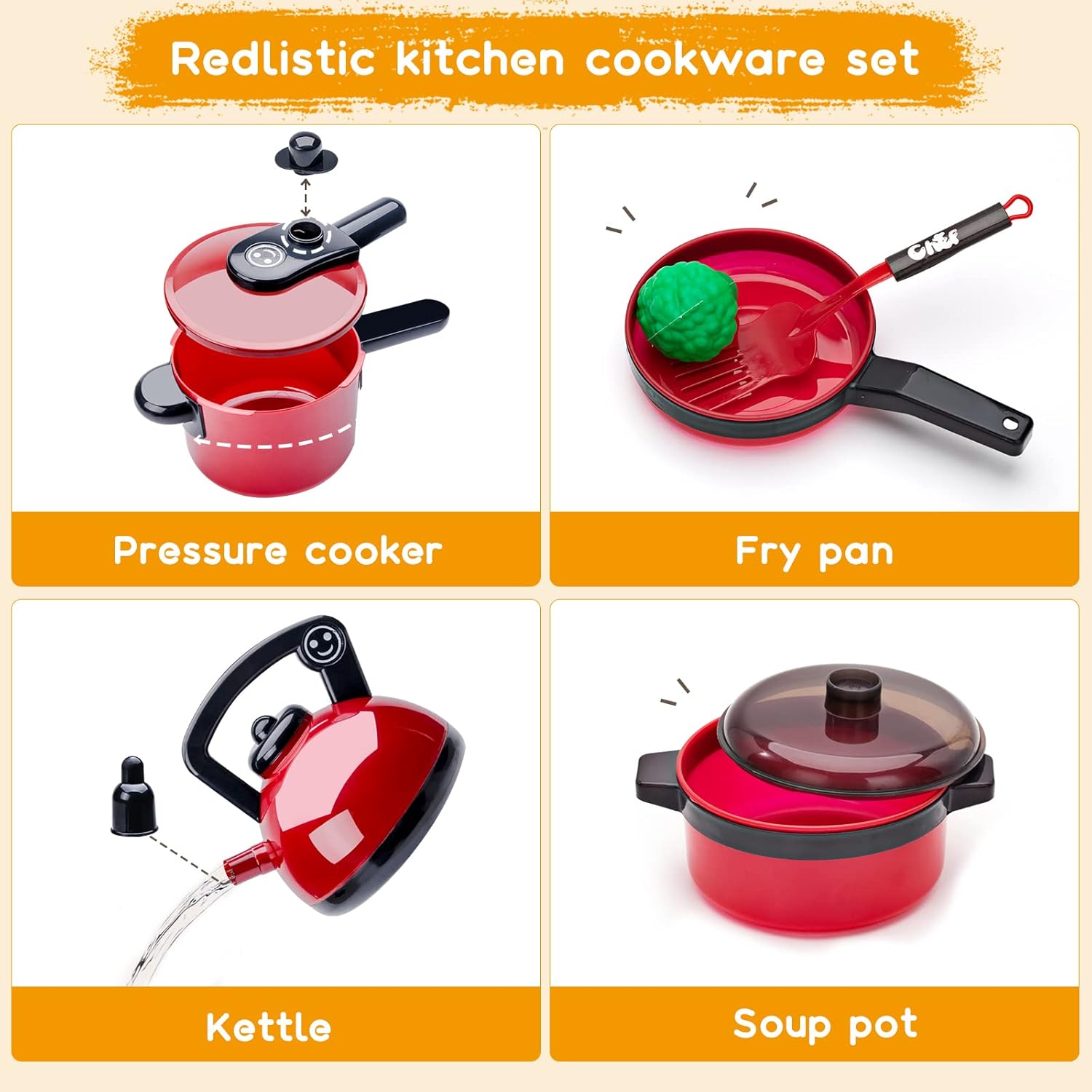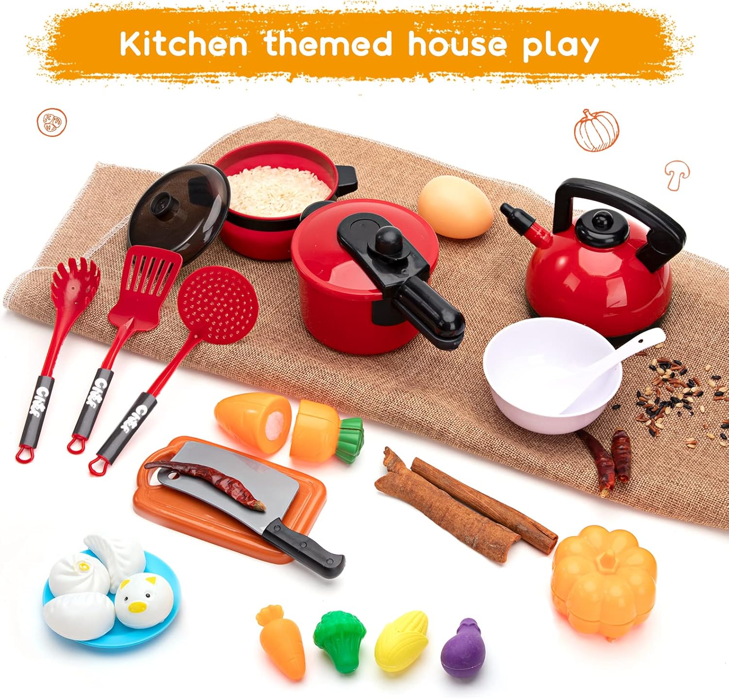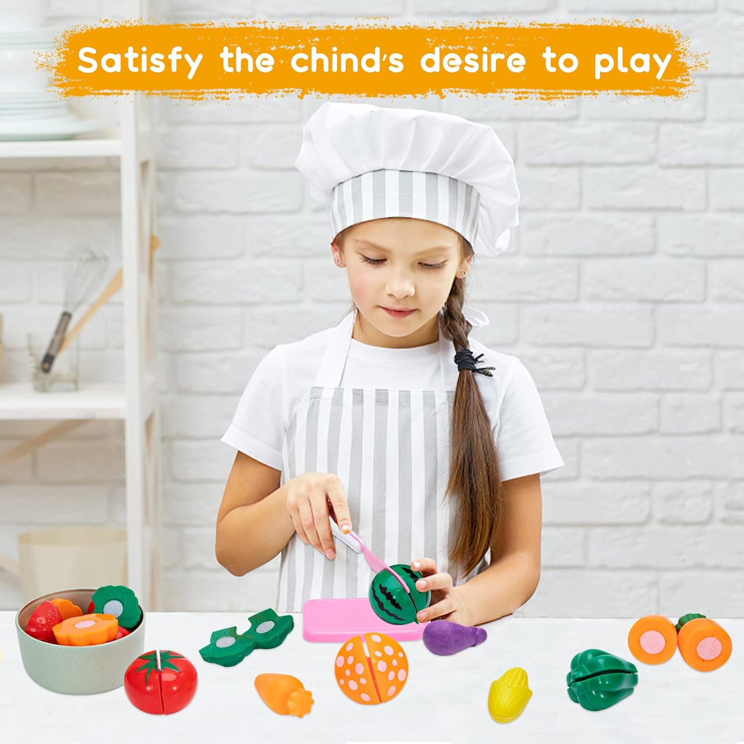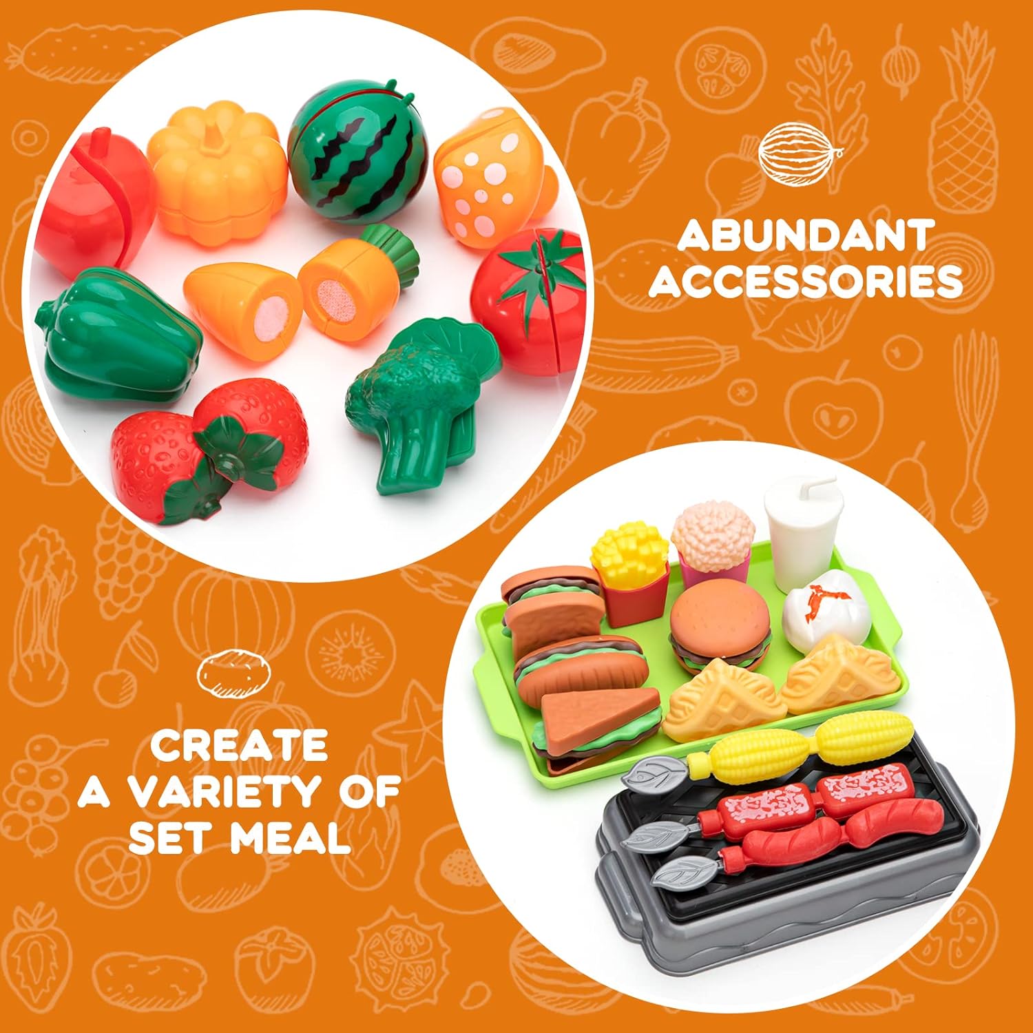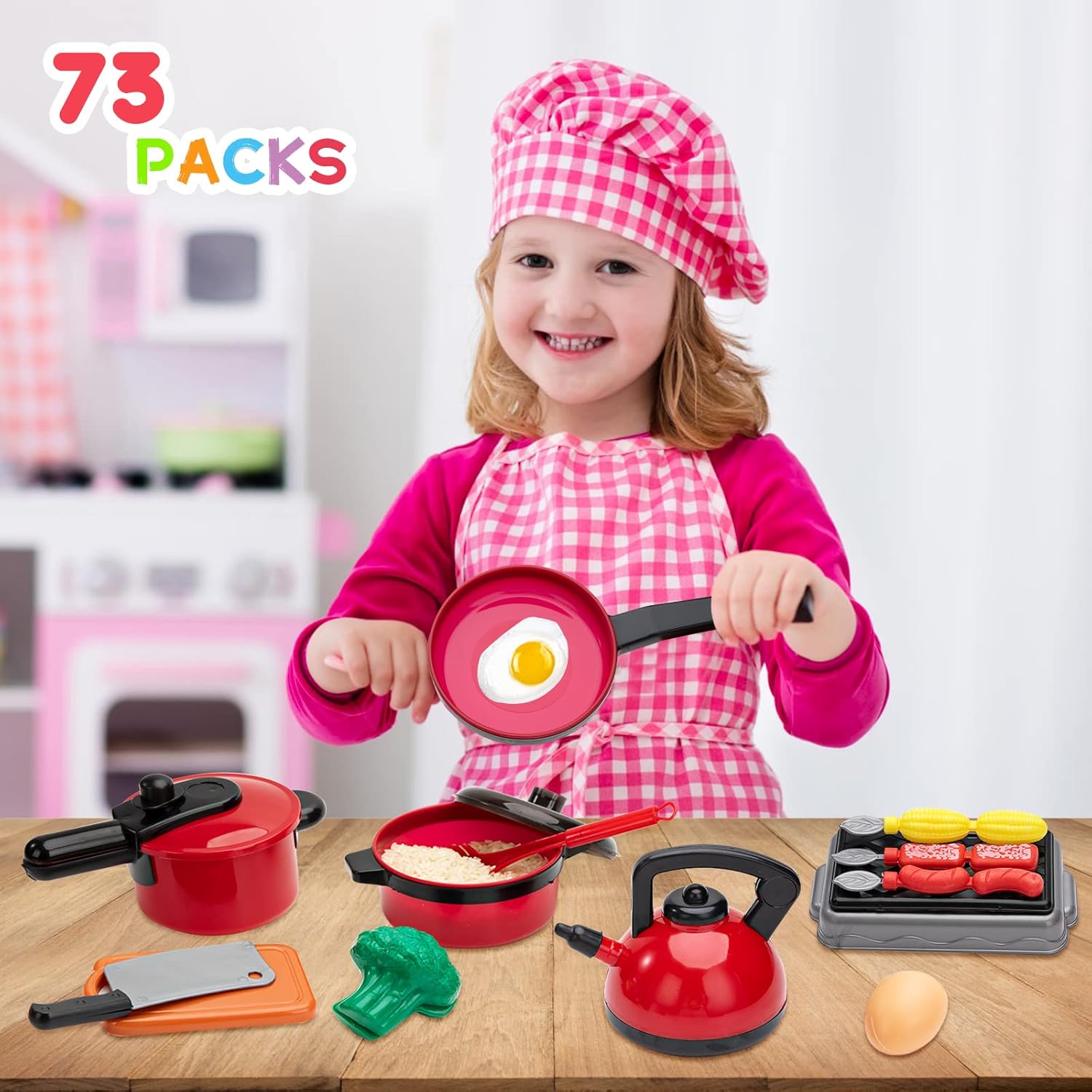 Playset di pentole e padelle - Set di 73 pezzi di accessori da cucina giocattolo che comprende un piatto, piatti, tazze, pentole e padelle, utensili da cucina, posate (forchette, coltelli e cucchiai) e verdure da taglio per la frutta; tutto è pronto per il piccolo chef che deve preparare un banchetto domestico immaginario. Giocattolo da cucina - Viene fornito con vari alimenti colorati, utensili e pentole. Perfetto per il gioco di finzione dello chef di cucina, il gioco di ruolo, il giocattolo educativo prescolare, il giocattolo sensoriale, lo sviluppo precoce, un grande regalo per ragazze e ragazzi dai 3 anni in su. Taglio e sbucciatura - Il playset della cucina finta include coltelli da cucina giocattolo e tagliere, in modo che il gioco di taglio di frutta e verdura permetta di essere affettato. Inoltre, l'uovo e il mais possono essere sbucciati per offrire un'esperienza realistica e un divertimento senza fine ai vostri bambini. Giocattolo realistico - Una varietà di alimenti da taglio (zucca, carota, mais, fragola, cavolfiore e fungo, ecc.) sono splendidamente dipinti con dettagli vivaci, le metà delle verdure si collegano tramite chiusure adesive e si staccano facilmente quando il bambino taglia e affetta. Super Value Pack - Ideale per ragazza e ragazzo / bambini / bambino / regalo di Natale. cibo finto giocattolo per i più piccoli, premio classe prescolare, bambini intelligente giocattoli di apprendimento, Pasqua Stuffer, Baby Holiday, festa di compleanno o di ringraziamento e altro ancora.