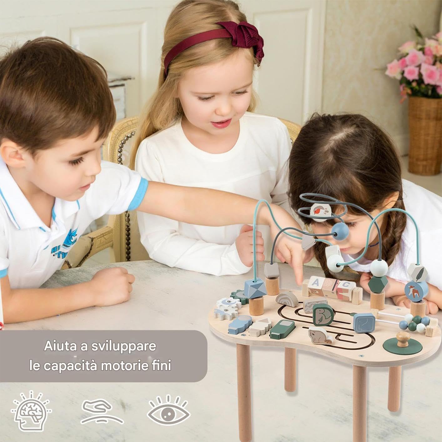 Artigianato liscio e resistente: progettato con bordi sicuri lisci e realizzato in legno naturale, questo tavolo utilizza vernice a base d'acqua per fornire un luogo endente che garantisce prestazioni durature insieme a una finitura lucida per bambini per un uso senza preoccupazione Durabilità a zampe: questa tabella di attività incorpora un gruppo a vite che mantiene componenti fissi in modo sicuro ed elimina che vacilla attraverso la sua base stabile a gamba pensieamente progettata Supporto per lo sviluppo cognitivo: una tabella di attività coinvolgente realizzata per migliorare il coordinamento degli occhi e incoraggiare il gioco creativo, fornendo un'esperienza di apprendimento dello sviluppo che promuove il delle abilità motorie per i bambini durante il gioco Buono regalo: un tavolo di attività sensoriale ideale e sicuro per presentare una amata, mettendo in mostra la ponderazione migliorando il divertimento nei loro momenti quotidiani Opzioni di gioco interattive: fornisce abbinamento a forma, labirinto di binari, perle colorate, labirinto per tallone, scheda, di spin e ingranaggi rotanti per migliorare la creatività e le abilità cognitive in modo naturale