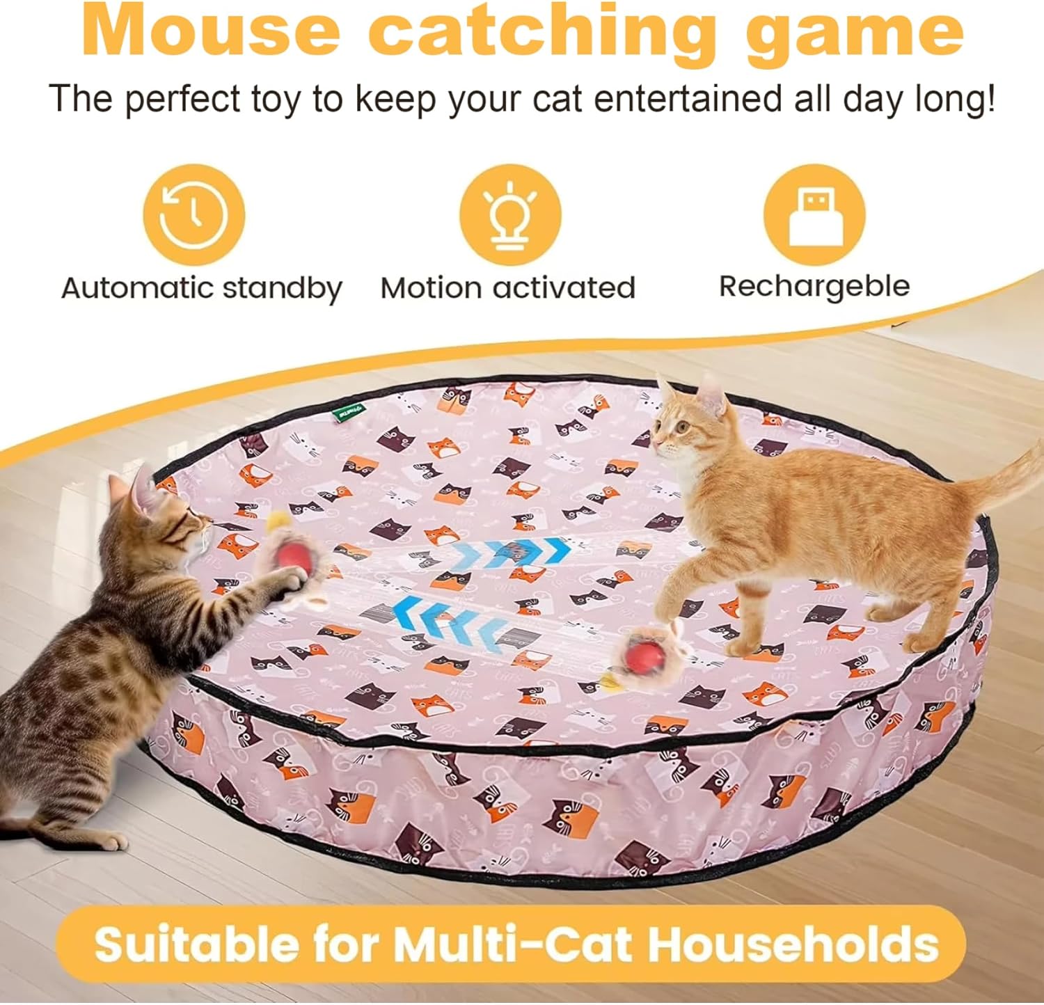 Ricaricabile ed ecologico: dotato di una batteria ricaricabile, il giocattolo elimina la seccatura e il costo di frequenti sostituti, rendendolo un'opzione sostenibile e conveniente per l'intrattenimento per gatti interni a lungo termine..La ricarica USB facile significa che è pronto ogni volta che è il tuo amico felino. Versatile per tutti i gatti: adatto a gatti di tutte le età e dimensioni, questo giocattolo di gatto interattivo migliora i riflessi e la vigilanza mentale..Il suo design compatto si adatta facilmente in vari spazi interni, fornendo divertimento indipendentemente dall'ambiente domestico. Attivazione del movimento automatico: la palla che rotola rapida si muove automaticamente e cambia direzione quando toccata, stimolando gli istinti di caccia naturali del tuo gatto e fornendo intrattenimento infinito senza intervento manuale..Questo garantisce che il tuo gatto interno rimanga attivo e impegnato anche quando sei occupato. Simulazione di caccia perfetta: progettato come un gatto nascondere e cercare giocattolo con una pallina che imita i movimenti rapidi di un topo, tocca il comportamento predatorio del tuo gatto, incoraggiando la caccia naturale e lo stalking, che promuove uno stile di vita sano e riduce lo stress alla noia. Design di mappeti da gioco interattivo: con un grazioso tappetino da gioco per gatti, questo giocattolo combina trame tattili con la palla rotolante per incoraggiare i gatti a balzare, scorrere e inseguire, migliorando l'esercizio fisico e la stimolazione mentale in un'area giochi compatta.