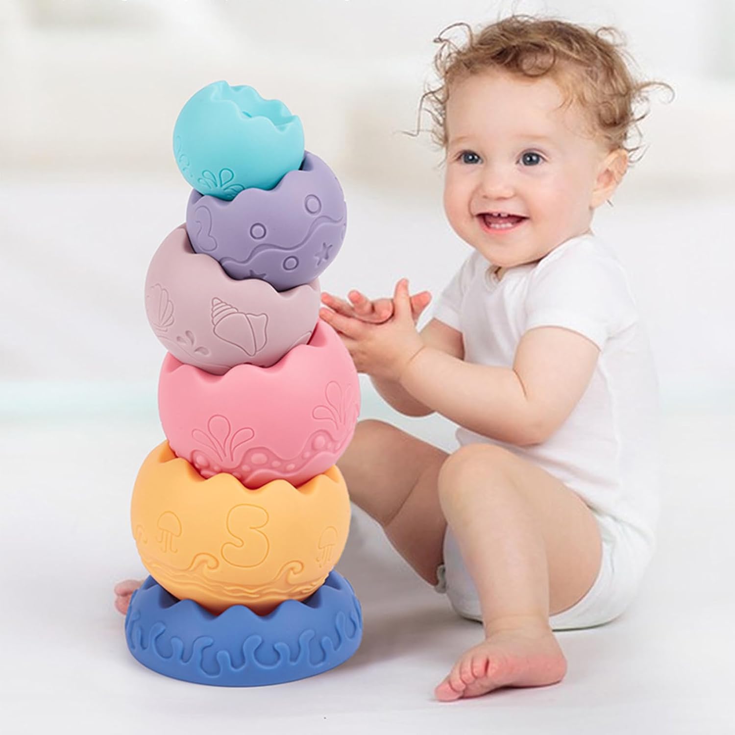 Sicurezza prima: gomma morbida di alta qualità con bordi arrotondati per garantire la sicurezza durante il gioco, con una copertura liscia e morbida. Il coperchio liscio e morbido migliora il comfort del tempo di gioco Riconosci diverse sfumature: con i suoi colori vivaci e ad alto contrasto, il nostro set di giocattoli impilabili è un ottimo aiuto visivo per loro mentre imparano a riconoscere diverse tonalità. Il nostro giocattolo aiuta a sviluppare la loro percezione dei colori e stimola la funzione del cervello visivo, offrendo un'esperienza divertente ed educativa Facile da afferrare: giocattoli impilamento fanno un ottimo strumento per migliorare la coordinazione occhio-mano. Con una facile maneggevolezza e dimensioni eccellenti e forma moderata, li afferreranno e impileranno in pochissimo tempo Migliora le capacità di risoluzione dei problemi: esercita abilità cognitive di tuo figlio. Coltiva la pazienza e le capacità di risoluzione dei problemi cercando di impilare gusci d'uovo di diversi colori o forme. Questa attività migliora anche l'equilibrio e la capacità cognitiva spaziale, promuovendo lo sviluppo cognitivo globale Promuovi il legame genitore-figlio: incorpora l'educazione precoce nel tempo di gioco con il nostro set di giocattoli impilabili. I genitori partecipano attivamente al gioco, migliorando la comunicazione emotiva e rafforzando il legame tra loro e il loro bambino
