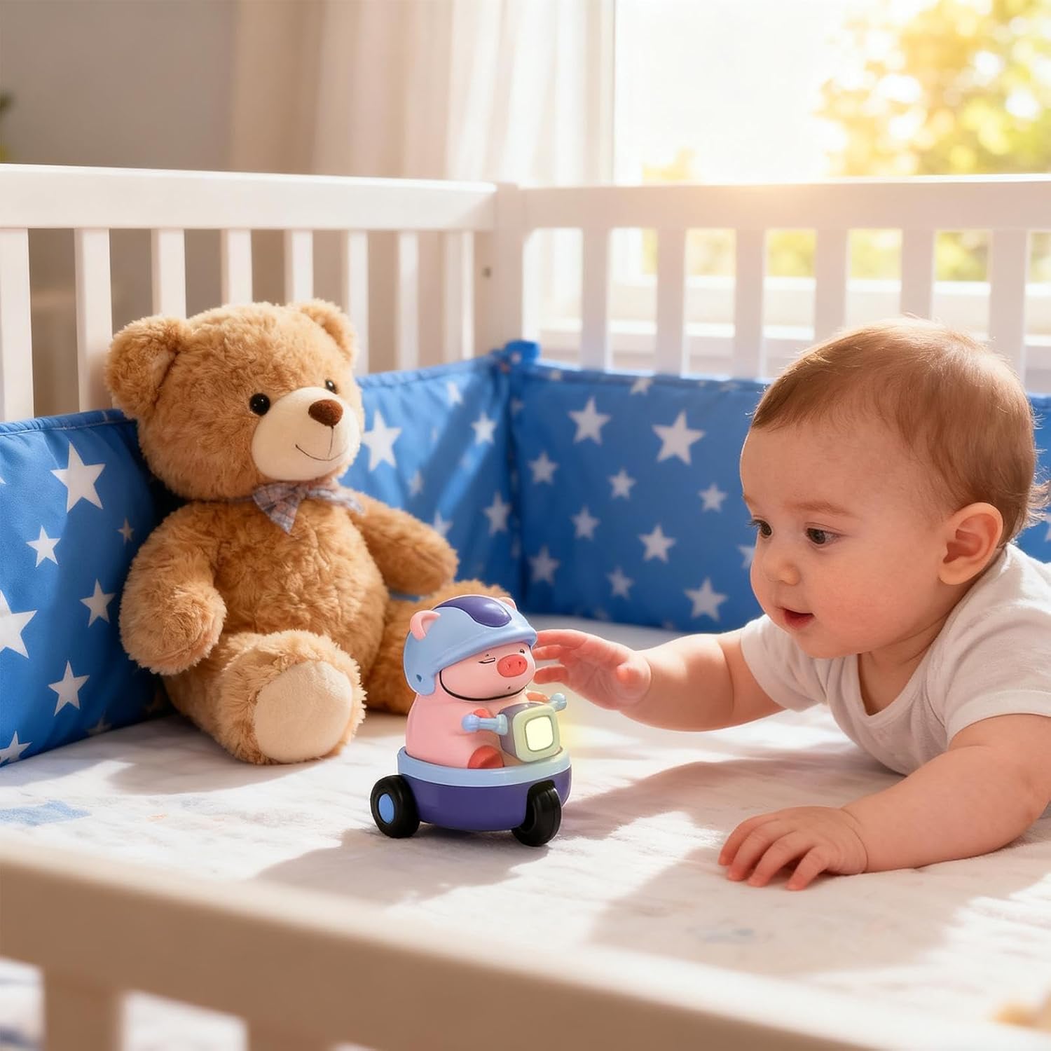 Intrattenimento Interattivo per Bambini: I giocattoli musicali per bambini utilizzano allegre filastrocche abbinate a luci e musica sincronizzate per coinvolgere i piccoli nella stimolazione uditiva. Questi giocattoli favoriscono la felicità emotiva attraverso melodie dolci durante l'esplorazione ludica o le attività familiari, supportando lo sviluppo sensoriale in modo divertente e educativo per e bambini. Incoraggia il Movimento Naturale: I giocattoli per gattonare stimolano l'istinto naturale di raggiungere e rotolare, supportando lo sviluppo motorio generale e aiutando il rafmento muscolare. Mentre i bebè interagiscono attivamente con il giocattolo durante il gioco supervisionato, questa attività favorisce movimenti spontanei che incrementano la coordinazione e la fisica in modo armonioso. Movimento Che Cattura l'Attenzione: I giocattoli per gattonare per bambini presentano un cutter rotante colorato e luci LED lampeggianti che generano punti focali visivi dinamici. Questi promuovono le abilità di tracciamento visivo mentre catturano l'attenzione del bambino durante il gioco sul pavimento, rendendo l'esperienza educativa e piacevole in ogni momento. Materiale Sicuro e Inodore: I giocattoli per bambini sono realizzati con materiali atossici e inodori, privi di sostanze nocive, garantendo massima sicurezza durante l'uso grazie all'assenza di tossine. Questo permette ai genitori di utilizzare i giocattoli con fiducia nelle routine quotidiane, come l'ora della nanna o le attività di sviluppo sensoriale, assicurando un'interazione piacevole e sicura per i durante il gioco. Sviluppo di Abilità Interattive: Questo giocattolo strisciante elettrico favorisce lo sviluppo motorio e potenzia la coordinazione occhio-mano, fornendo al bambino un modo gioioso di esplorare l'ambiente circostante. Si configura come strumento prezioso per l'educazione infantile completa durante le normali attività di gioco e di scoperta quotidiana.